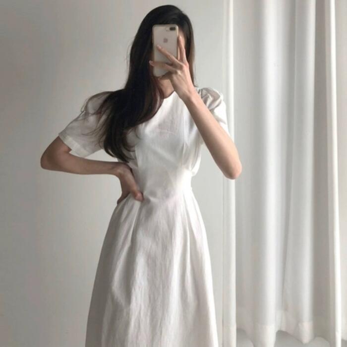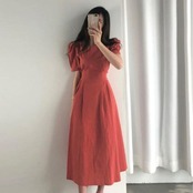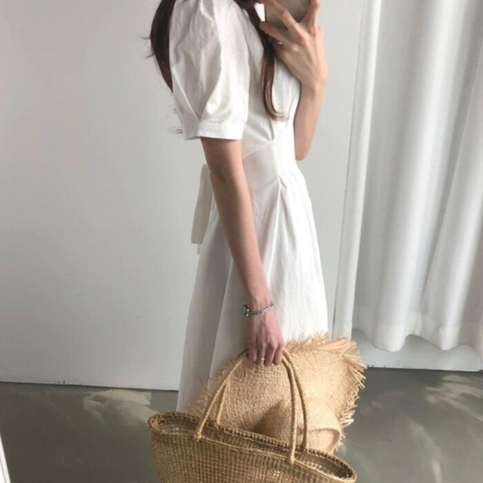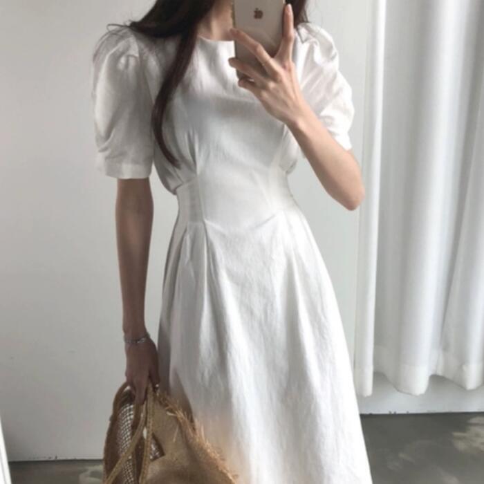 全2色 ワンピース ロングワンピ 袖あり パワーショルダー レディース きれいめ カジュアル ロング丈 おしゃれ 大人 可愛い ワンピ ドレス 半袖 フェミニン シンプル ウエストリボン レッド 赤 ホワイト 白 春 秋 夏 20代 30代 40代 50代