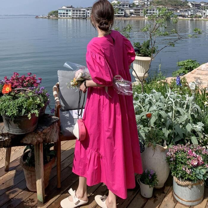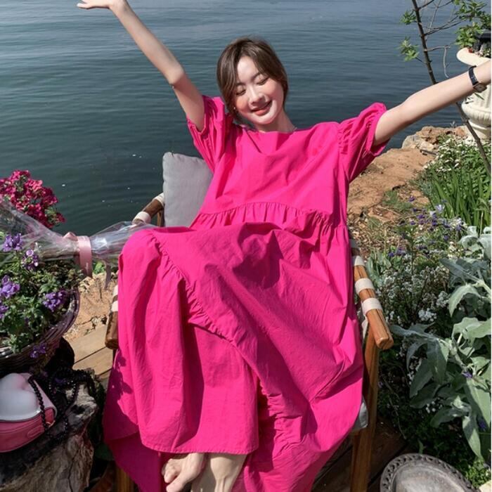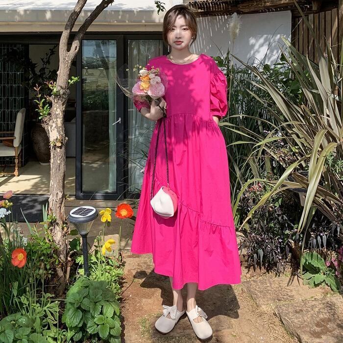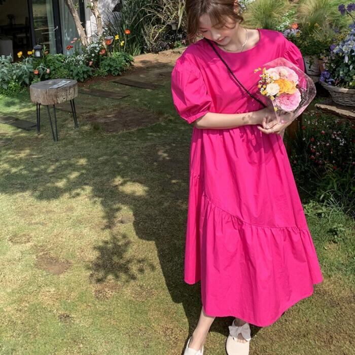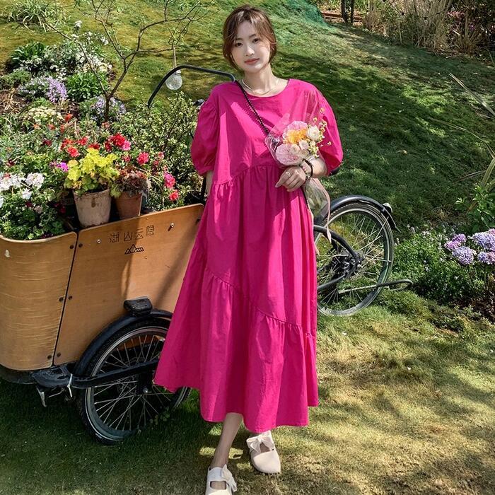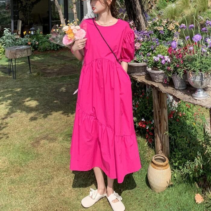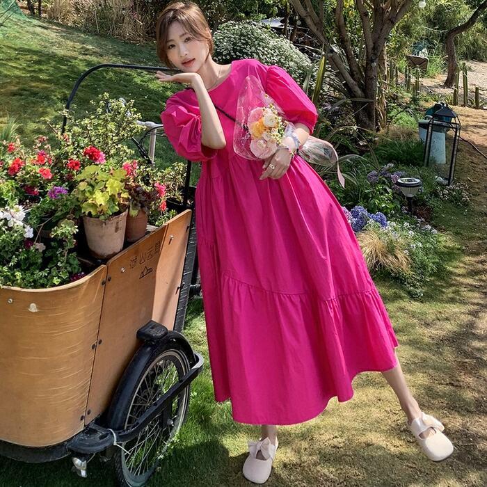 大きいサイズパフスリーブ ワンピース ロングワンピ 袖あり レディース きれいめ カジュアル ミモレ丈 フレア 切り替え おしゃれ 大人 可愛い ワンピ ドレス ティアード 半袖 フェミニン 体型カバー ゆったり ピンク 春 秋 夏 20代 30代 40代 50代
