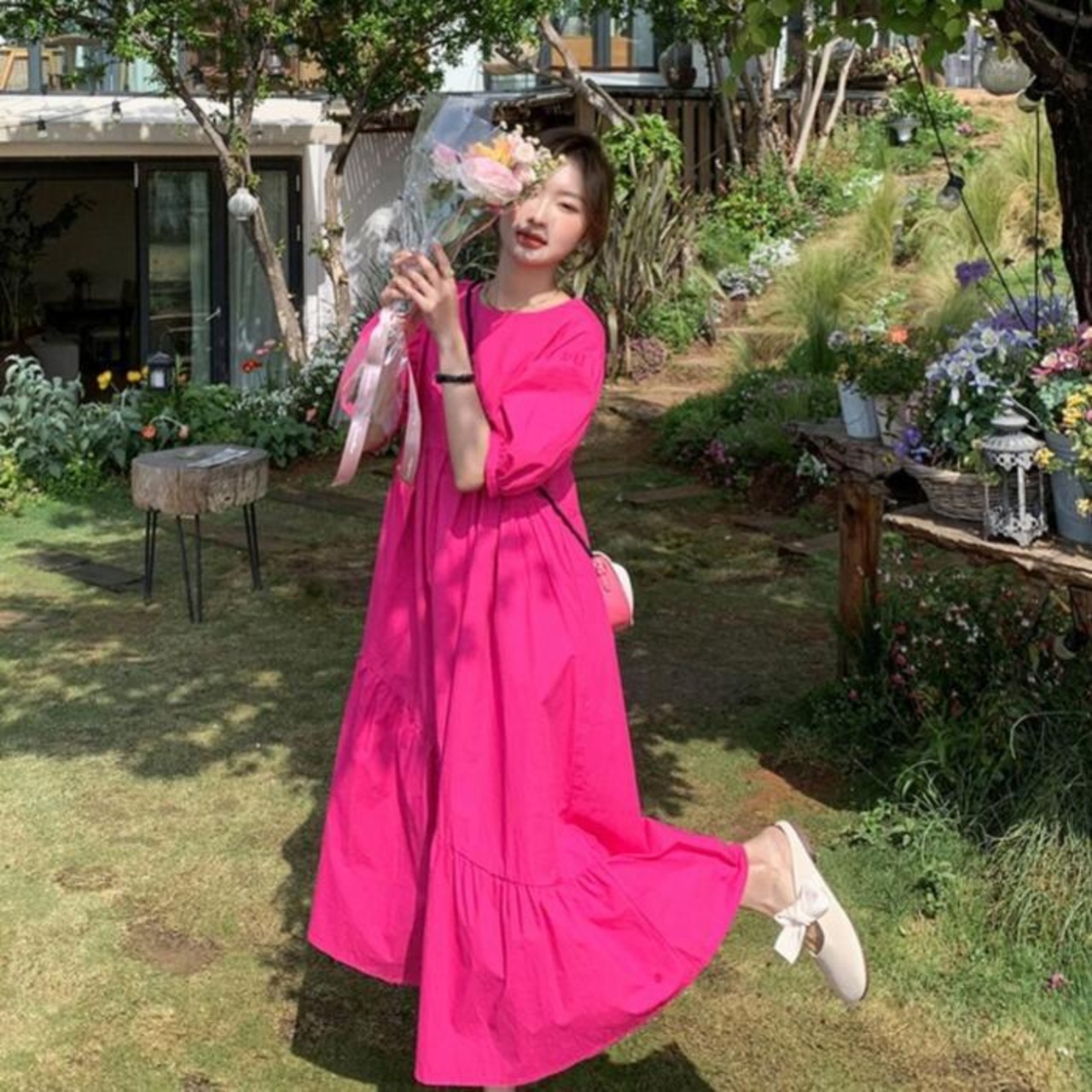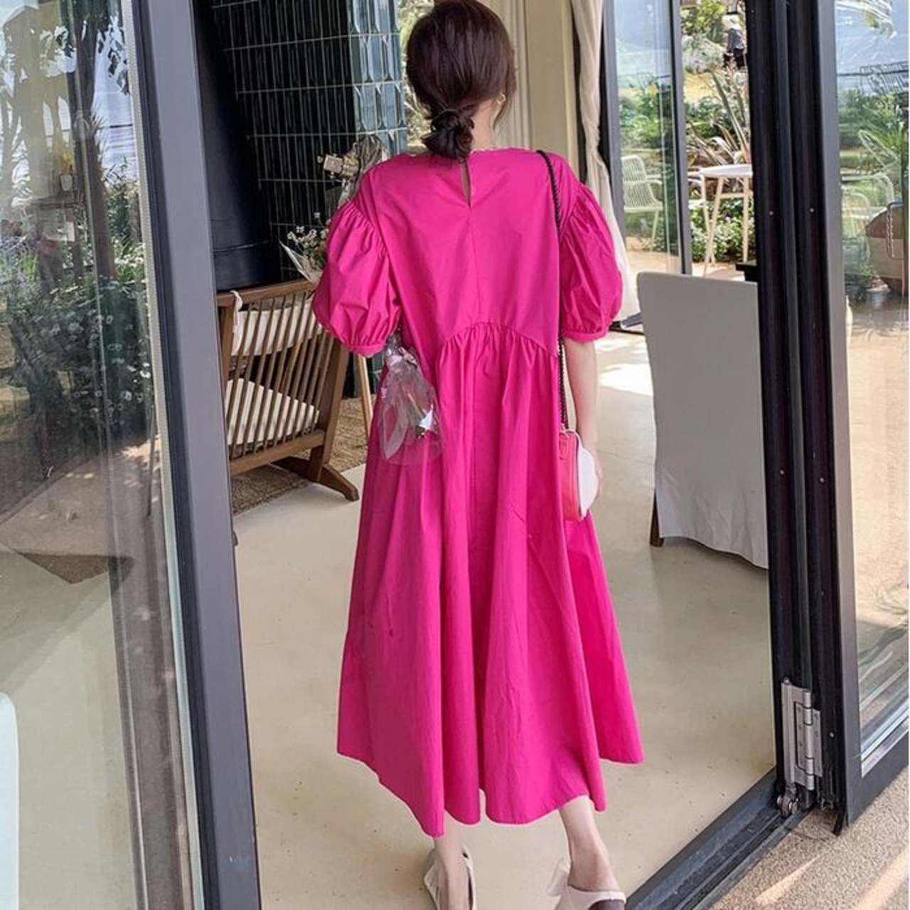 ビビッドなピンクカラーが目を惹くワンピース。