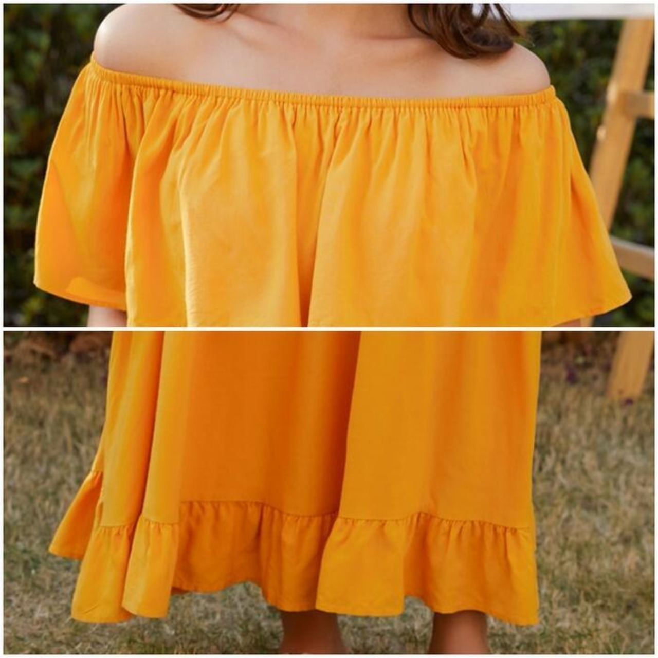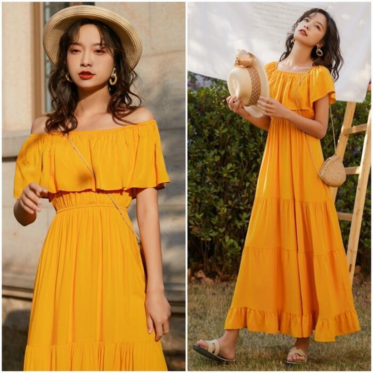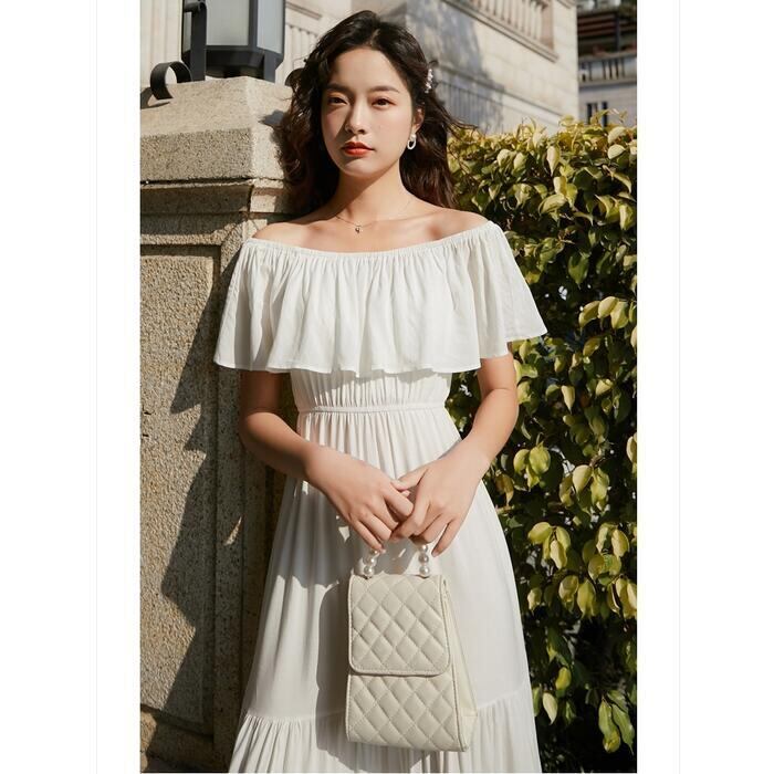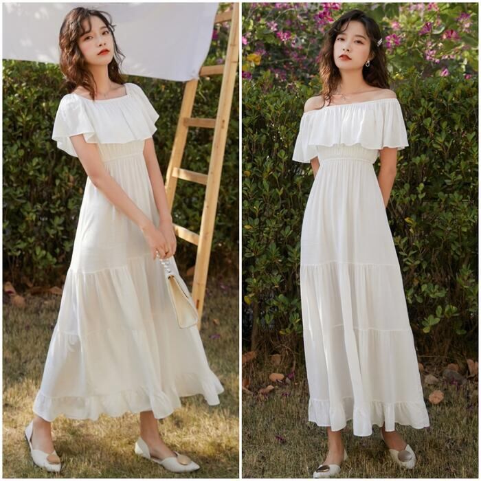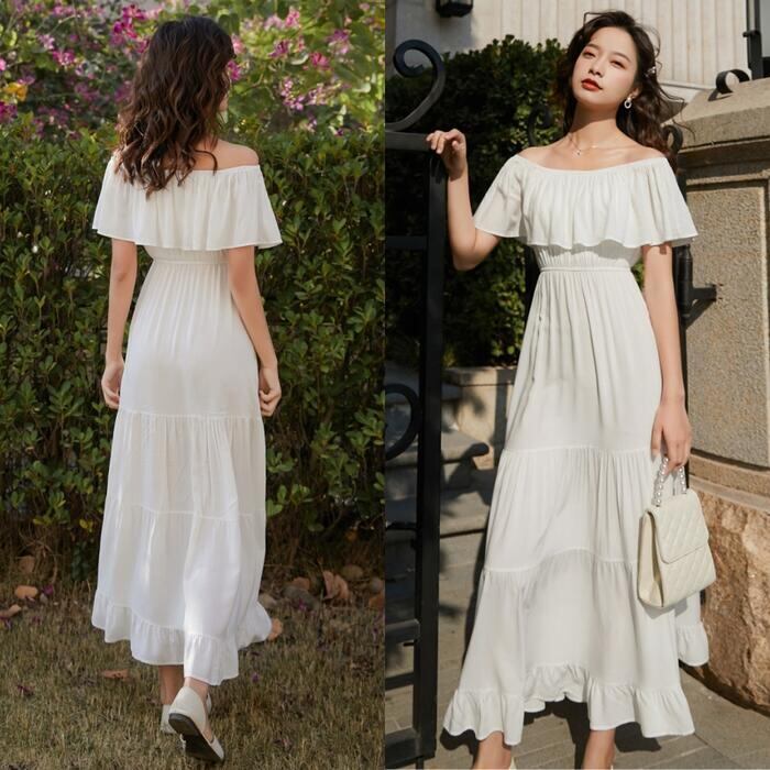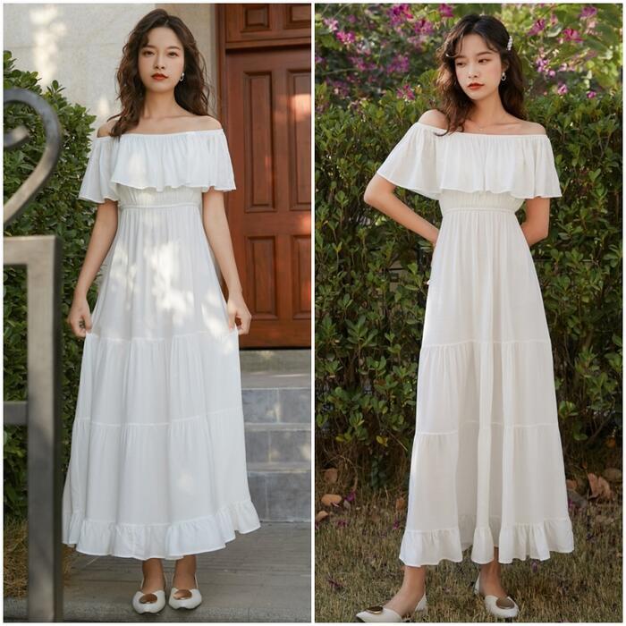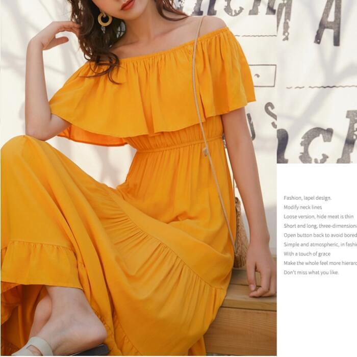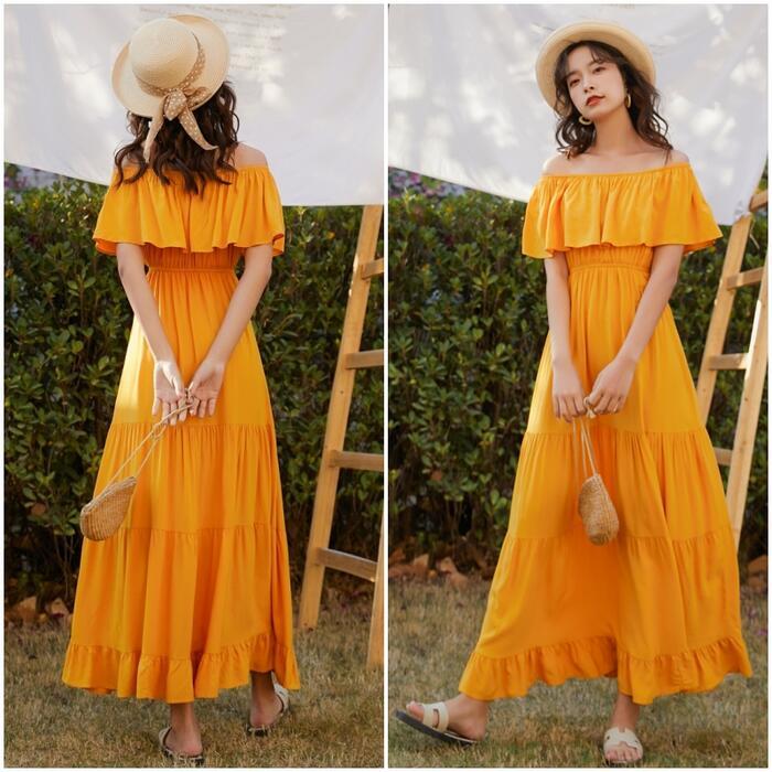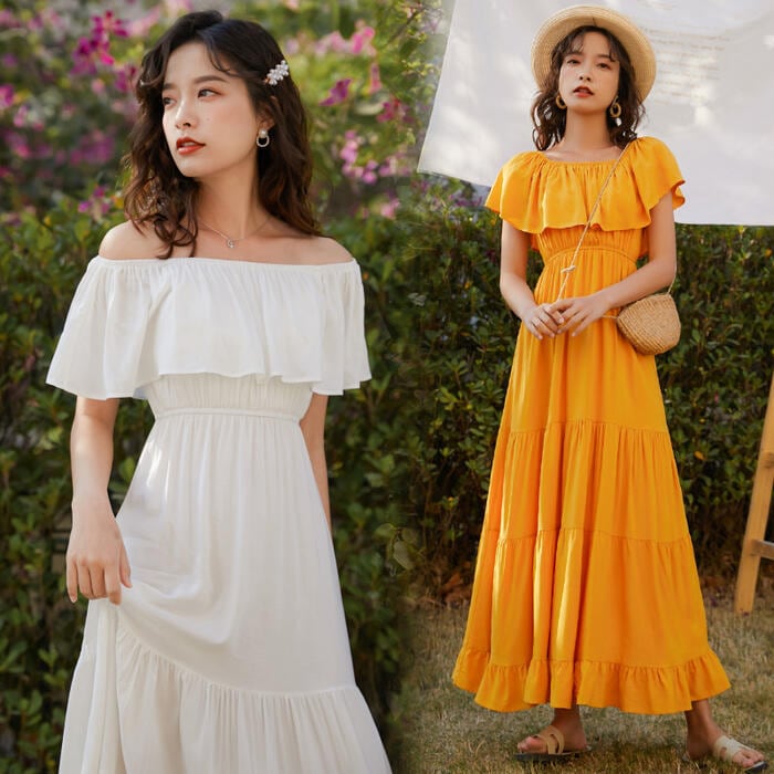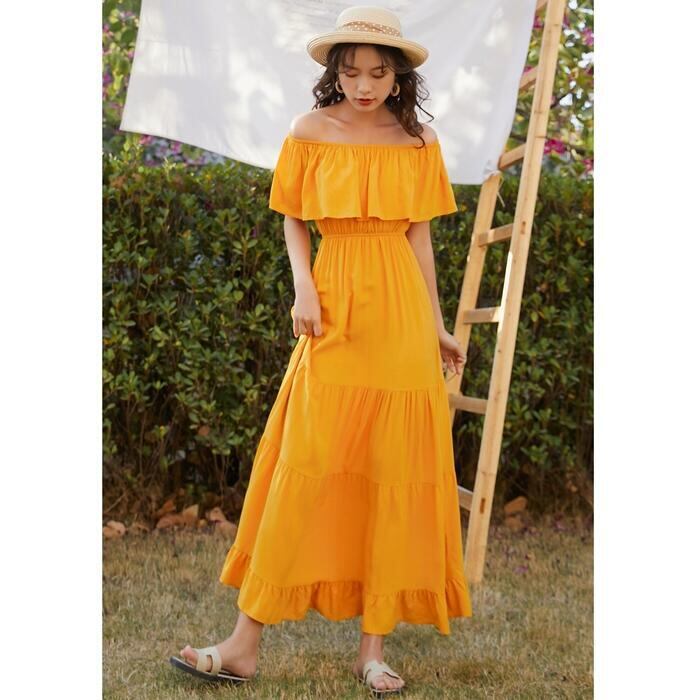 全2色 ティアード ワンピース ロングワンピ 袖あり レディース きれいめ カジュアル ロング丈 フリル ラッフル 切り替え オフショルダー おしゃれ 大人 可愛い ワンピ ドレス 半袖 フェミニン 体型カバー ホワイト 白 イエロー 春 秋 夏 20代 30代 40代 50代
