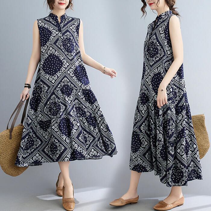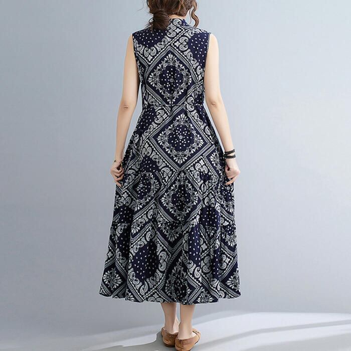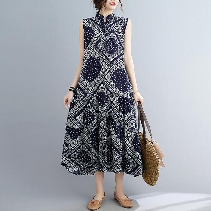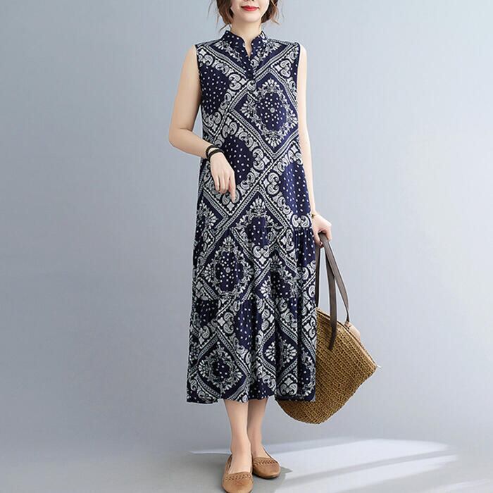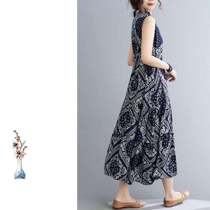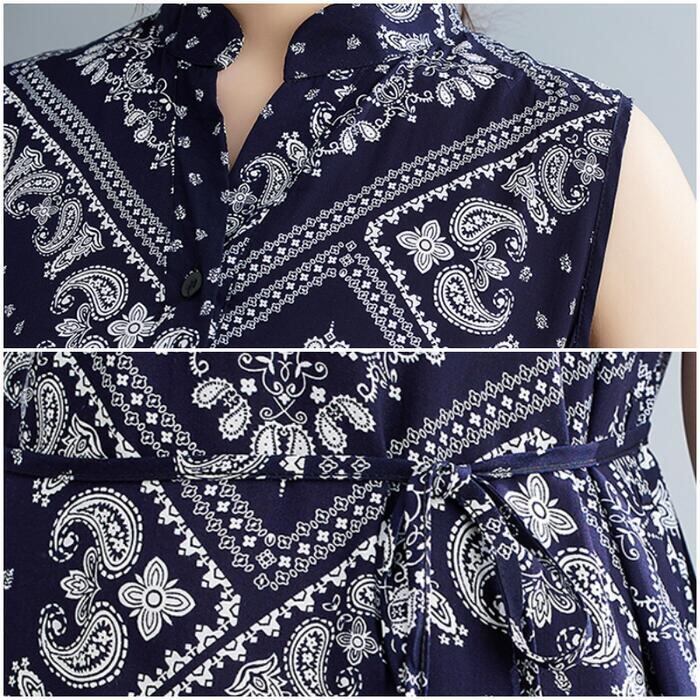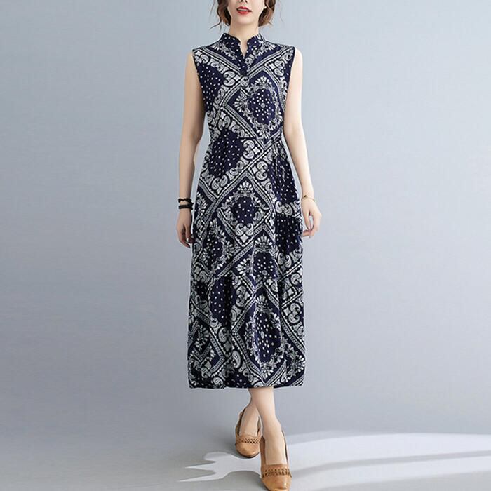 リネン ワンピース ペイズリー ナチュラル 薄手 涼しい コットン リネン混 綿 麻 春 夏 レディース ワンピ ドレス カジュアル きれいめ ノースリーブ ウエストリボン キーネック 大人 可愛い ネイビー 20代 30代 40代 50代