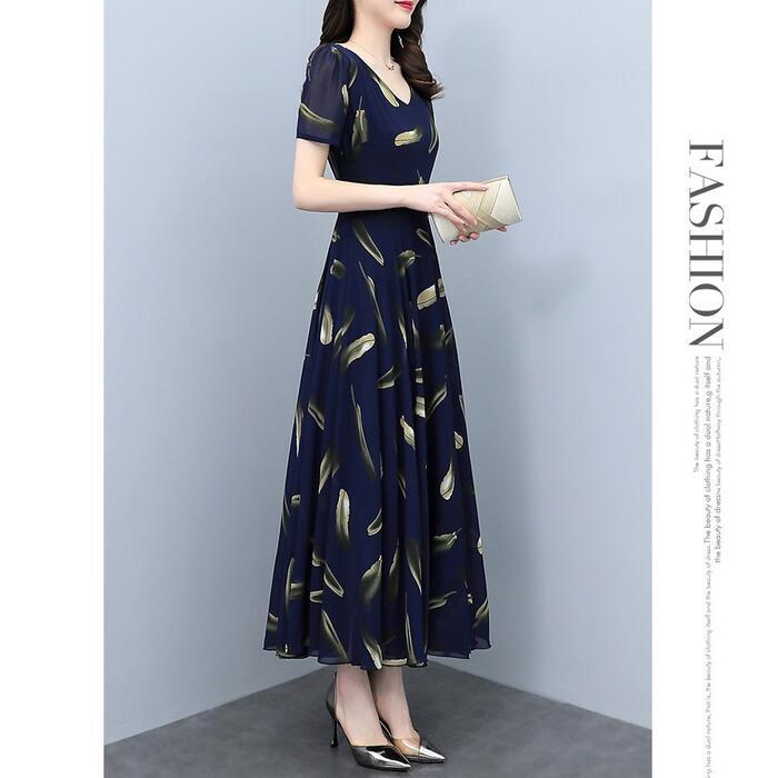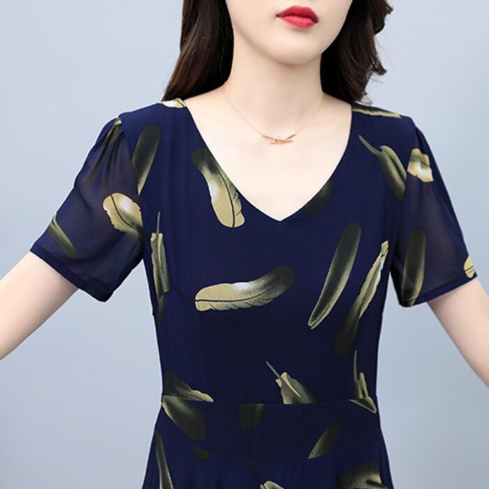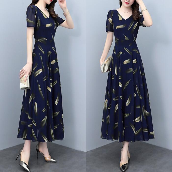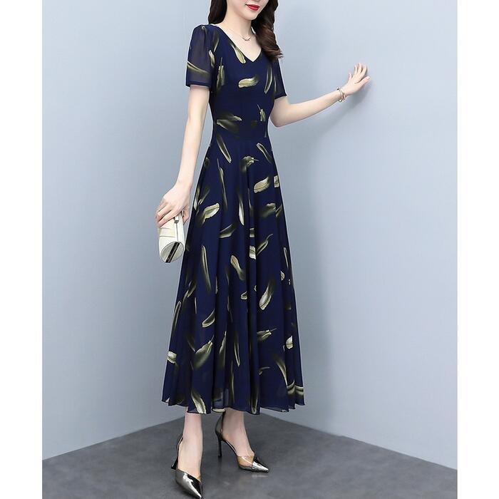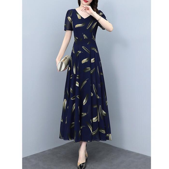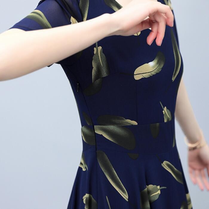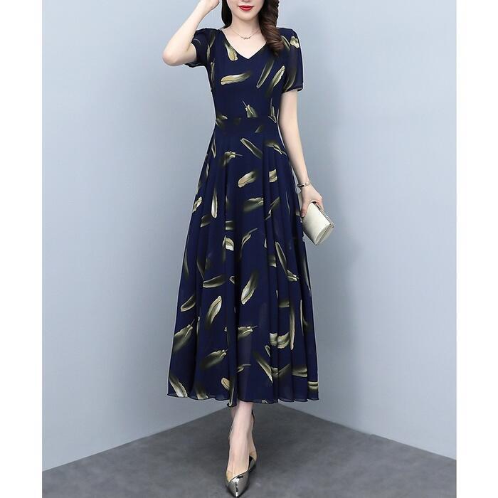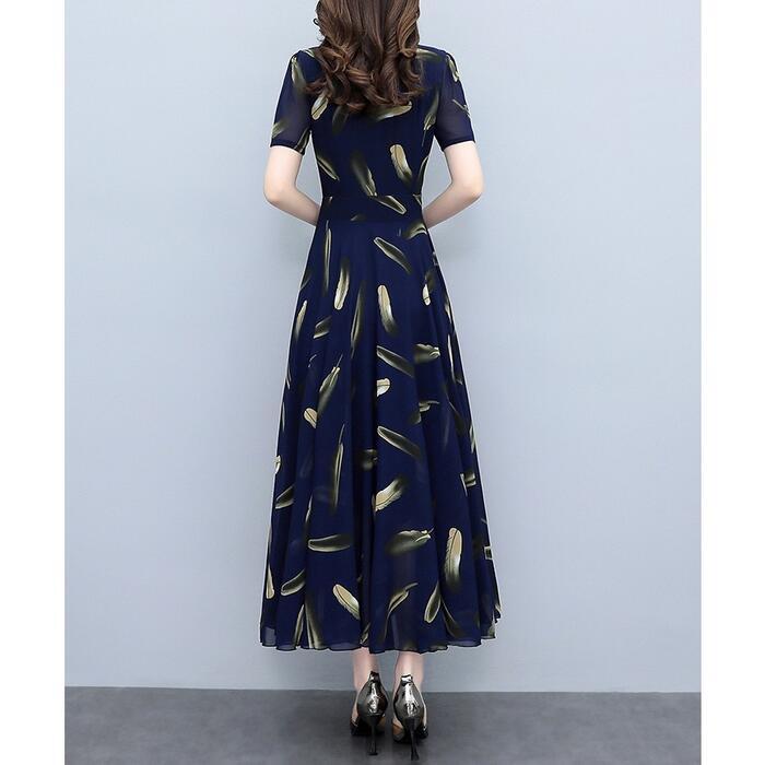 大きいサイズワンピース ロングワンピ 袖あり レディース フェザー プリント エレガント きれいめ カジュアル ミモレ丈 おしゃれ 大人 可愛い ワンピ ドレス 半袖 Aライン 切替 シフォン ハイウエスト 透け感 ネイビー 春 秋 夏 20代 30代 40代 50代