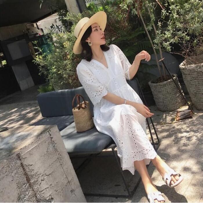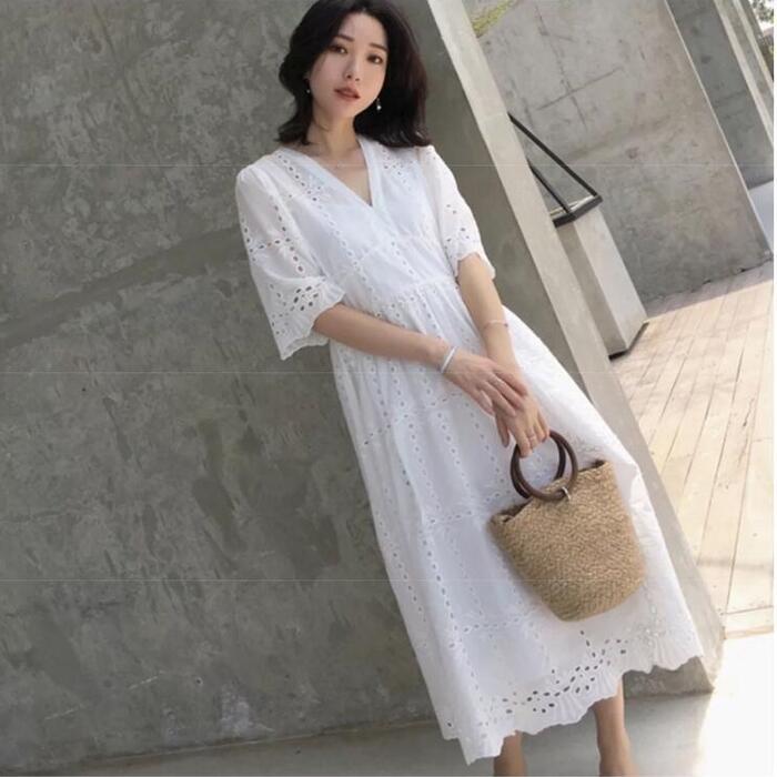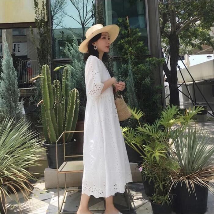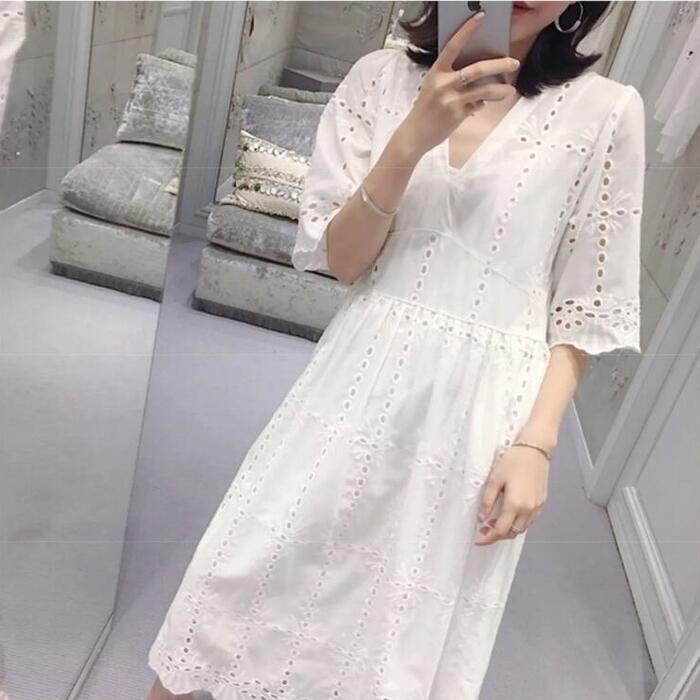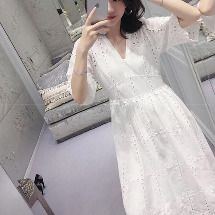 大きいサイズ ワンピース レース カットワーク 袖あり レディース Vネック きれいめ カジュアル ミモレ丈 おしゃれ 大人 可愛い ワンピ ドレス 半袖 Aライン ハイウエスト インナー キャミワンピ ナチュラル ホワイト 白 春 秋 夏 20代 30代 40代 50代