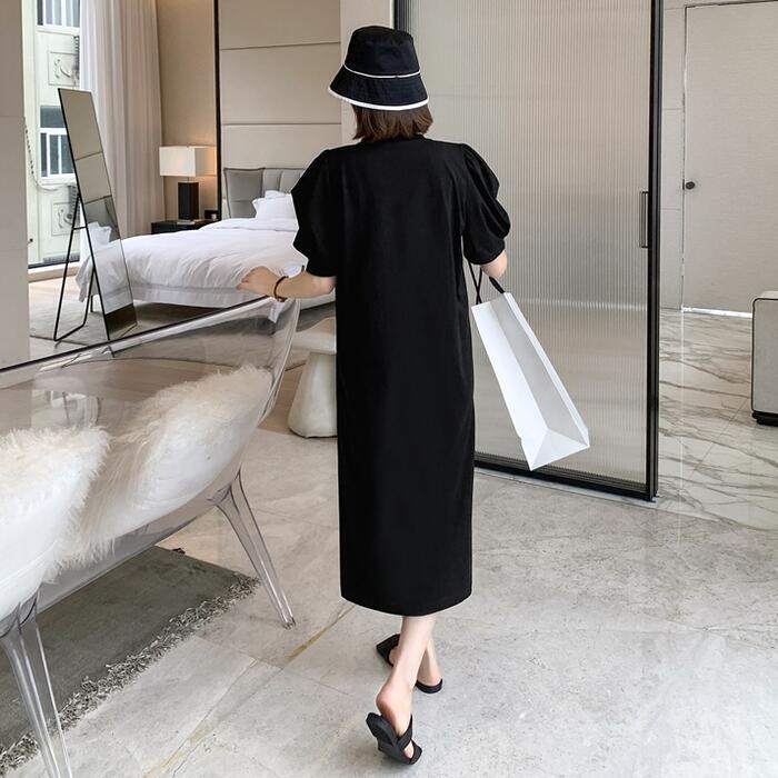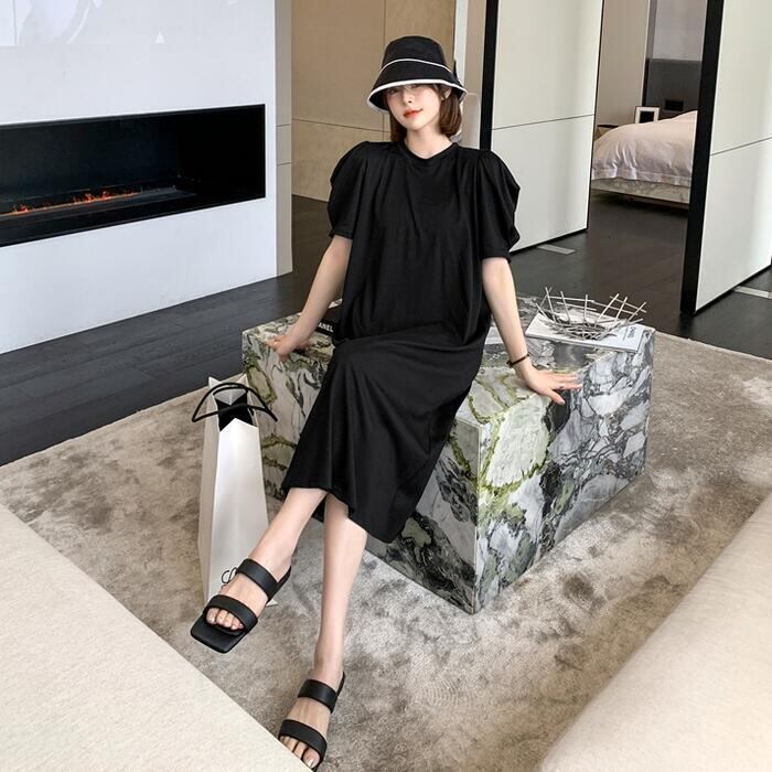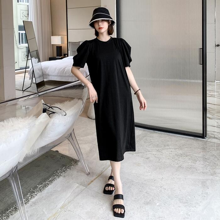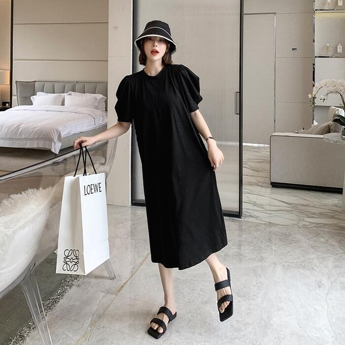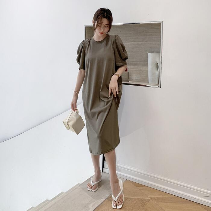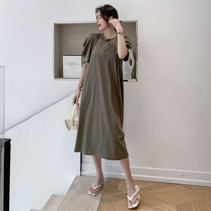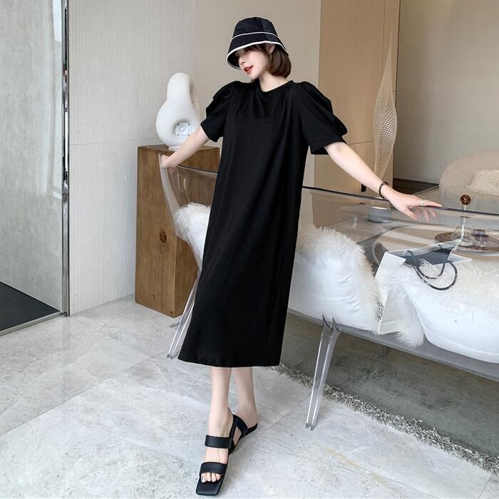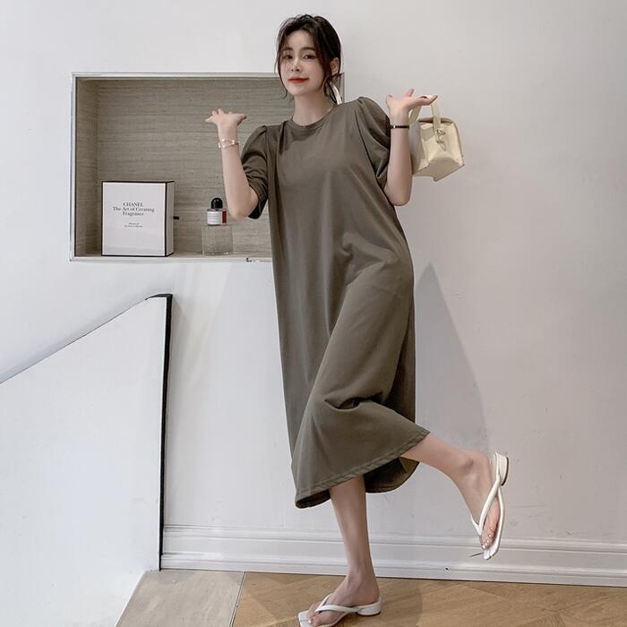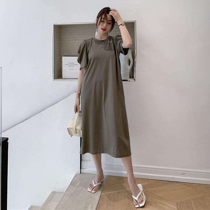 全2色 大きいサイズ ワンピース パワーショルダー Tシャツワンピ 袖あり レディース きれいめ カジュアル ミモレ丈 おしゃれ 大人 可愛い ワンピ ドレス 半袖 ゆったり 体型カバー シンプル カーキ ブラック 黒 春 秋 夏 20代 30代 40代 50代