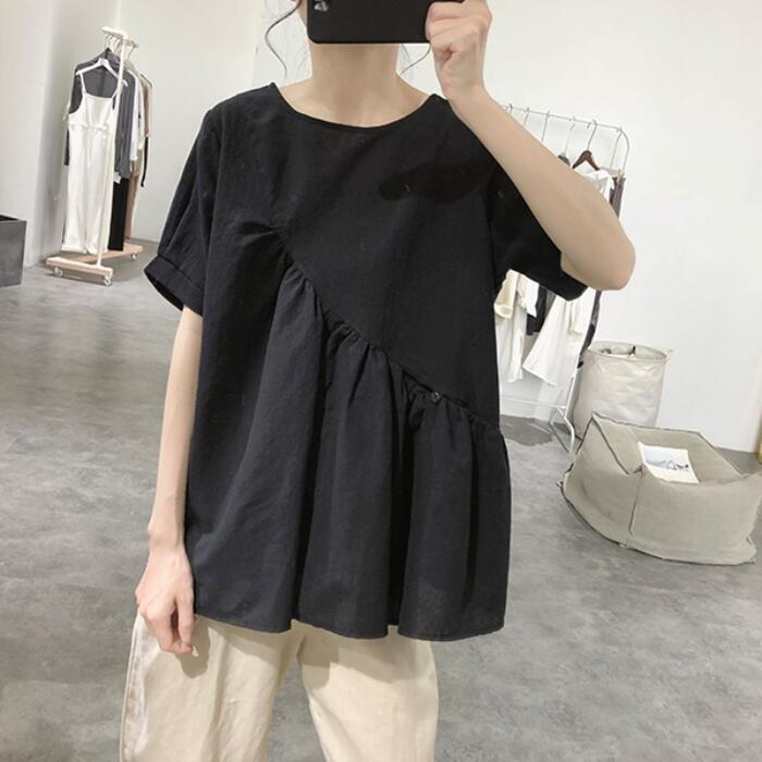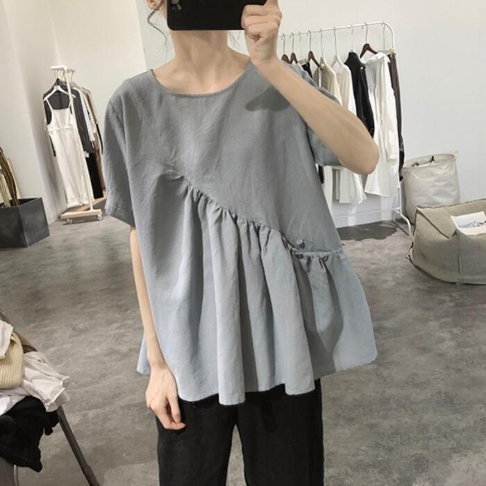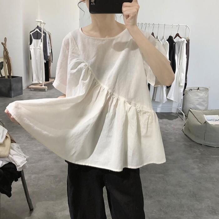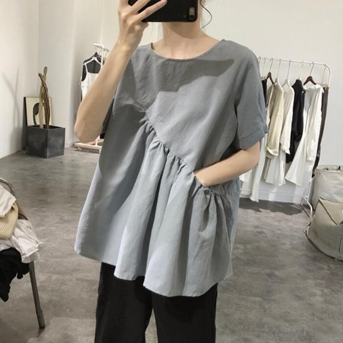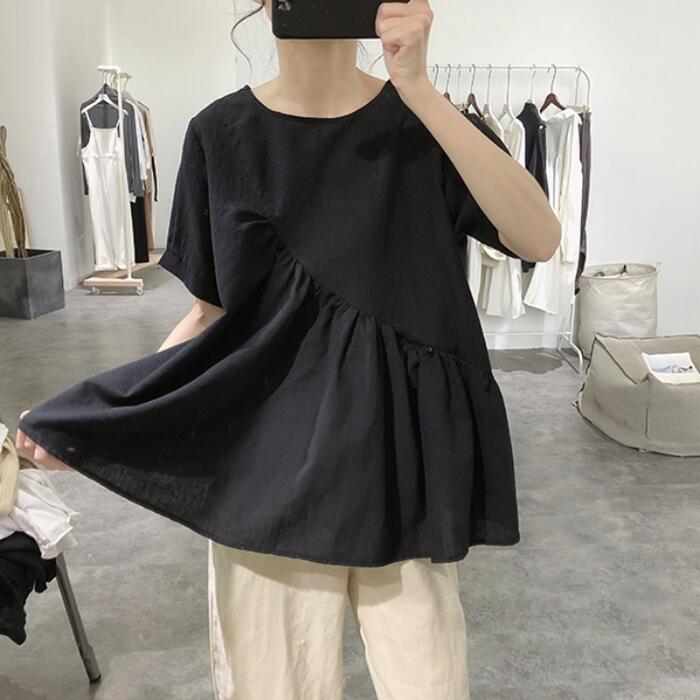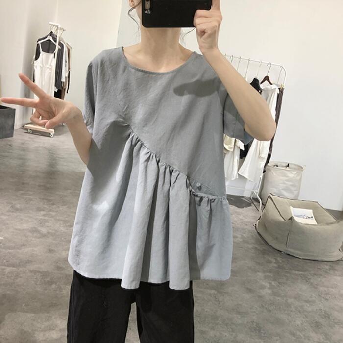 全3色 シンプル 涼しい リネン トップス ブラウス カットソー Tシャツ レディース 半袖 きれいめ カジュアル 可愛い 切り替え ギャザー フェミニン プルオーバー リネン混 綿 麻 ゆったり 体型カバー グレー ホワイト 白 ブラック 黒 春 夏 秋 20代 30代 40代 50代