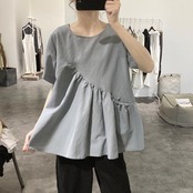 斜めに切り替えの入った半袖ギャザーブラウス。