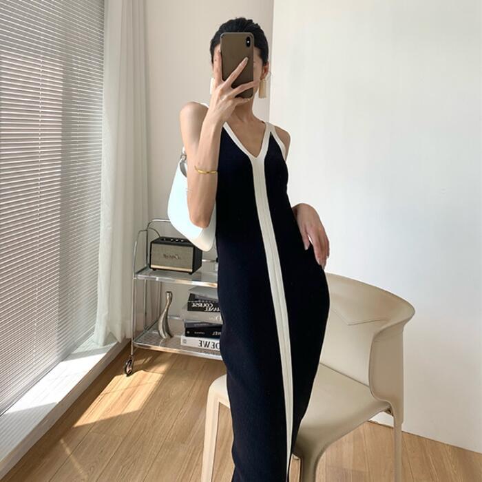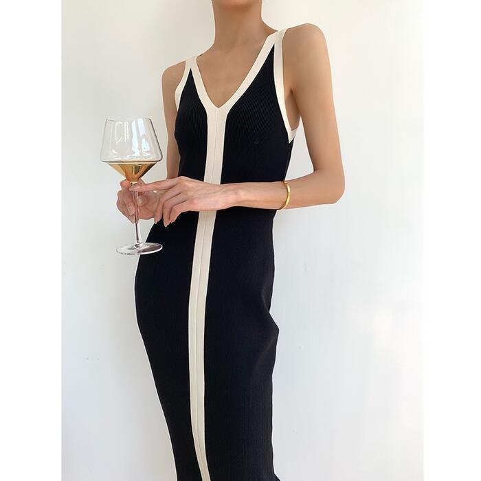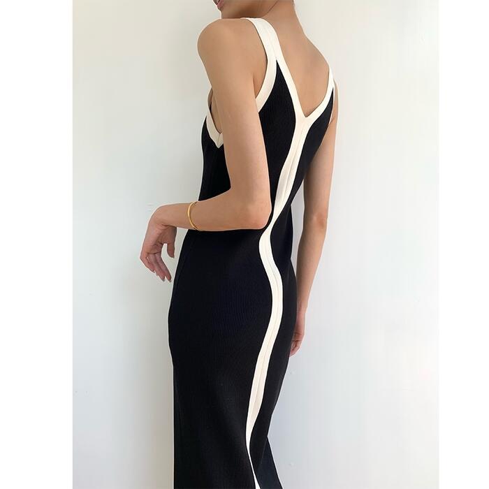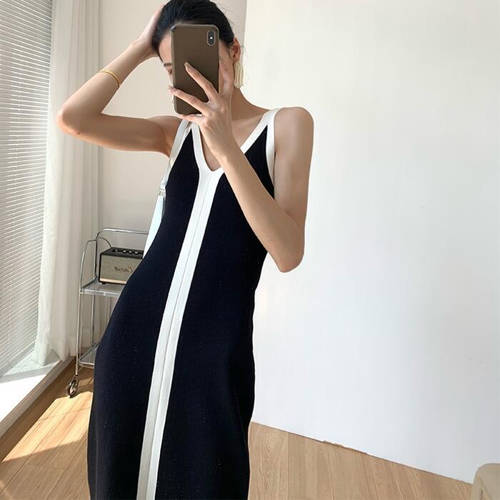 ワンピース ニット キャミワンピ 配色 ライン レディース きれいめ カジュアル バイカラー ミモレ丈 ノースリーブ おしゃれ 大人 可愛い ワンピ ドレス タイト スリム Vネック ブラック 黒 春 秋 夏 20代 30代 40代 50代