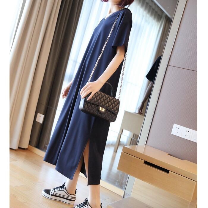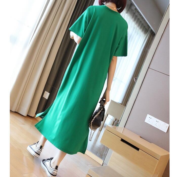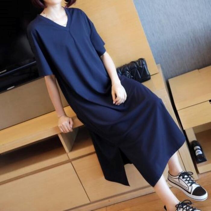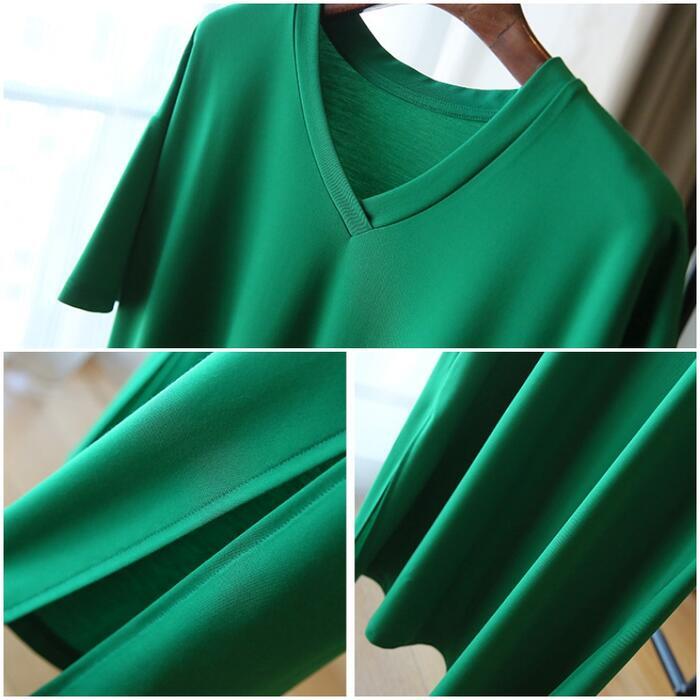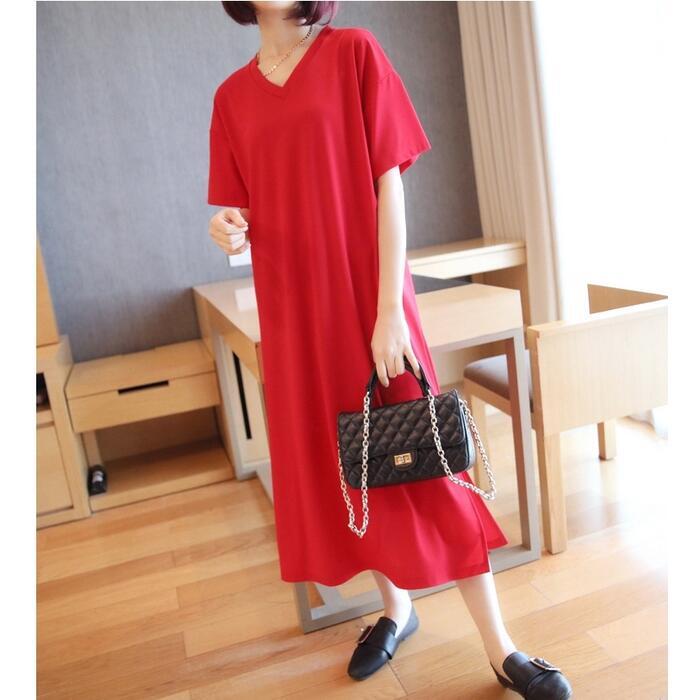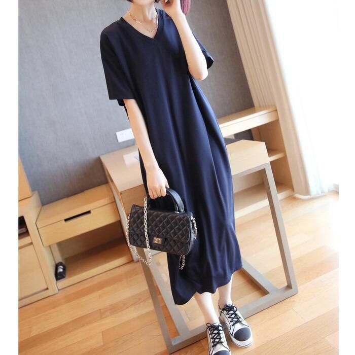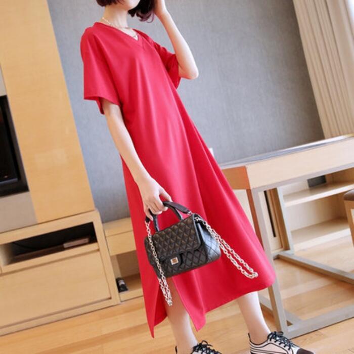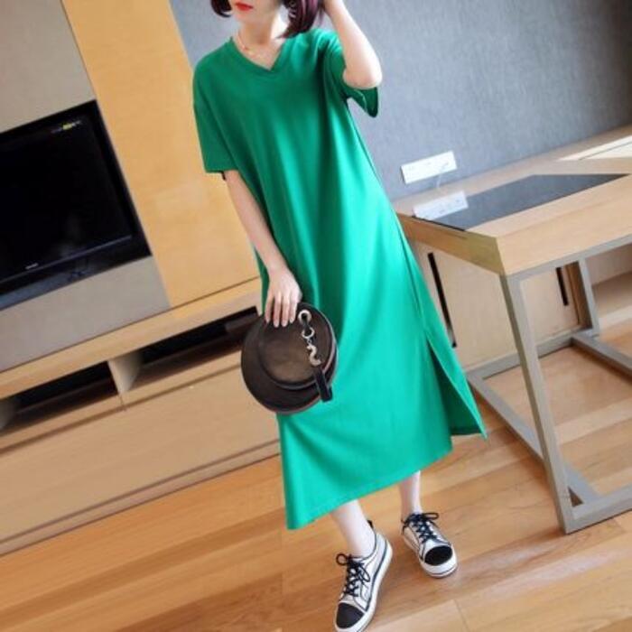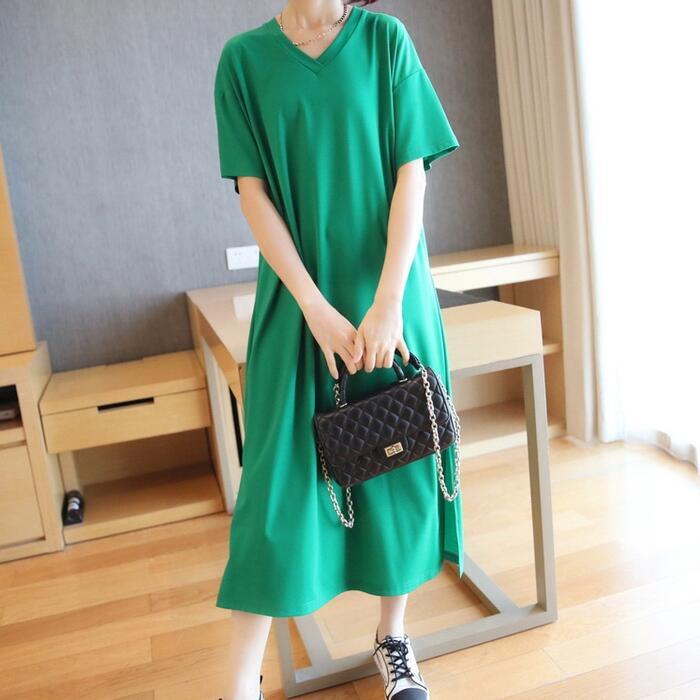 全3色 大きいサイズワンピース 袖あり Tシャツワンピ レディース きれいめ カジュアル Vネック ミモレ丈 おしゃれ 大人 可愛い ワンピ ドレス シンプル 体型カバー ゆったり 楽ちん グリーン 緑 レッド 赤 ネイビー 春 秋 夏 20代 30代 40代 50代