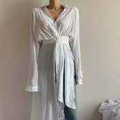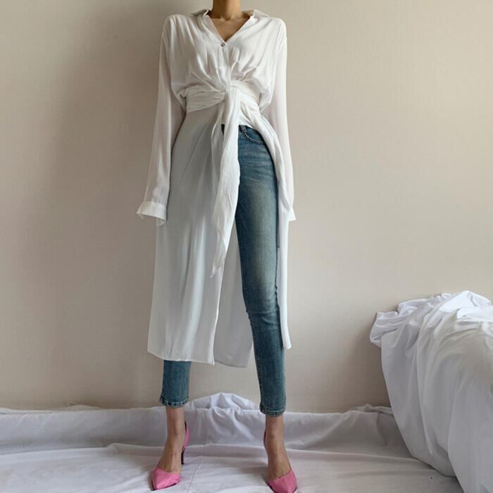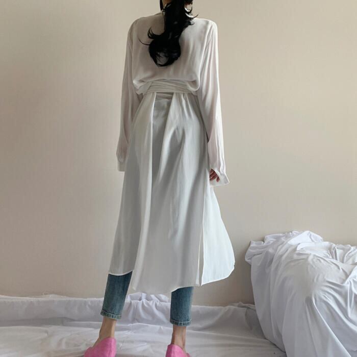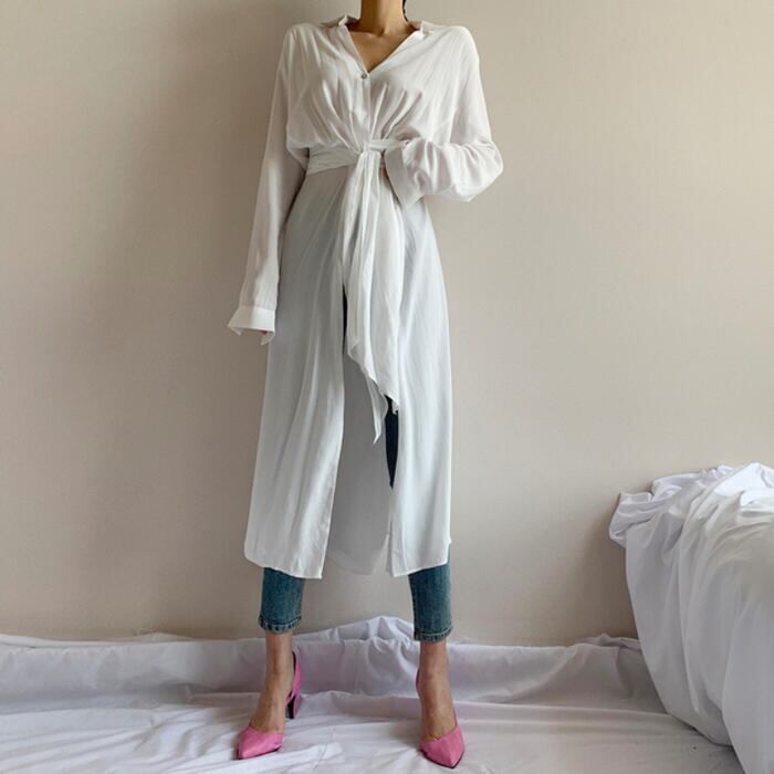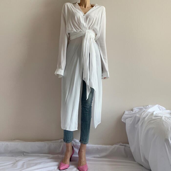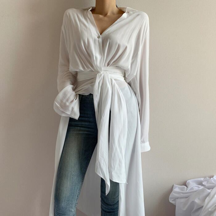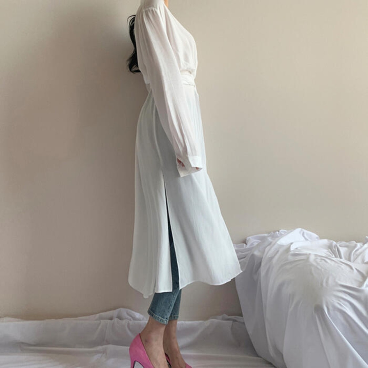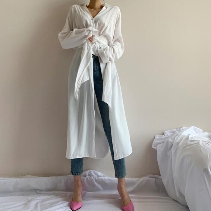トップス シャツ ブラウス ロング丈 レディース 長袖 きれいめ カジュアル おしゃれ 大人 可愛い フェミニン ゆったり 韓国 体型カバー シンプル レイヤード Vネック 開襟 ホワイト 白 春 夏 秋 20代 30代 40代 50代