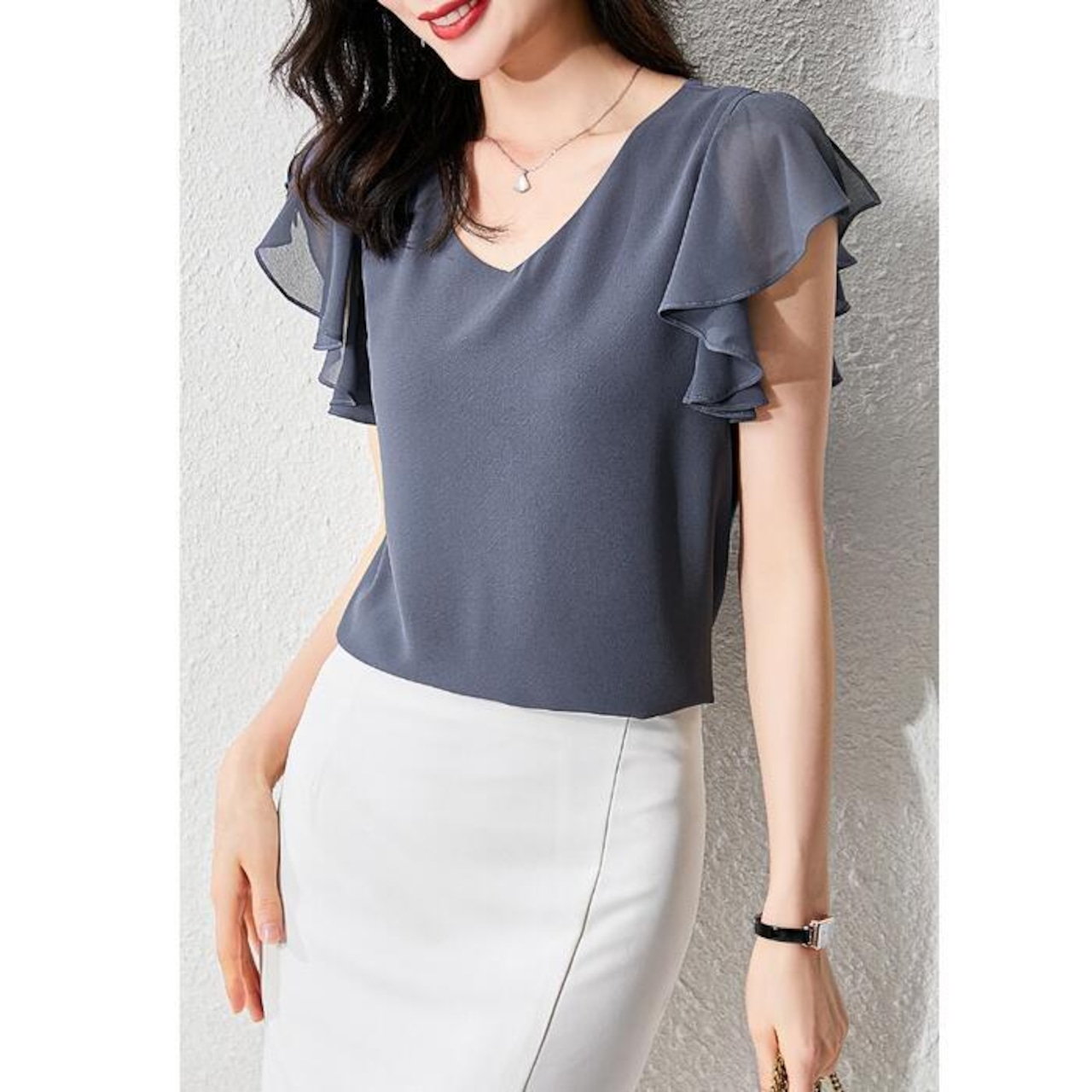 全2色 トップス ブラウス シャツ レディース 半袖 きれいめ カジュアル フリル エレガント おしゃれ 大人 可愛い フェミニン 体型カバー シンプル オフィス 通勤 Vネック 大きいサイズ グレー ブラック 黒 春 夏 秋 20代 30代 40代 50代