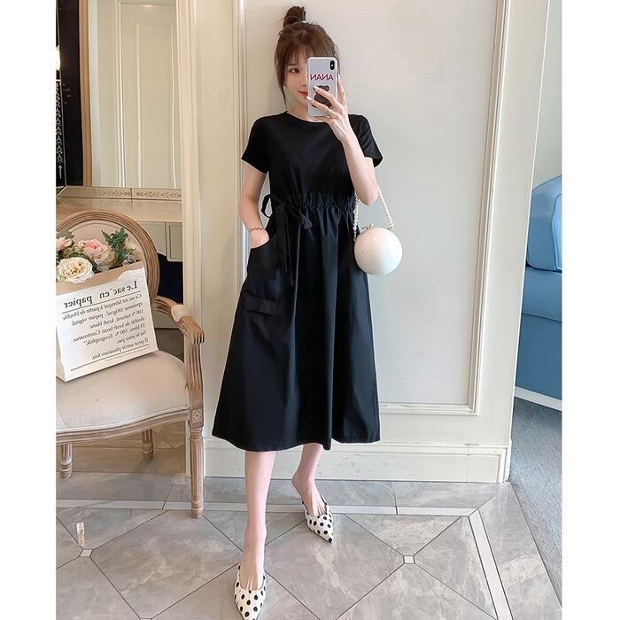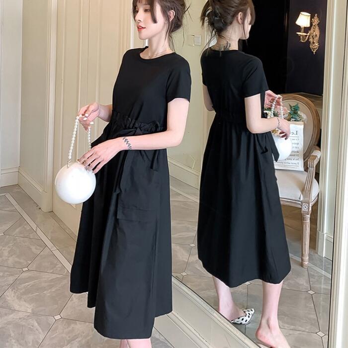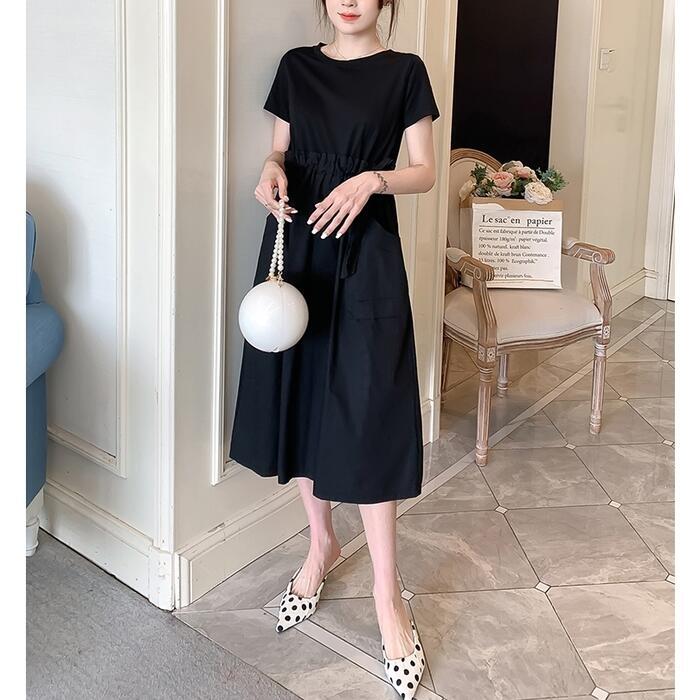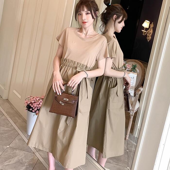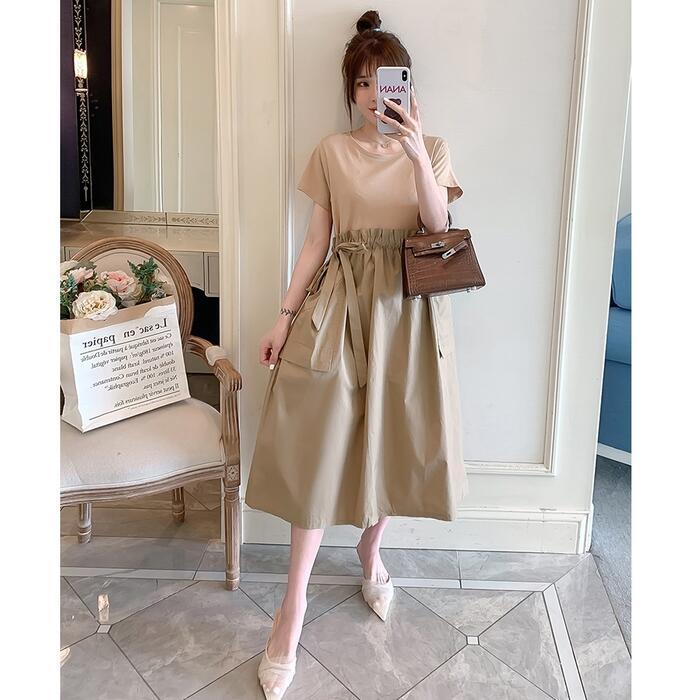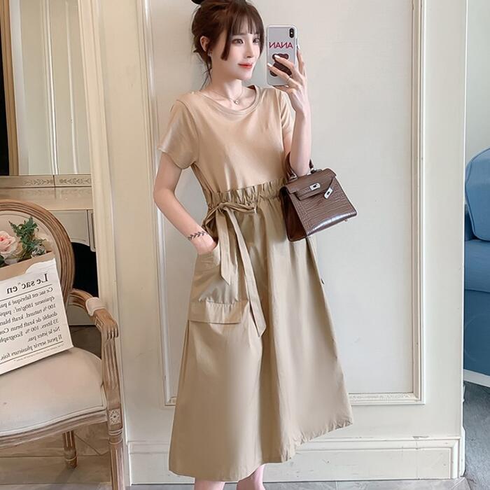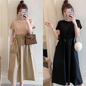 全2色 大きいサイズワンピース ロングワンピ 袖あり セットアップ風 切り替え レディース きれいめ カジュアル ミモレ丈 おしゃれ 大人 可愛い 半袖 異素材ミックス ワンピ ドレス ウエストリボン フェミニン ベージュ ブラック 黒 春 秋 夏 20代 30代 40代 50代