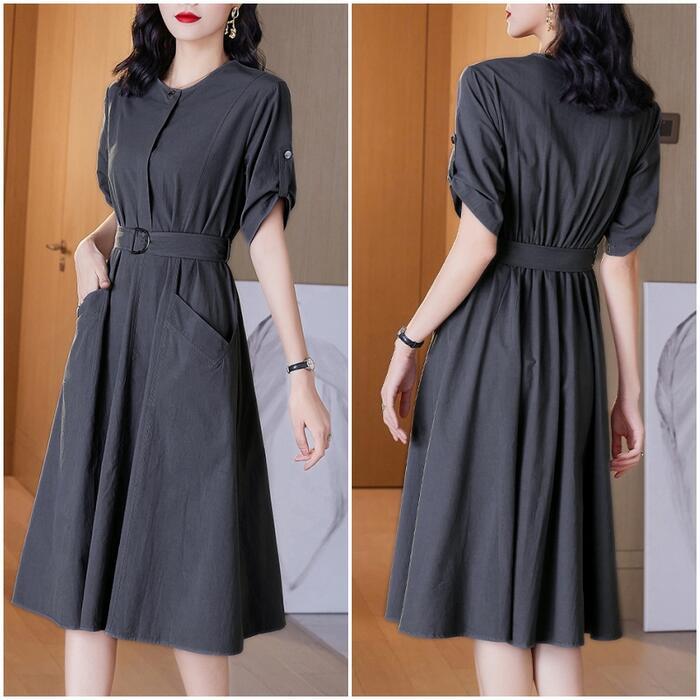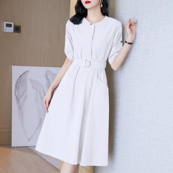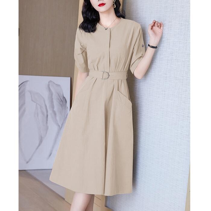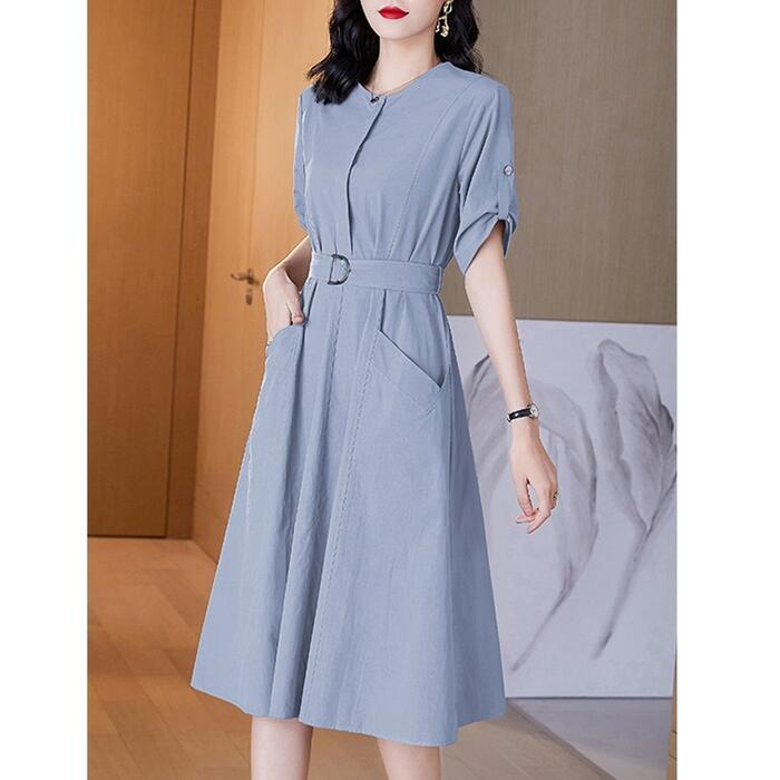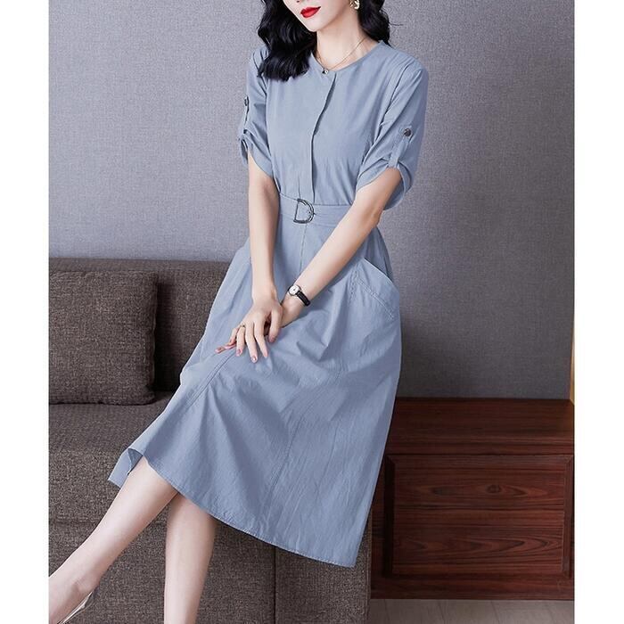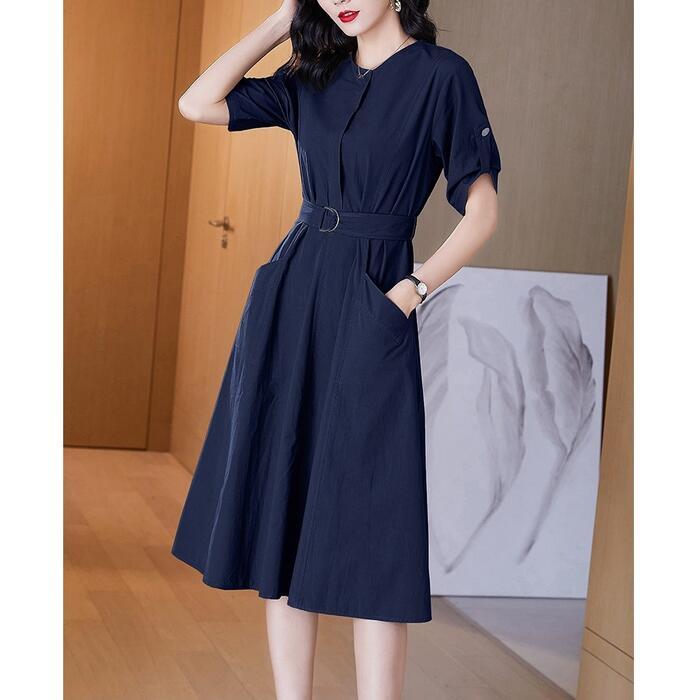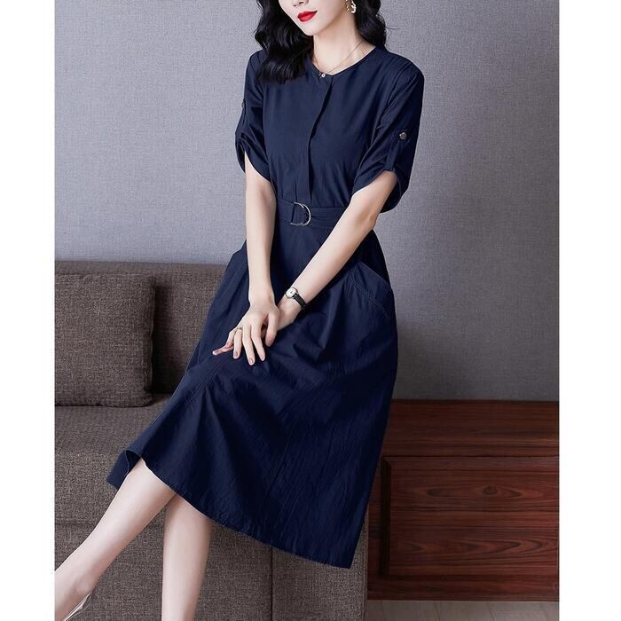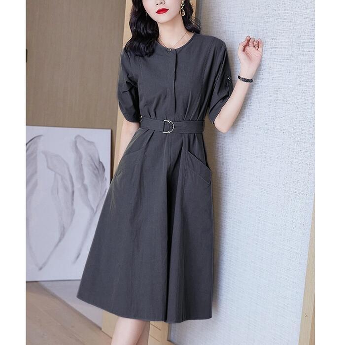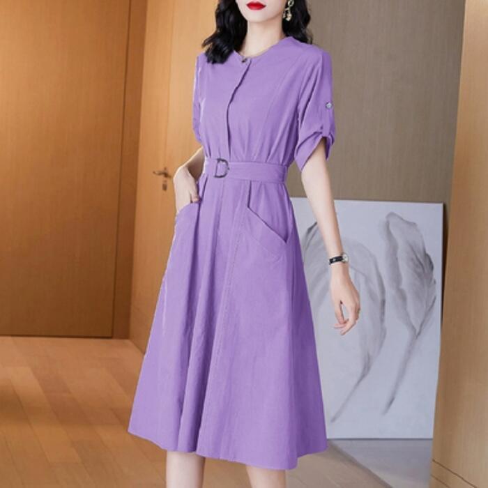 全6色 大きいサイズワンピース ロングワンピ 袖あり レディース きれいめ カジュアル ミモレ丈 おしゃれ 大人 可愛い 半袖 ワンピ ドレス ウエストベルト フェミニン シンプル ベージュ ホワイト 白 パープル ブルー ネイビー グレー 春 秋 夏 20代 30代 40代 50代