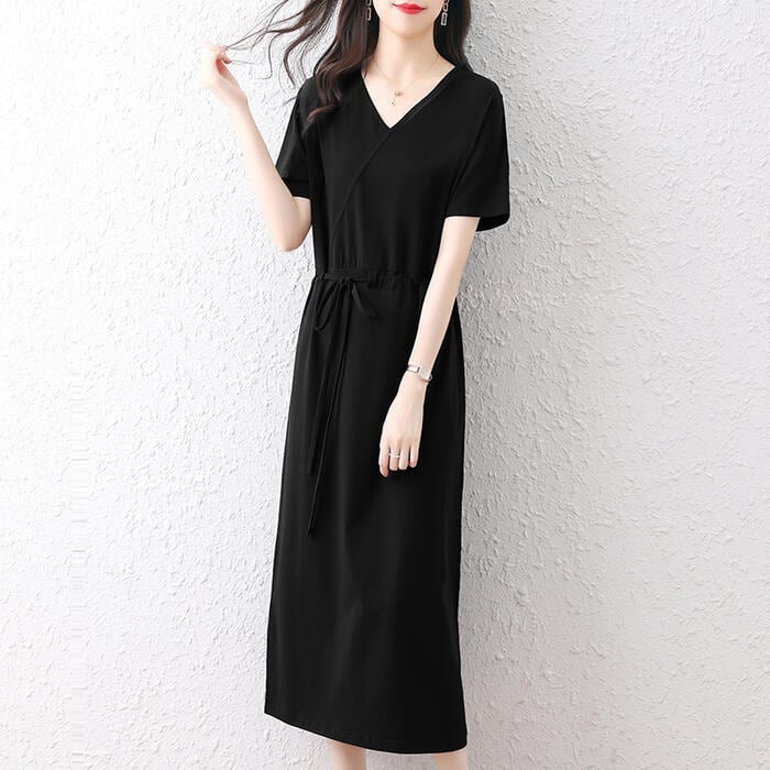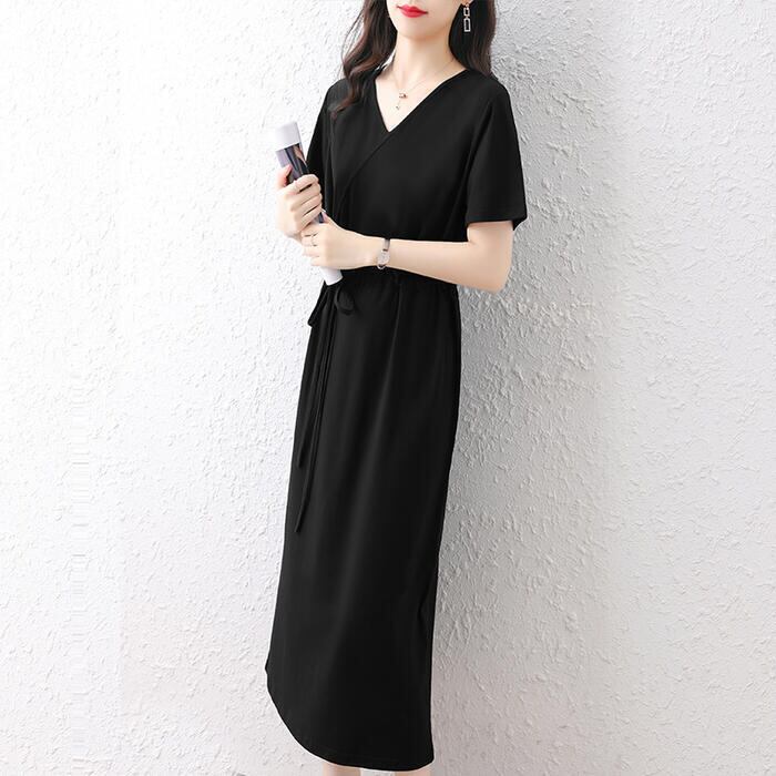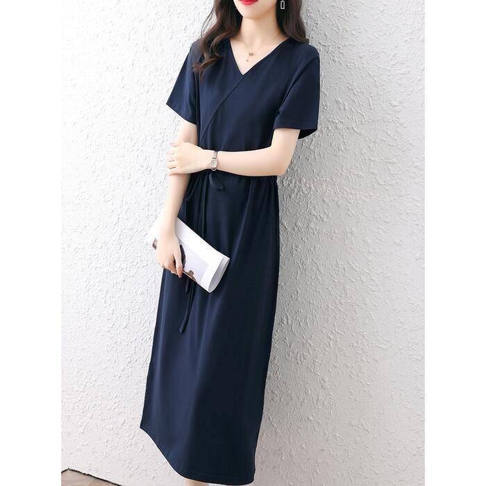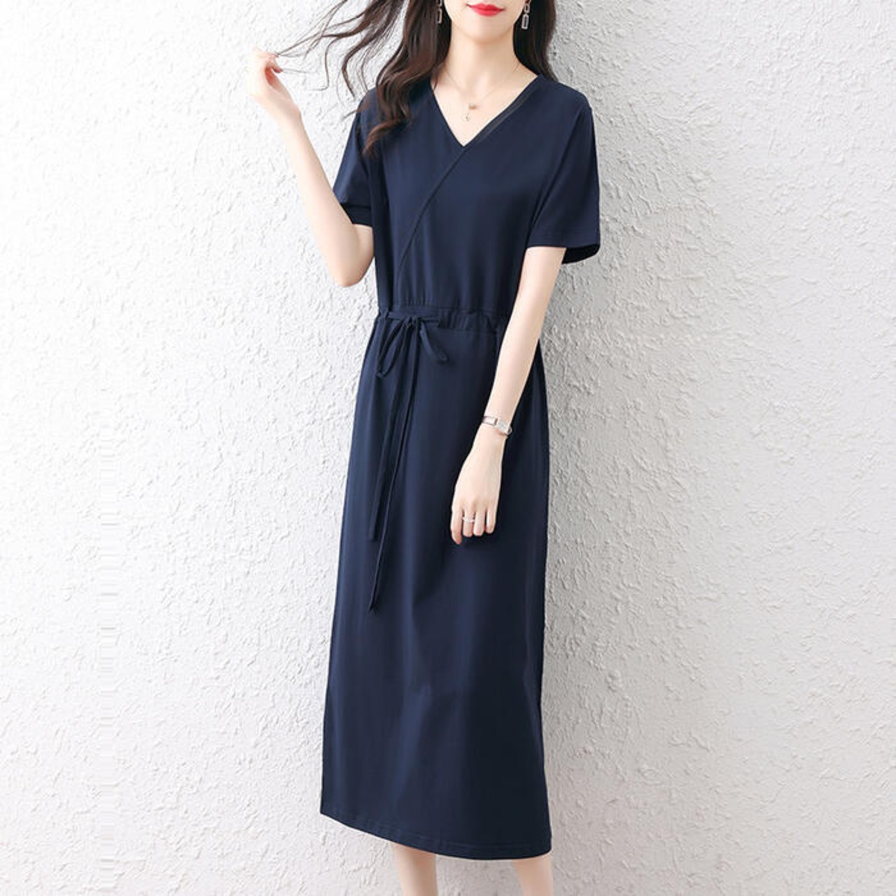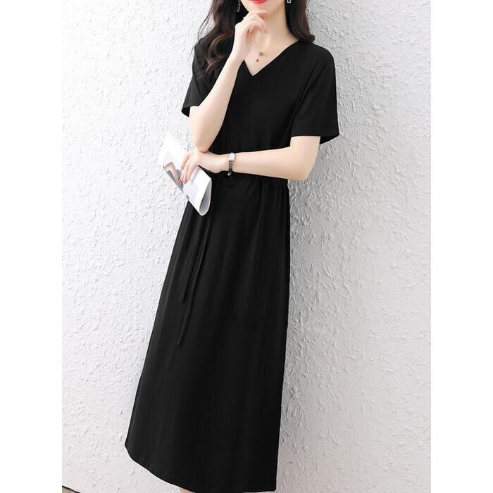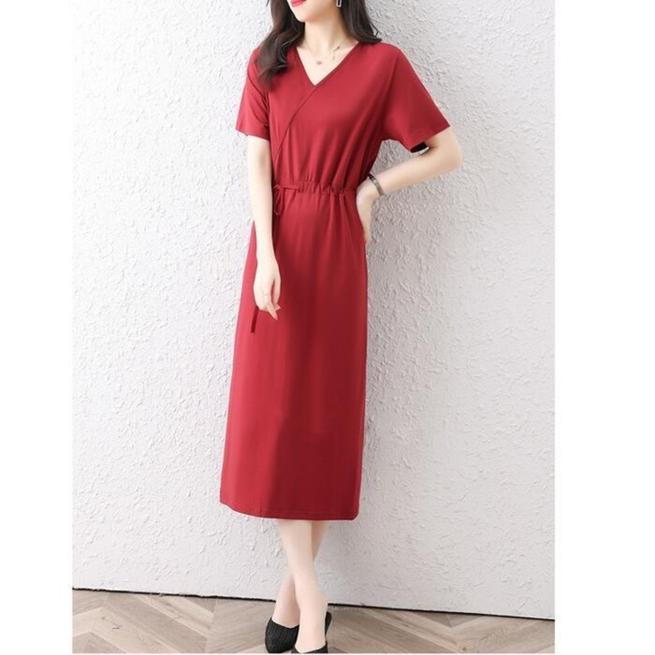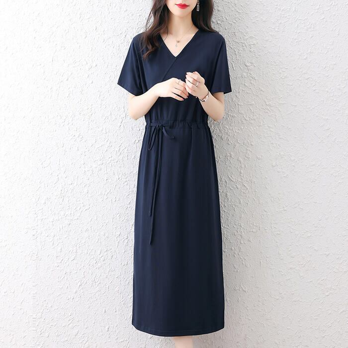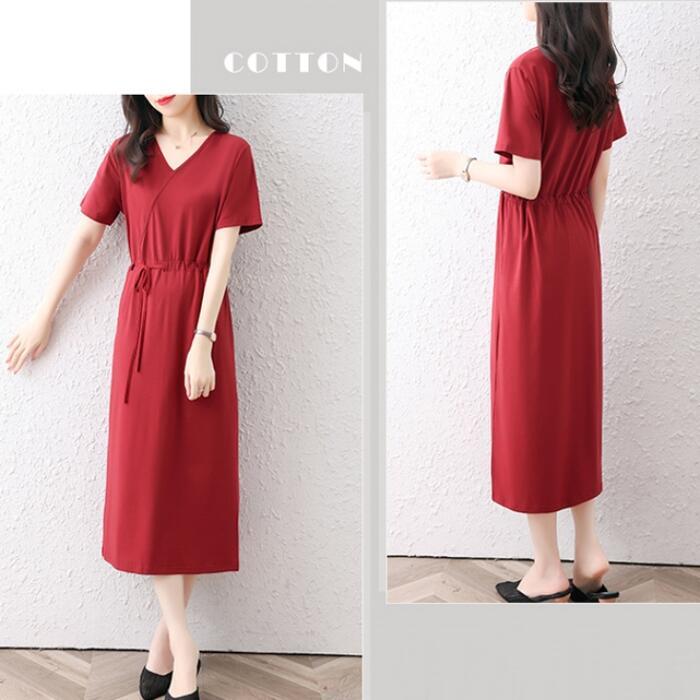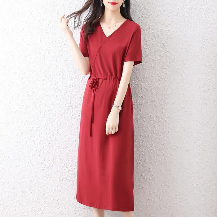 全3色 大きいサイズワンピース ロングワンピ 袖あり Tシャツワンピ レディース きれいめ カジュアル ミモレ丈 おしゃれ 大人 可愛い 半袖 ワンピ ドレス Vネック フェミニン シンプル ドロスト レッド 赤 ネイビー ブラック 黒 春 秋 夏 20代 30代 40代 50代