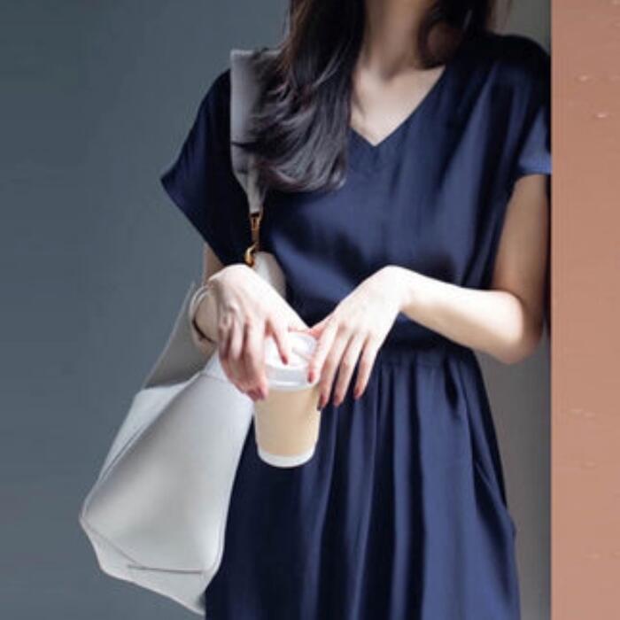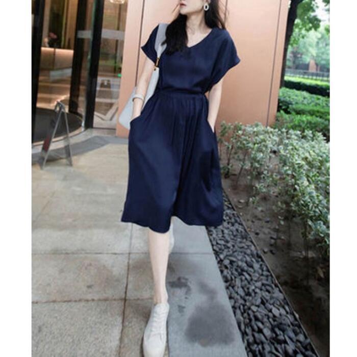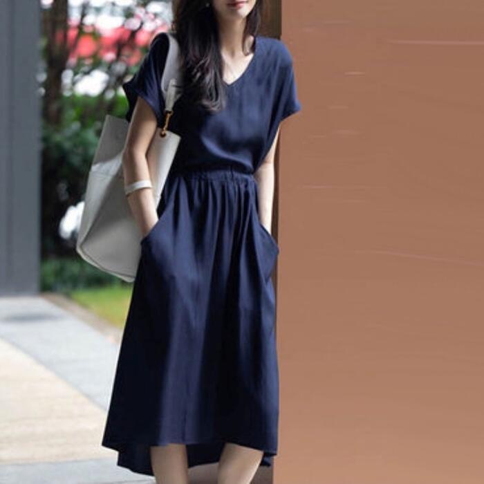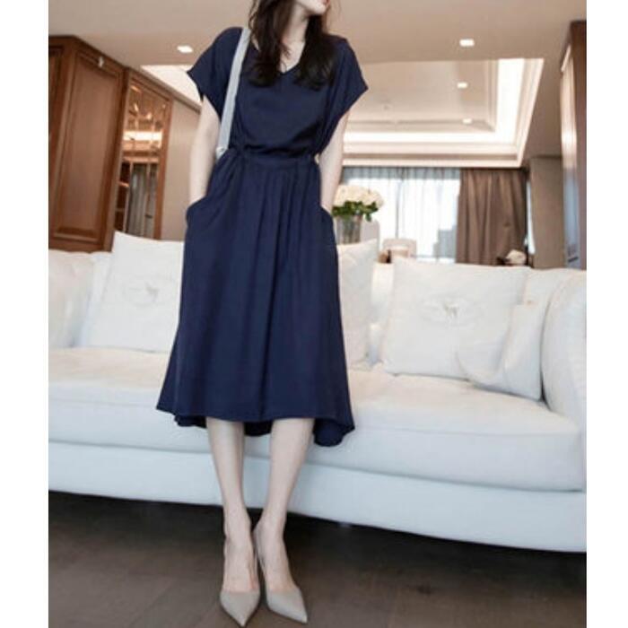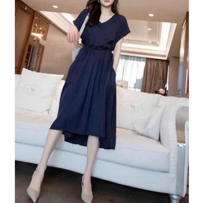 大きいサイズワンピース ロングワンピ 袖あり レディース エレガント きれいめ カジュアル ミモレ丈 おしゃれ 大人 可愛い 半袖 ワンピ ドレス Vネック フェミニン シンプル オフィス 通勤 ネイビー 春 秋 夏 20代 30代 40代 50代
