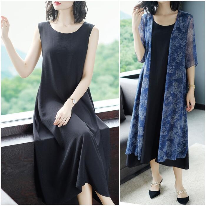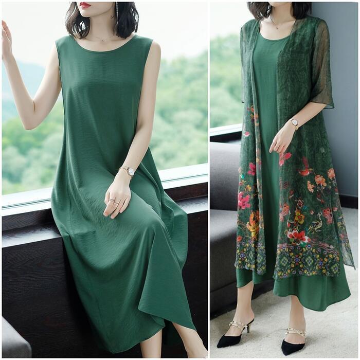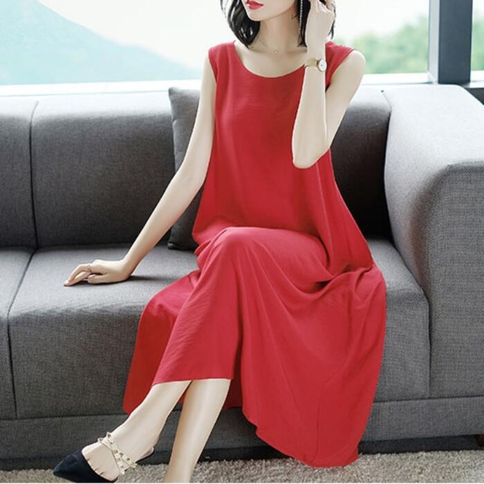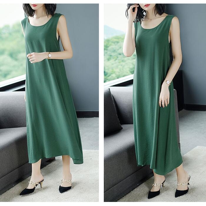 全3色 大きいサイズ ゆったりワンピース ロングワンピ レディース エレガント きれいめ カジュアル ロング丈 ノースリーブ おしゃれ 大人 可愛い ワンピ ドレス フェミニン シンプル シルク混 体型カバー グリーン 緑 レッド 赤 ブラック 黒 春 秋 夏 20代 30代 40代 50代