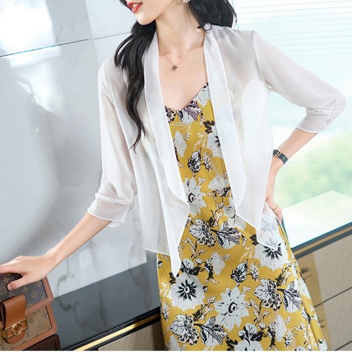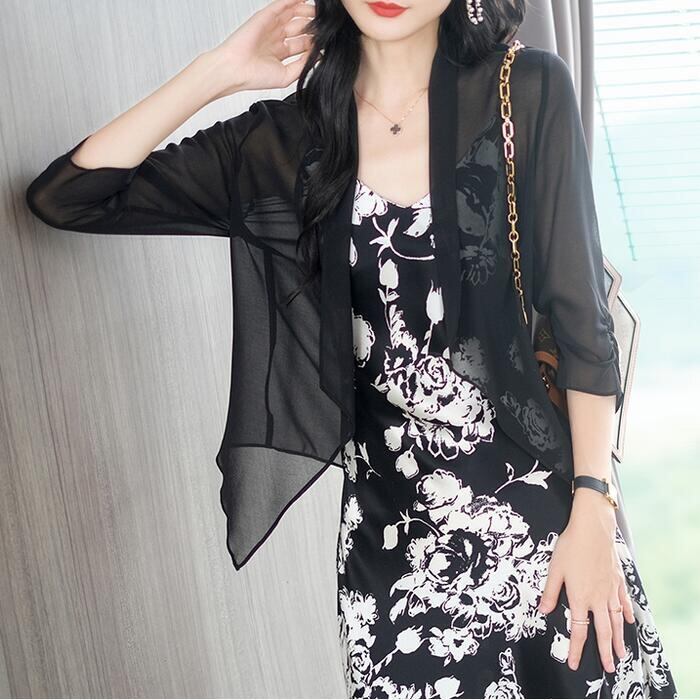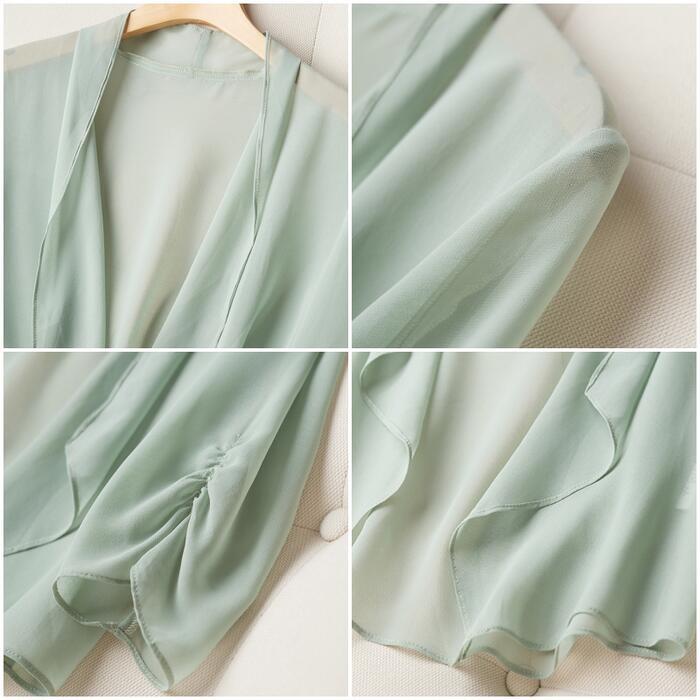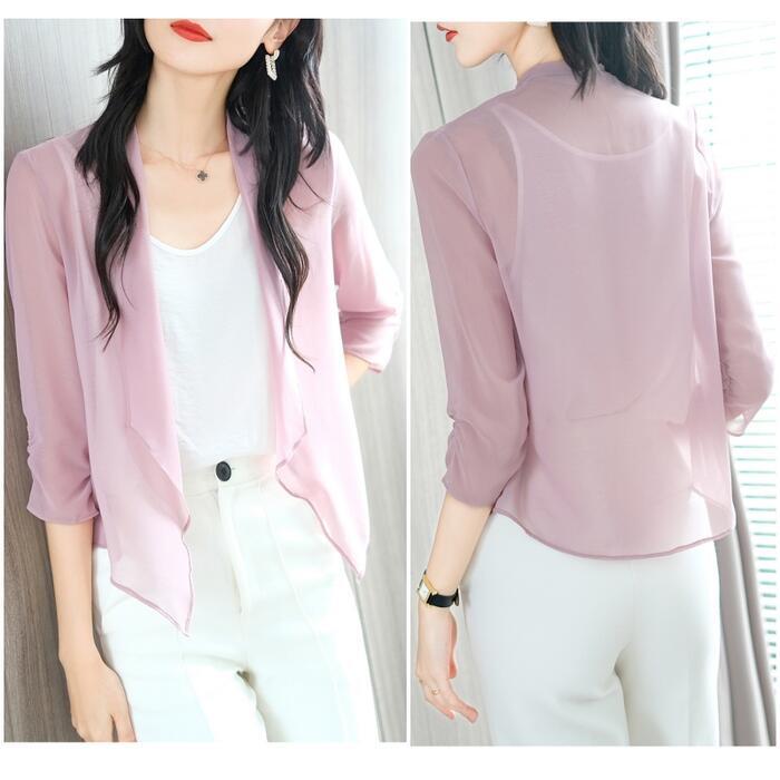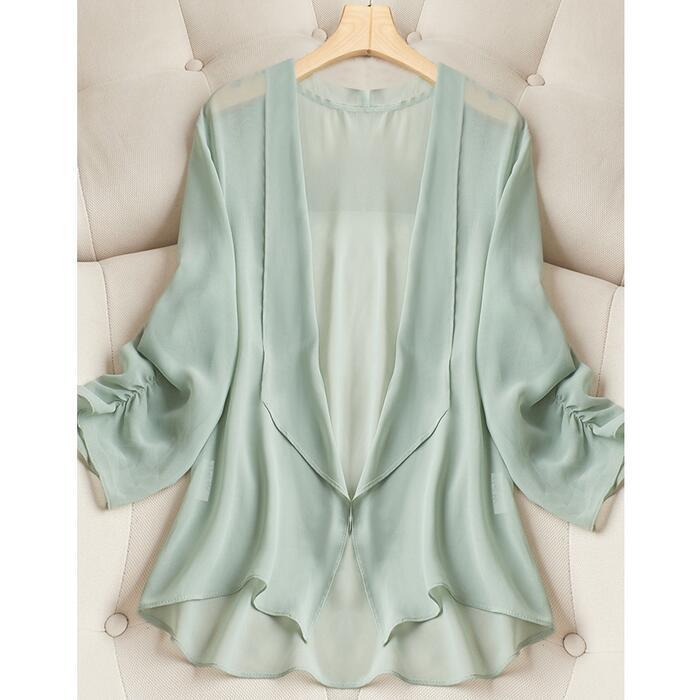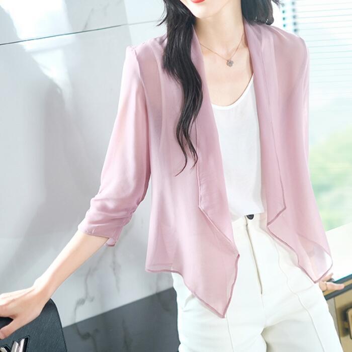 全4色 大きいサイズ 日焼け防止シアー トップス シャツ カーディガン 羽織り アウター レディース 七分袖 きれいめ カジュアル エレガント おしゃれ 大人 可愛い フェミニン 透け感 薄手 シンプル ピンク グリーン 緑 ホワイト 白 ブラック 黒 春 夏 秋 20代 30代 40代 50代