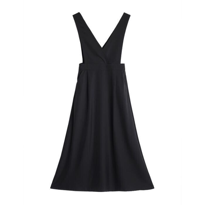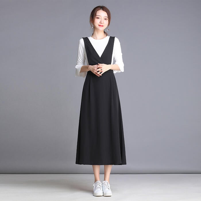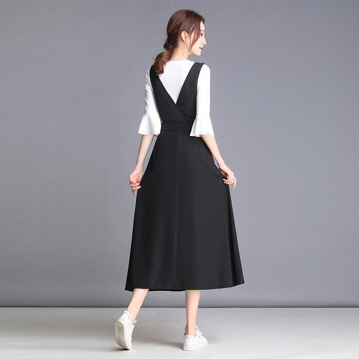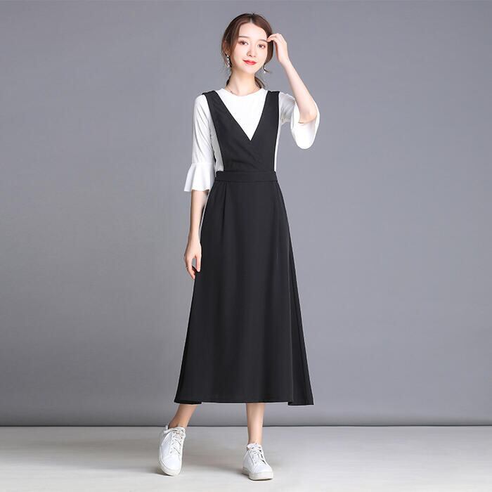 フレアスリーブのTシャツとサロペットスカートのセット。