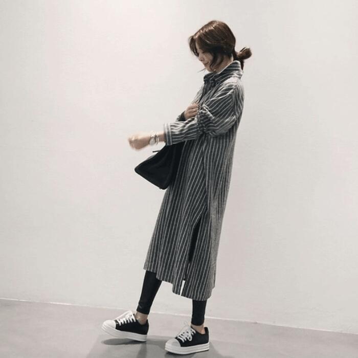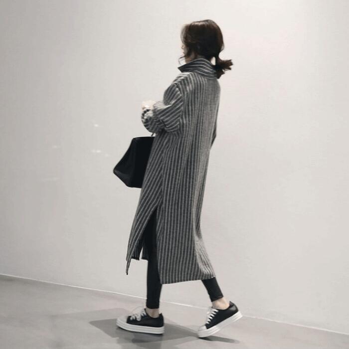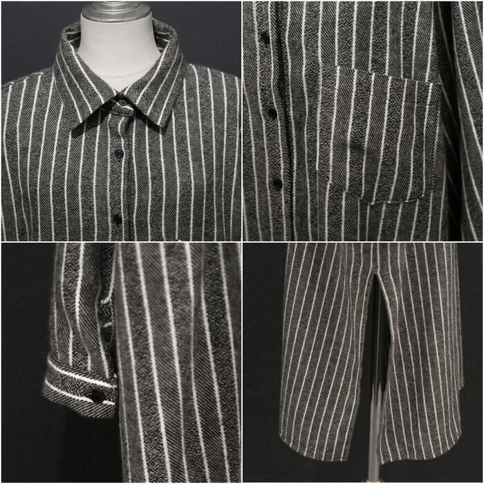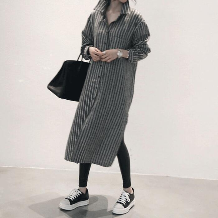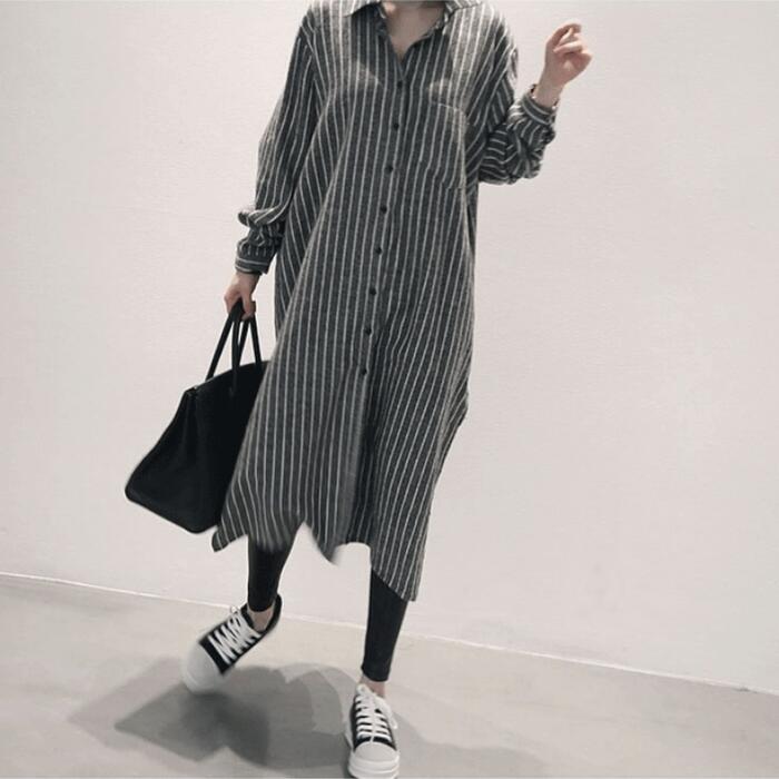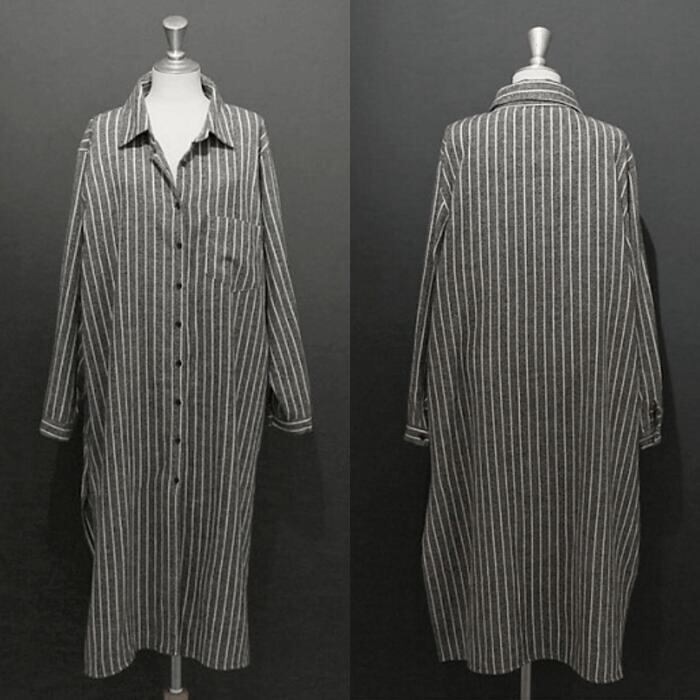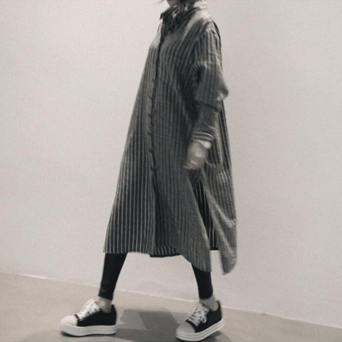 大きいサイズリネン ワンピース ロングワンピ 袖あり シャツワンピ ストライプ ナチュラル コットン リネン混 綿 麻 ミモレ丈 春 夏 レディース 長袖 ワンピ ドレス カジュアル きれいめ ゆったり 体型カバー レイヤード スリット グレー 20代 30代 40代 50代