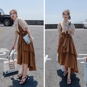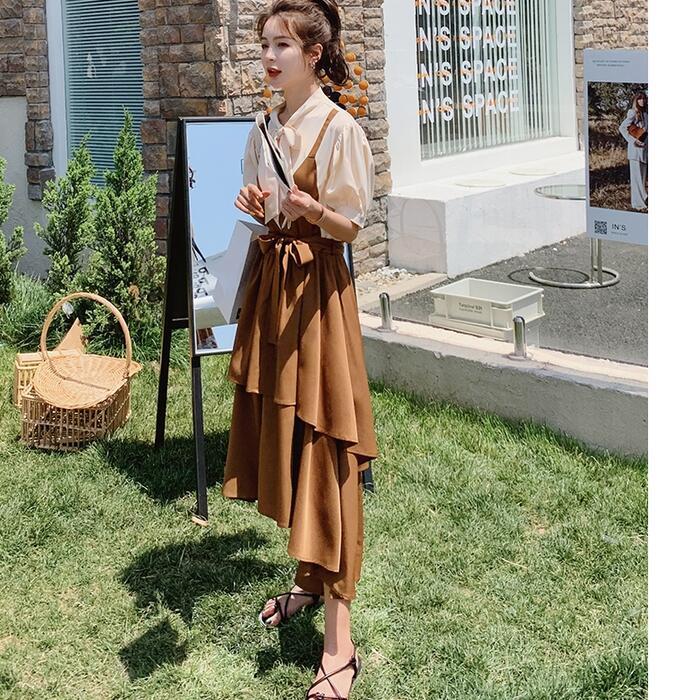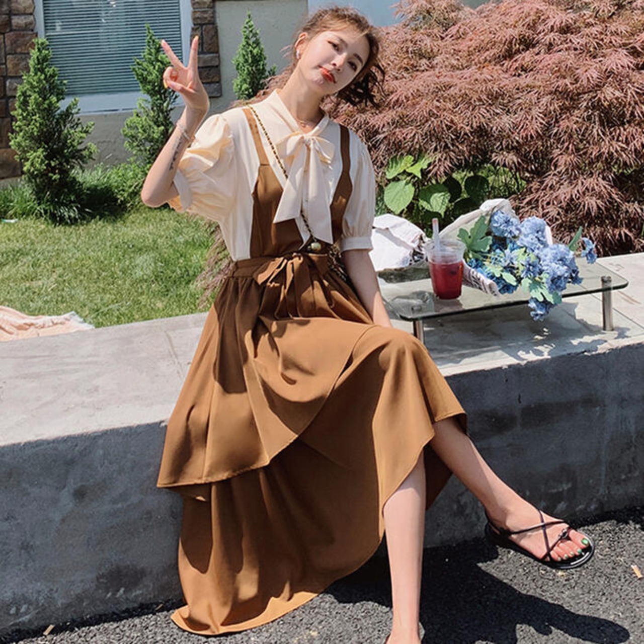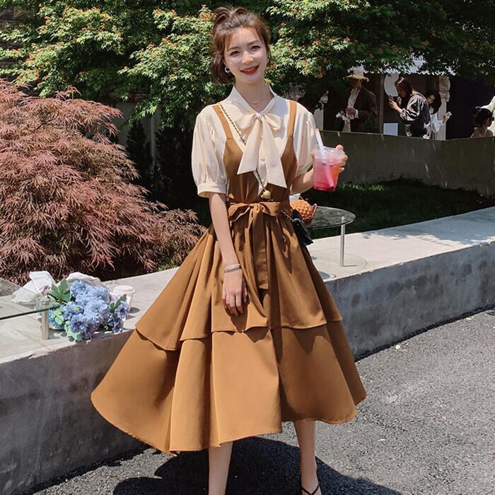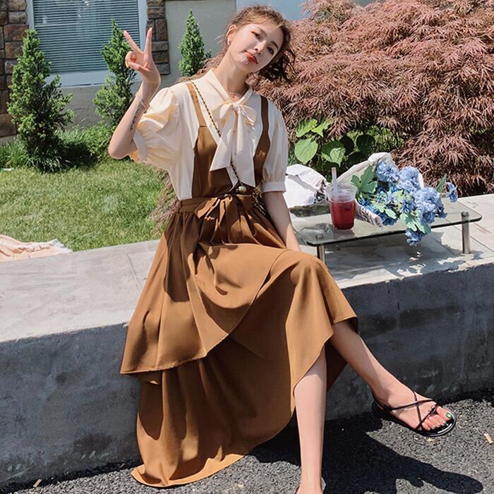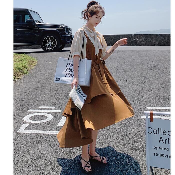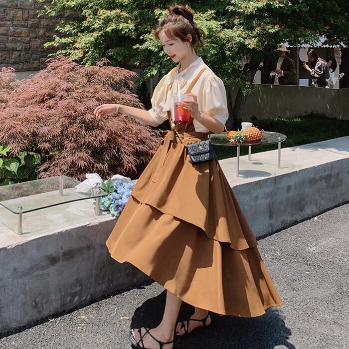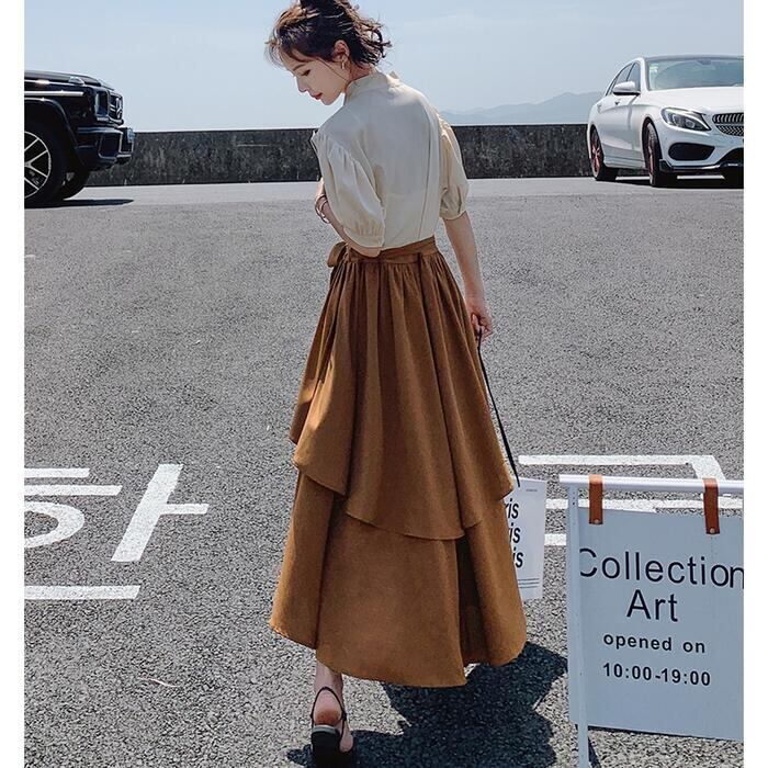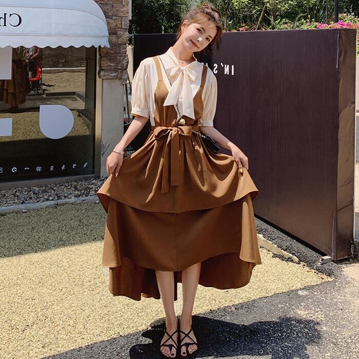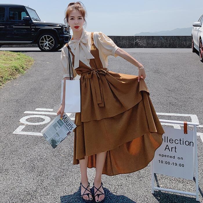 大きいサイズパフスリーブ ワンピース ロングワンピ 袖あり レイヤード風 切り替え レディース きれいめ カジュアル ミモレ丈 半袖 五分袖 リボン おしゃれ 大人 可愛い フレア ワンピ ドレス フェミニン ブラウン 春 秋 夏 20代 30代 40代 50代