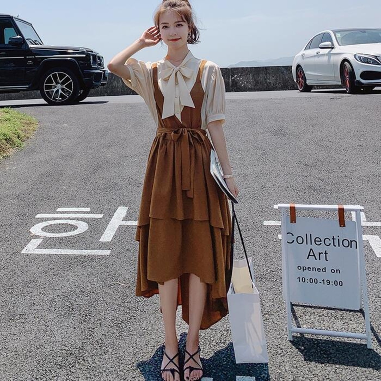 リボンやパフスリーブなど、フェミニンなディテールを詰め込んだレイヤード風ワンピース。