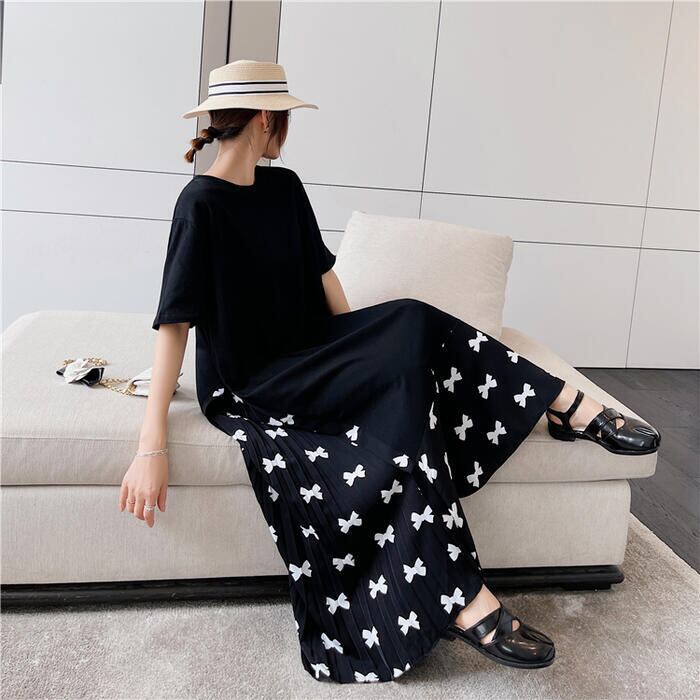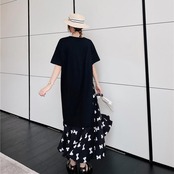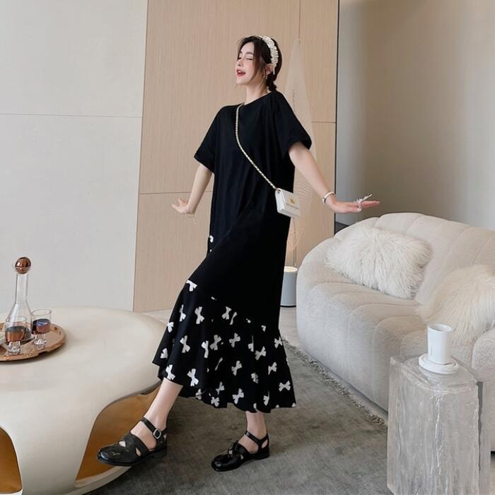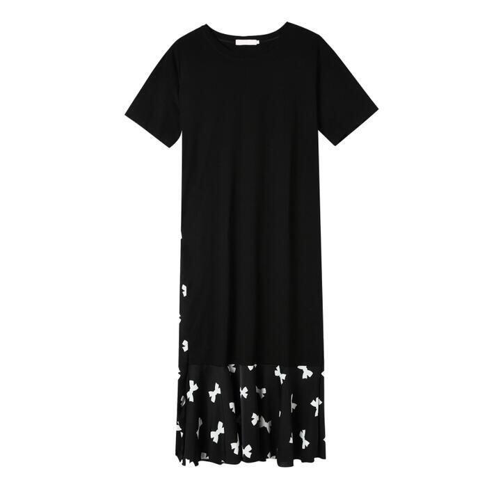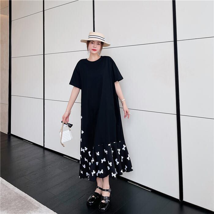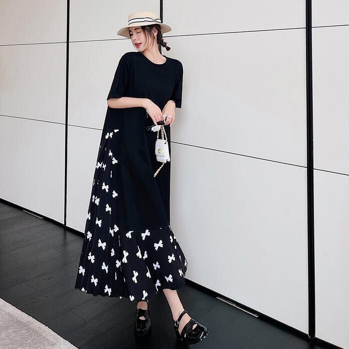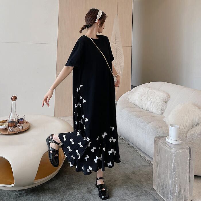 大きいサイズ 体型カバーワンピース ロングワンピ 袖あり レイヤード風 リボン 切り替え レディース エレガント きれいめ カジュアル ロング丈 半袖 プリーツ おしゃれ 大人 可愛い ゆったり ワンピ ドレス フェミニン ブラック 黒 春 秋 夏 20代 30代 40代 50代