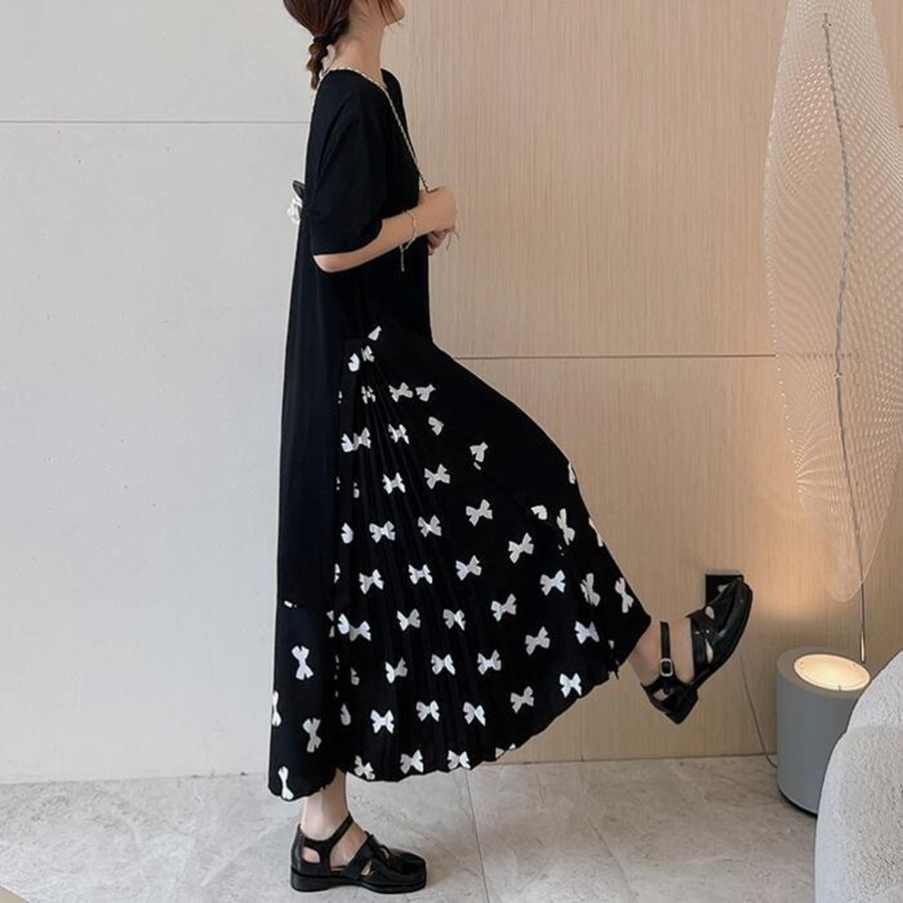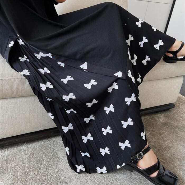 リボンプリントのサイド部分はプリーツになった、こだわりのデザイン。