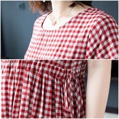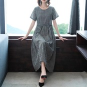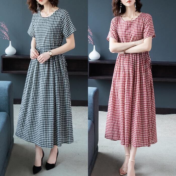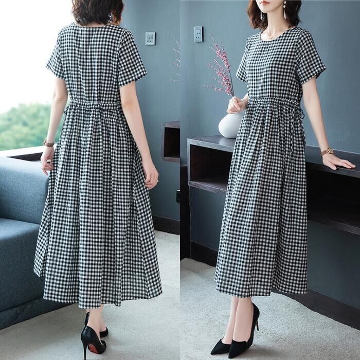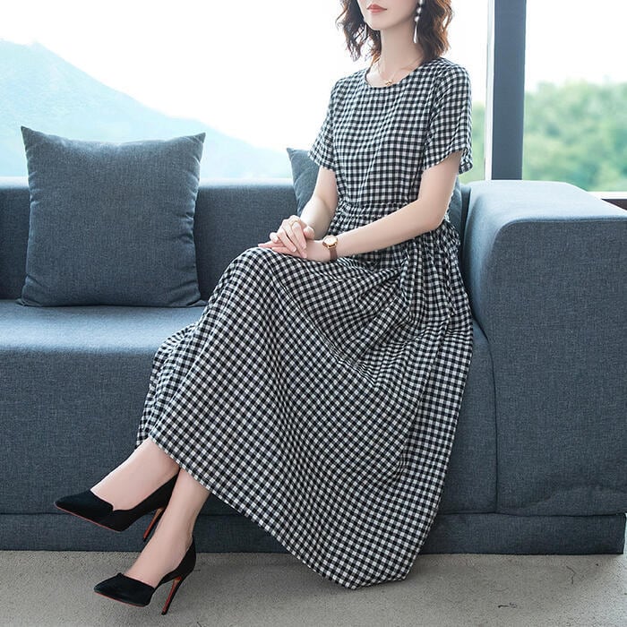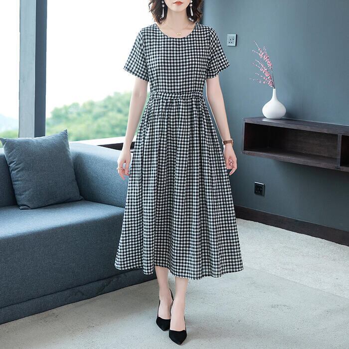 大人可愛いギンガムチェック柄の綿麻ワンピース。