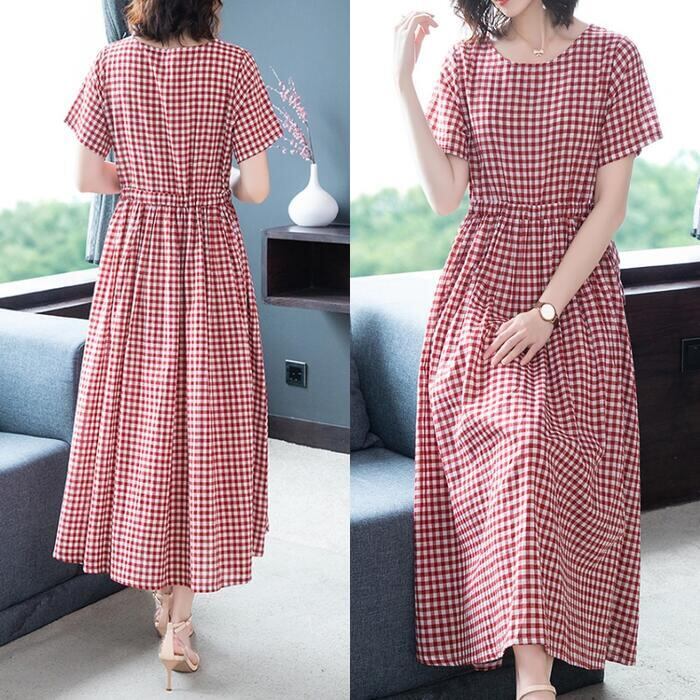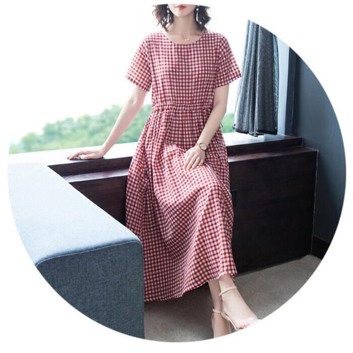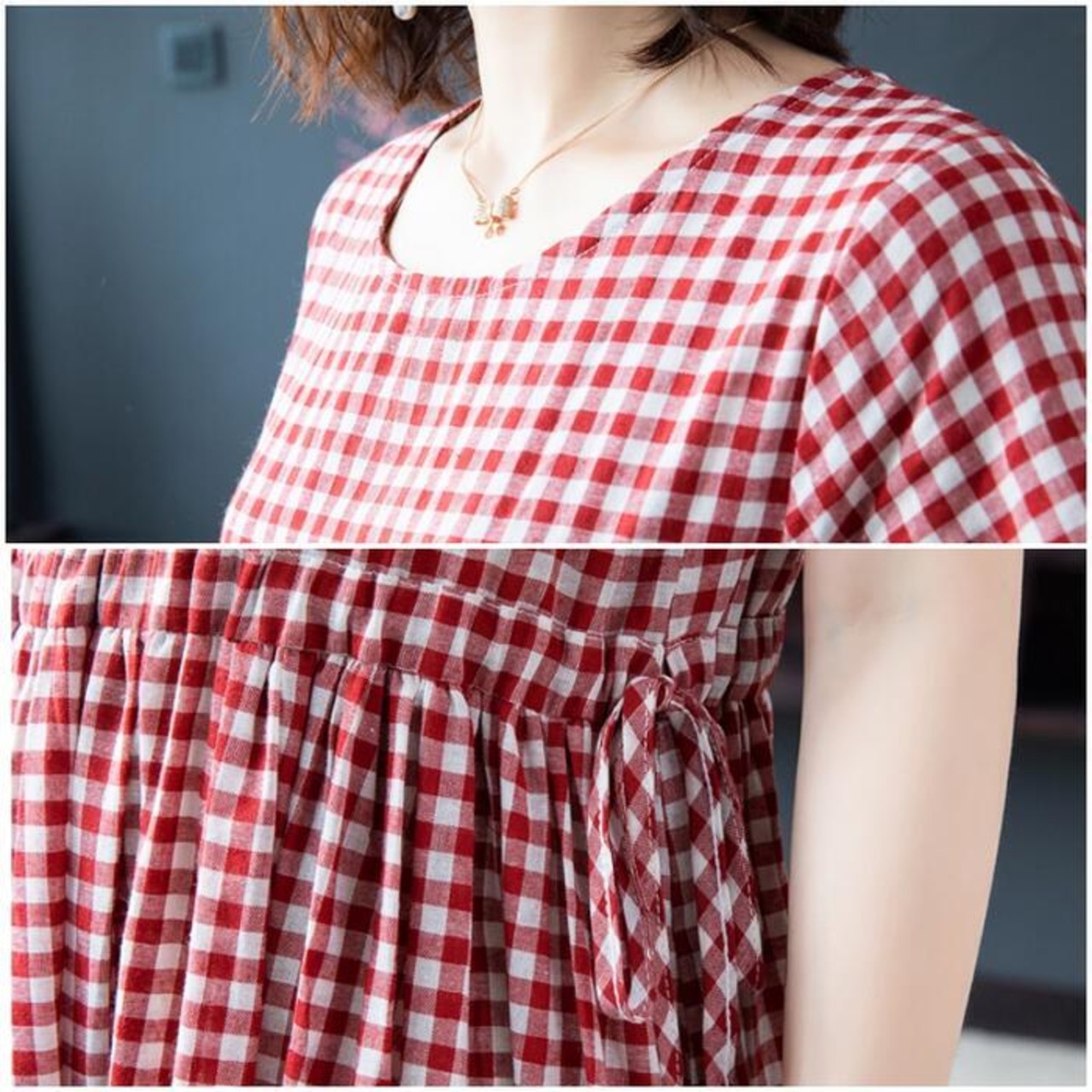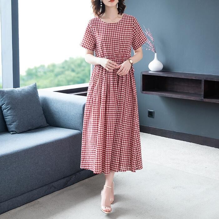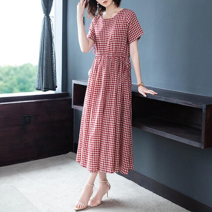 全2色 大きいサイズリネン ワンピース 袖あり ロングワンピ ギンガムチェック ナチュラル 薄手 涼しい リネン混 麻 春 夏 半袖 レディース ワンピ ドレス カジュアル きれいめ フェミニン ロング丈 体型カバー レッド 赤 ブラック 黒 20代 30代 40代 50代