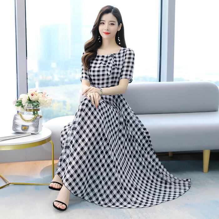 全2色 大きいサイズワンピース ロングワンピ 袖あり ギンガムチェック レディース エレガント きれいめ カジュアル ロング丈 半袖 フレア おしゃれ 大人 可愛い ゆったり ワンピ ドレス ハイウエスト フェミニン レッド 赤 ブラック 黒 春 秋 夏 20代 30代 40代 50代