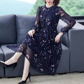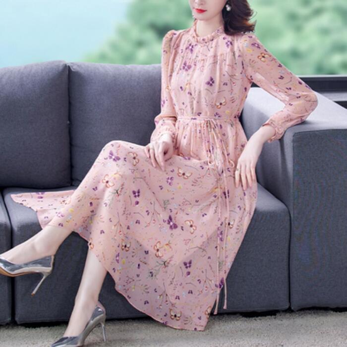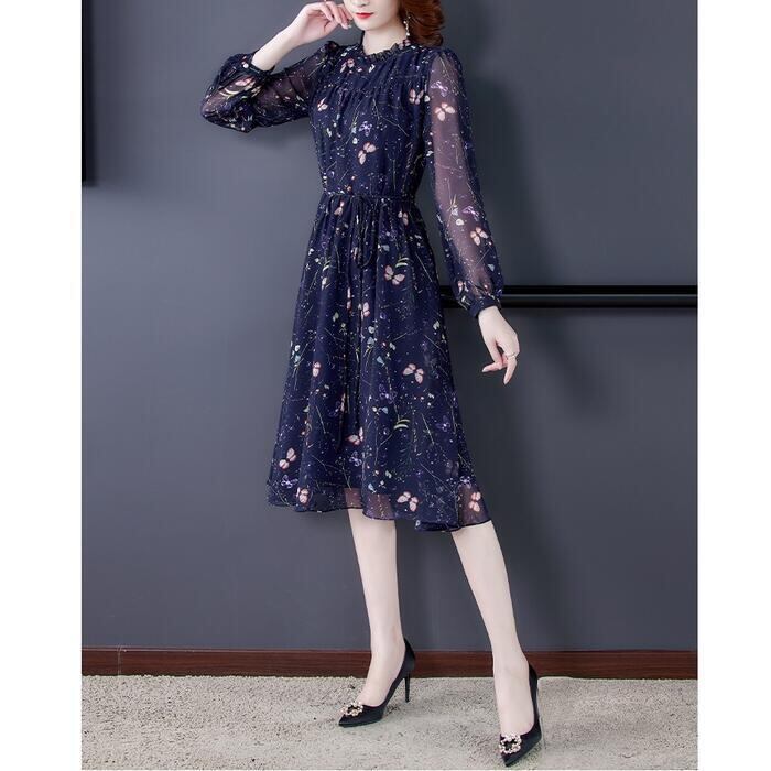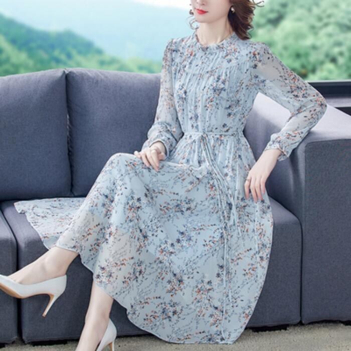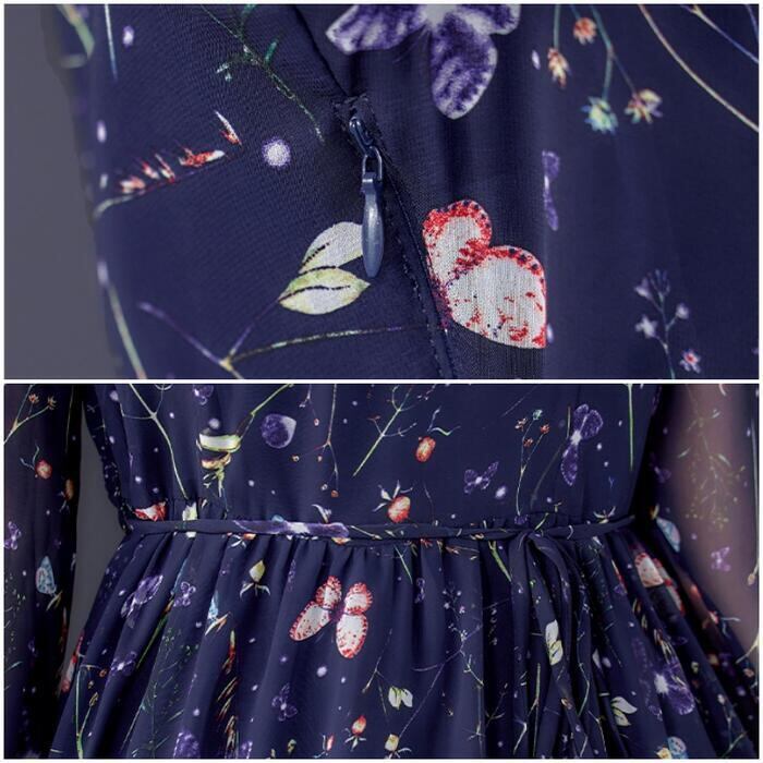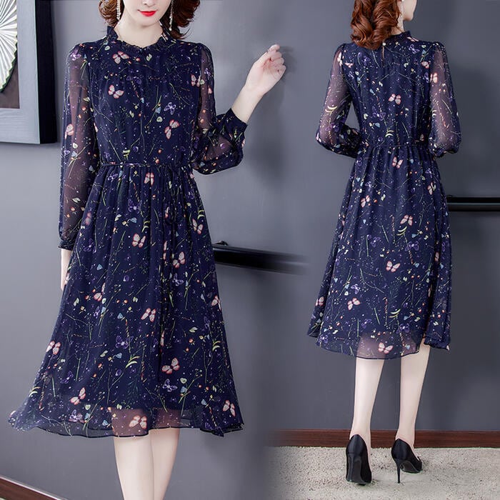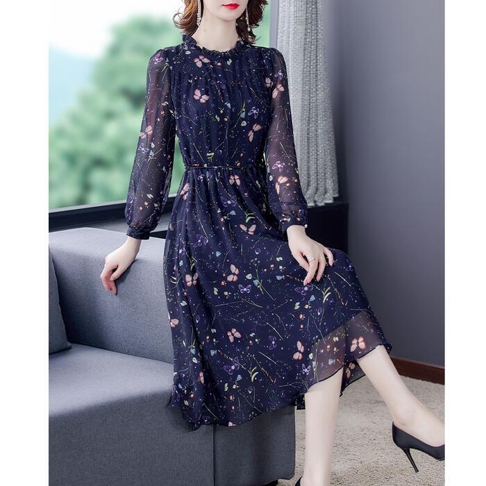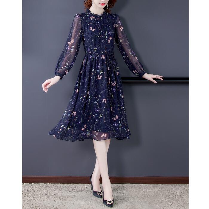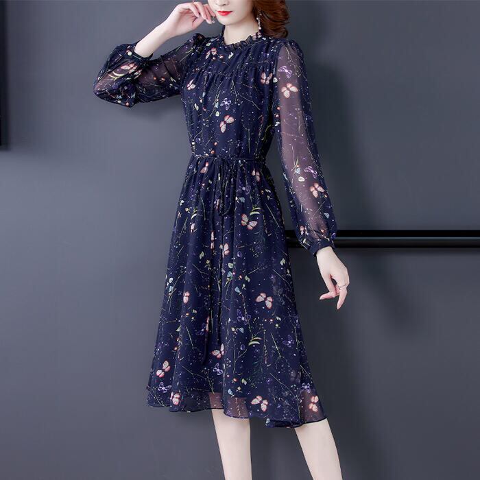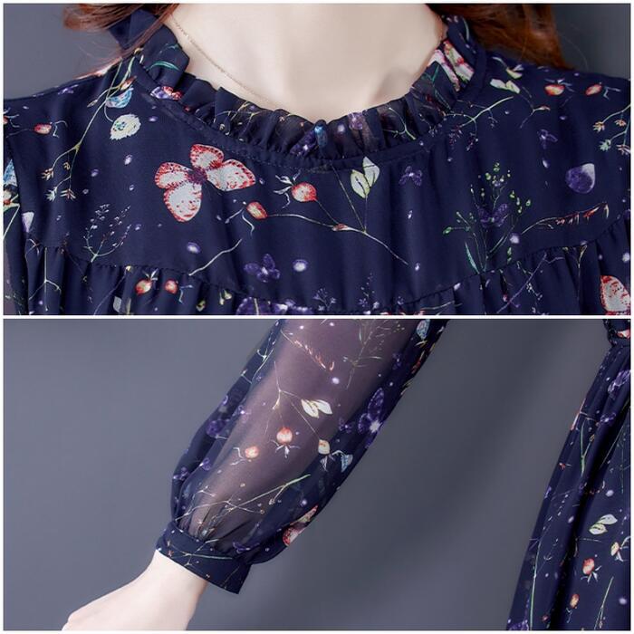 全3色 大きいサイズワンピース ロングワンピ 袖あり レディース 花柄 バタフライ きれいめ カジュアル ミモレ丈 長袖 おしゃれ 大人 可愛い ワンピ ドレス フェミニン シフォン 透け感 体型カバー ウエストリボン ブルー 青 ピンク 春 秋 夏 20代 30代 40代 50代