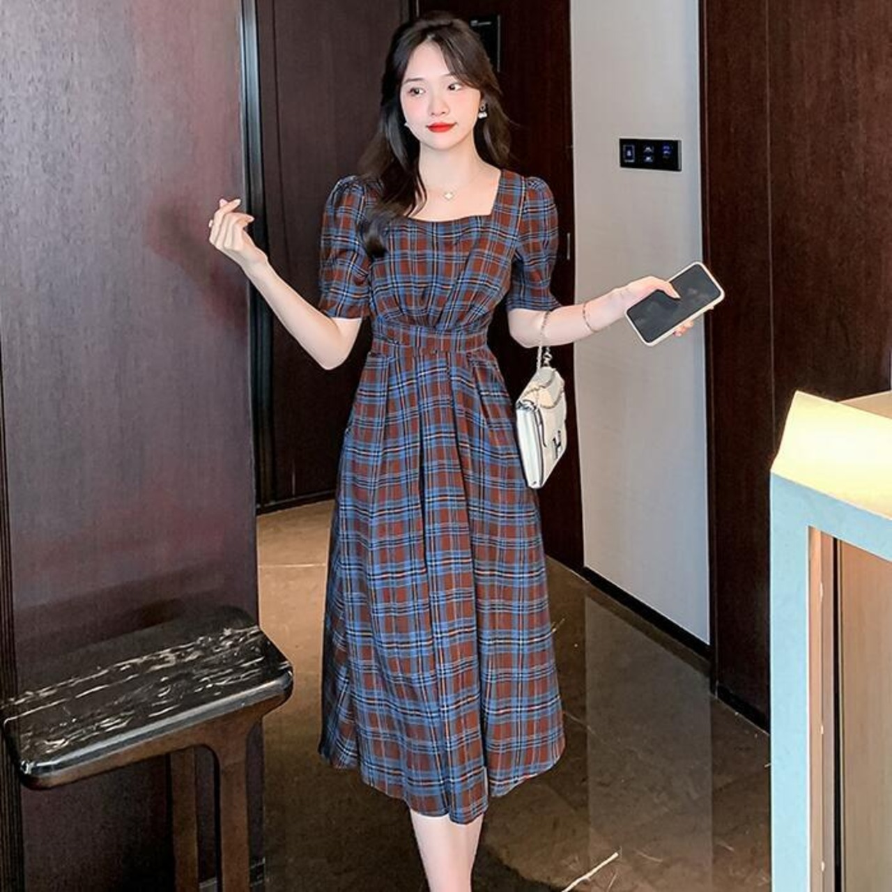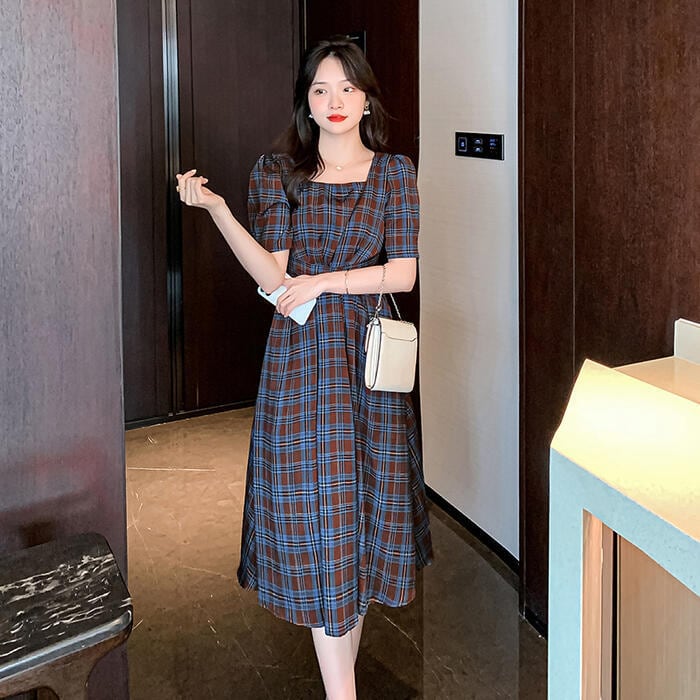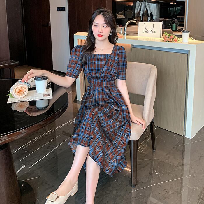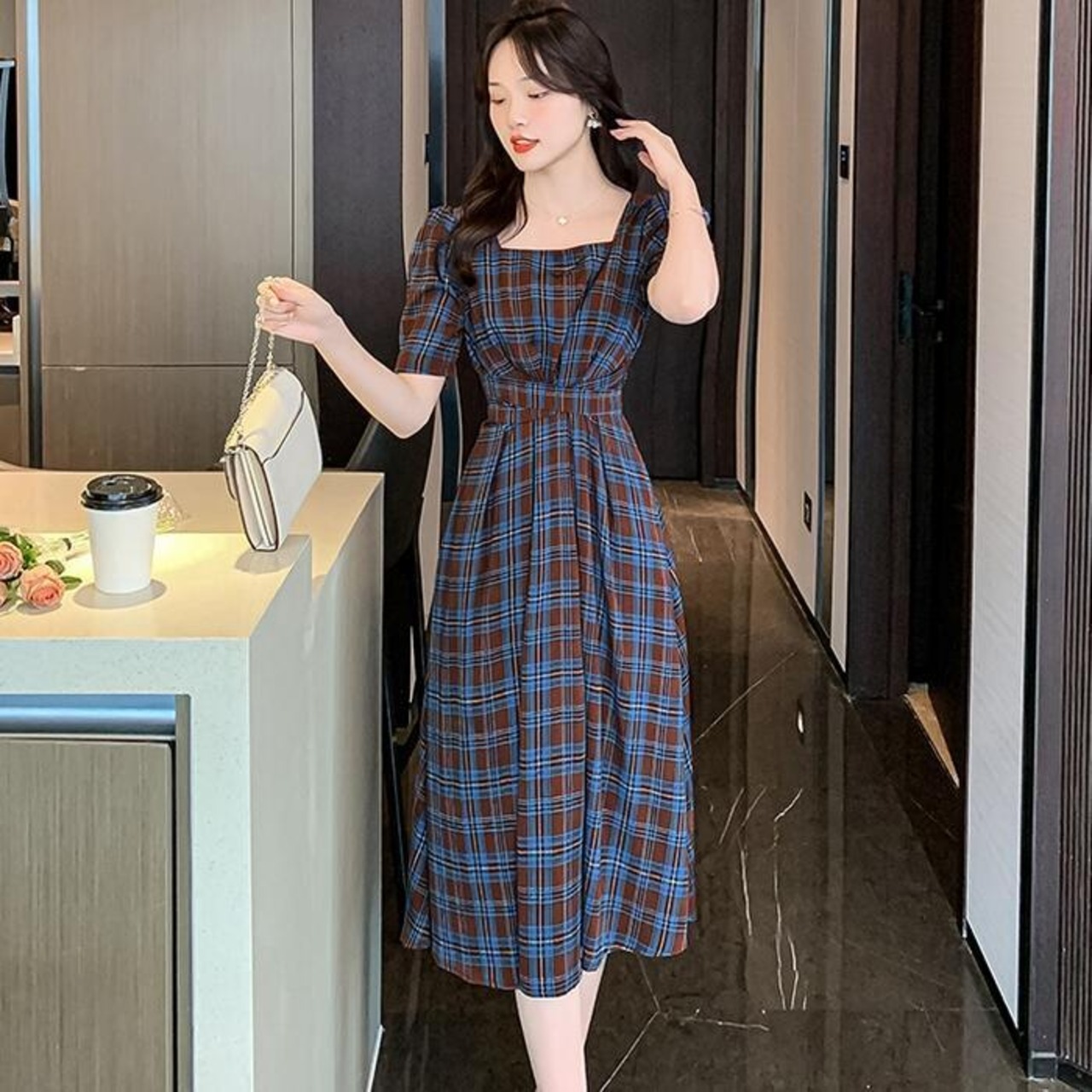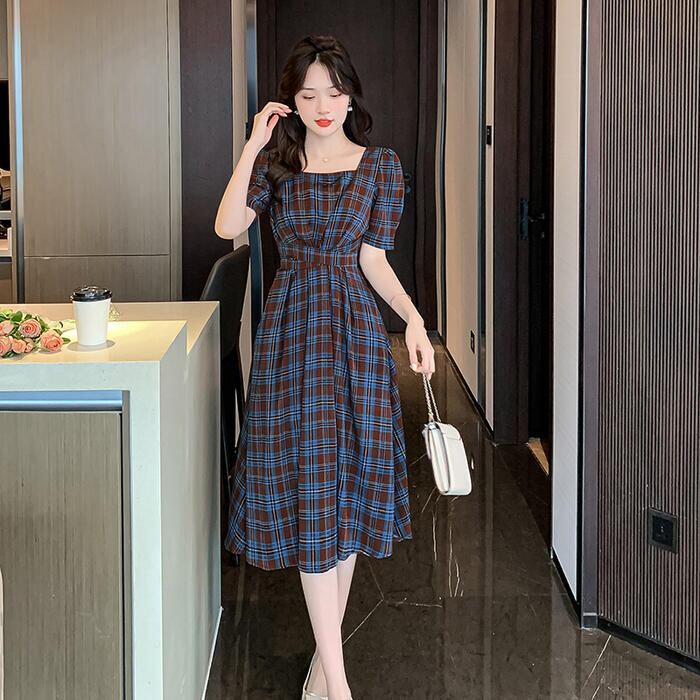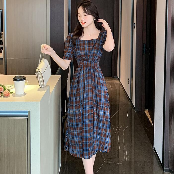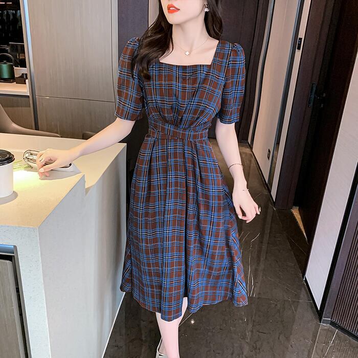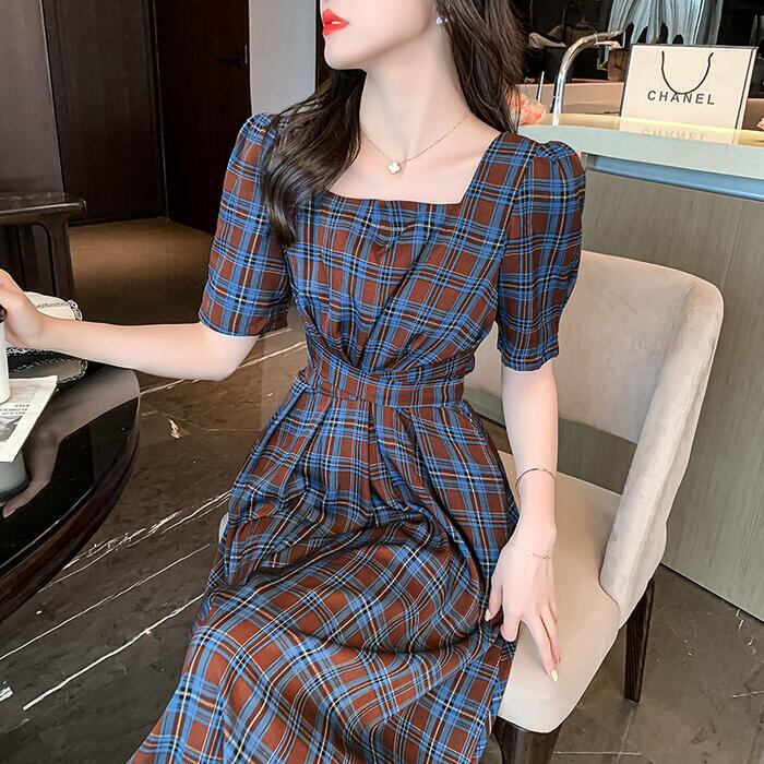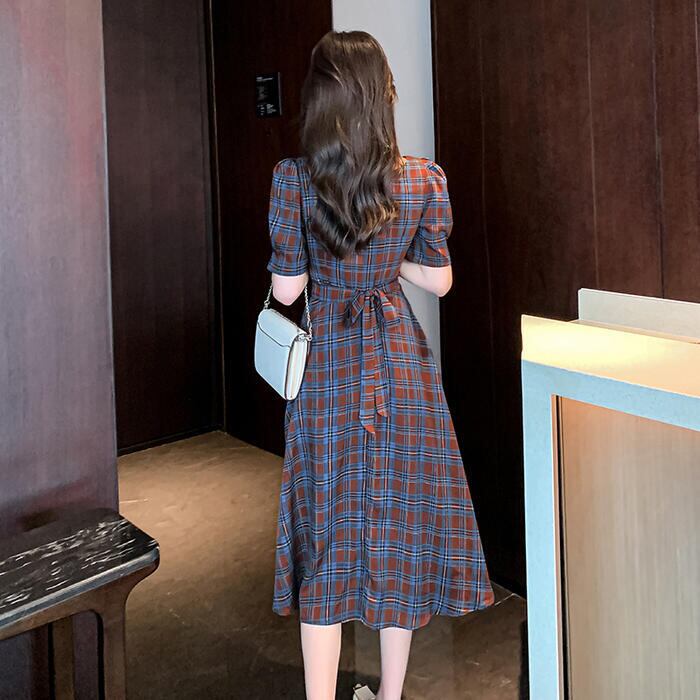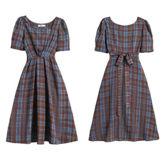 大きいサイズワンピース ロングワンピ 袖あり パワーショルダー レディース チェック柄 きれいめ カジュアル ミモレ丈 半袖 おしゃれ 大人 可愛い ワンピ ドレス フェミニン クラシカル ハイウエスト ウエストリボン 春 秋 夏 20代 30代 40代 50代