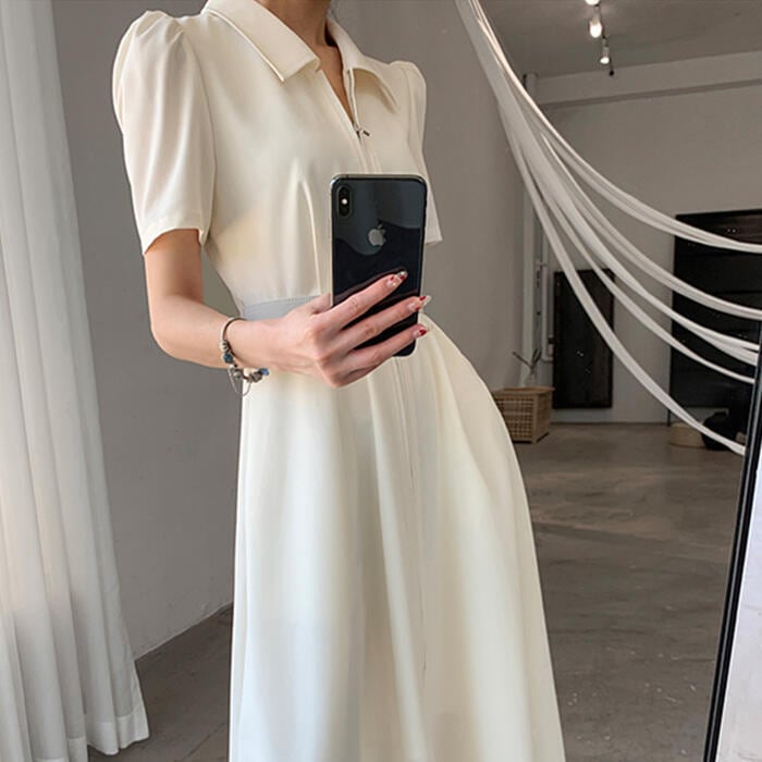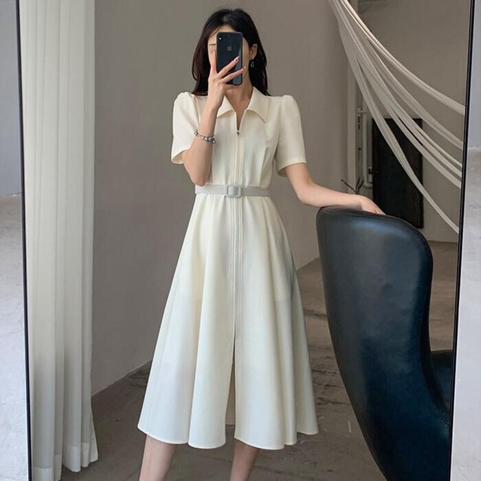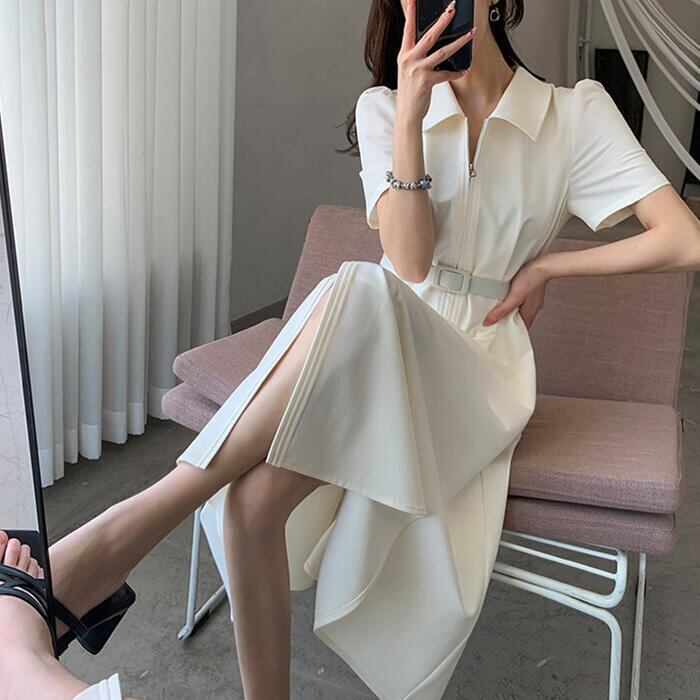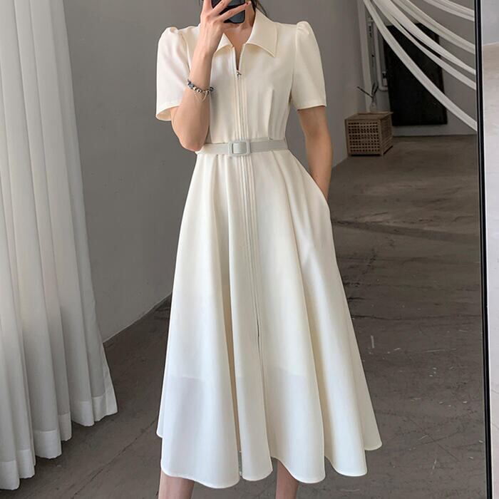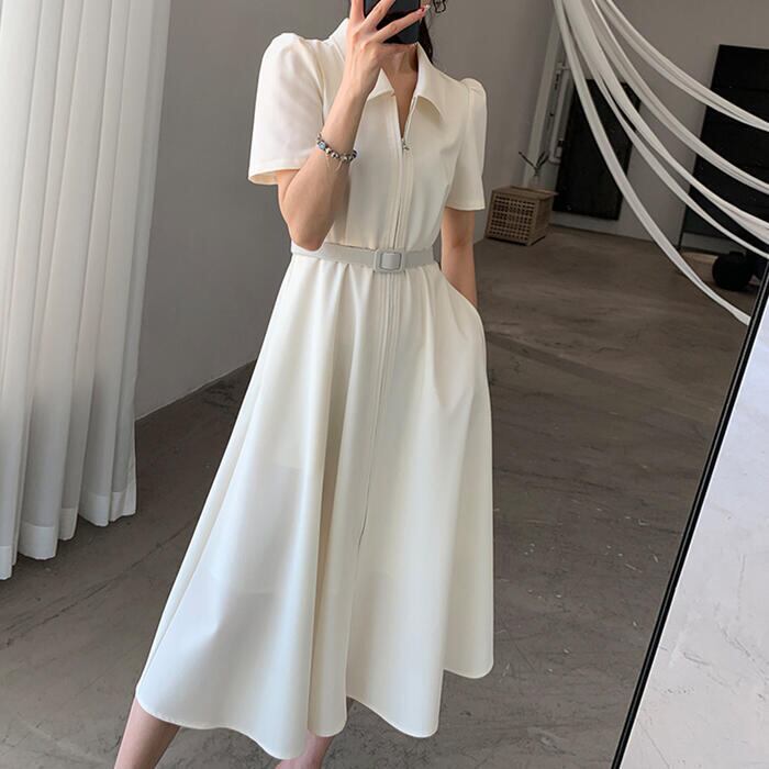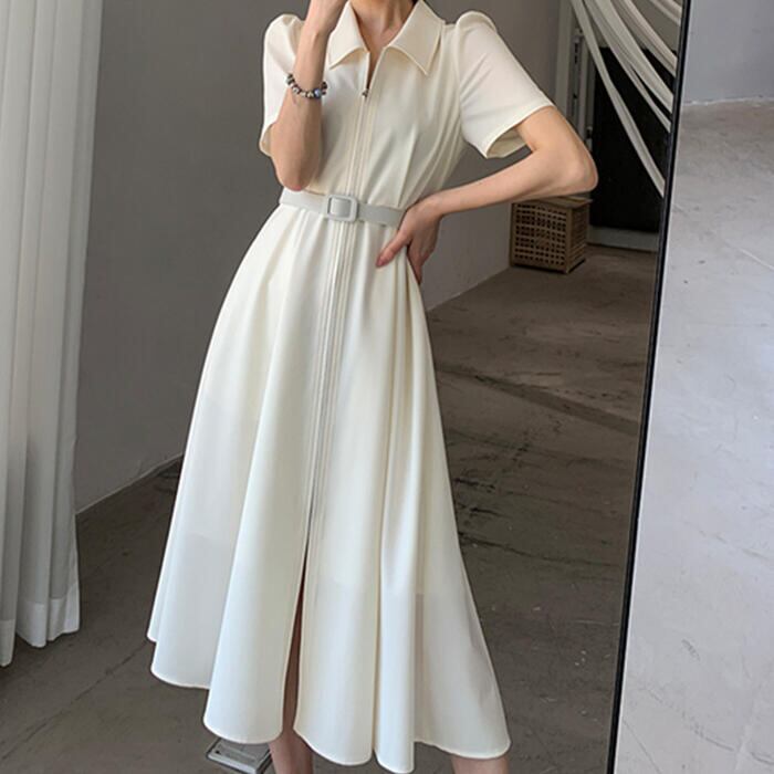 大きいサイズワンピース ロングワンピ 袖あり レディース きれいめ カジュアル ミモレ丈 半袖 おしゃれ 大人 可愛い ワンピ ドレス フェミニン ジップアップ スリット ハイウエスト ウエストベルト ベージュ 春 秋 夏 20代 30代 40代 50代
