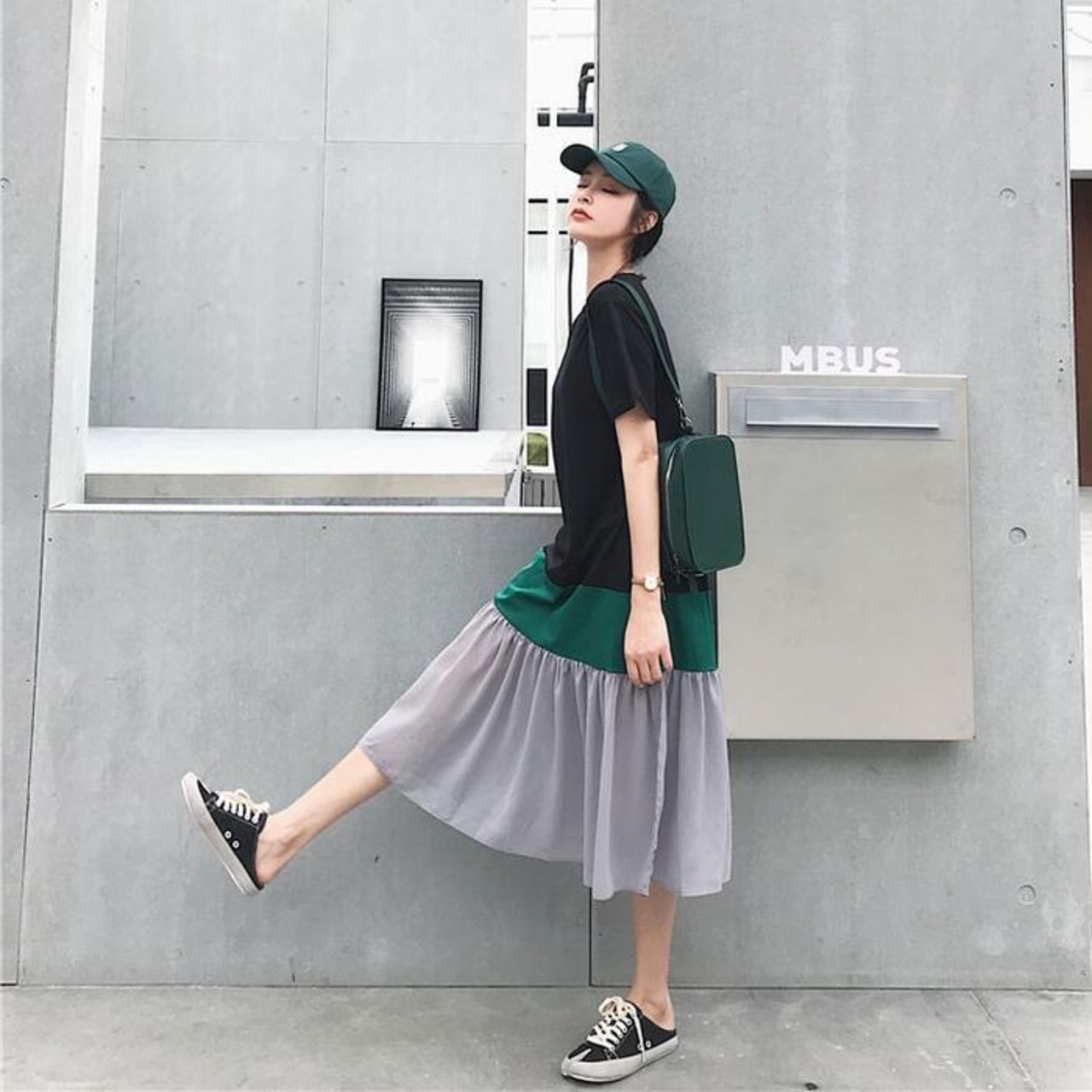 マルチカラーが可愛い切り替えワンピース。