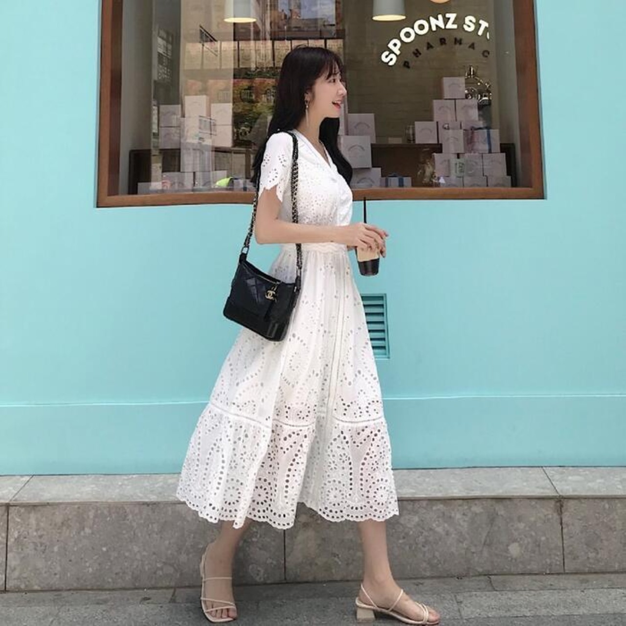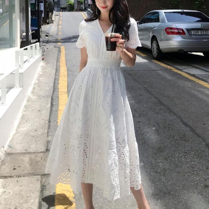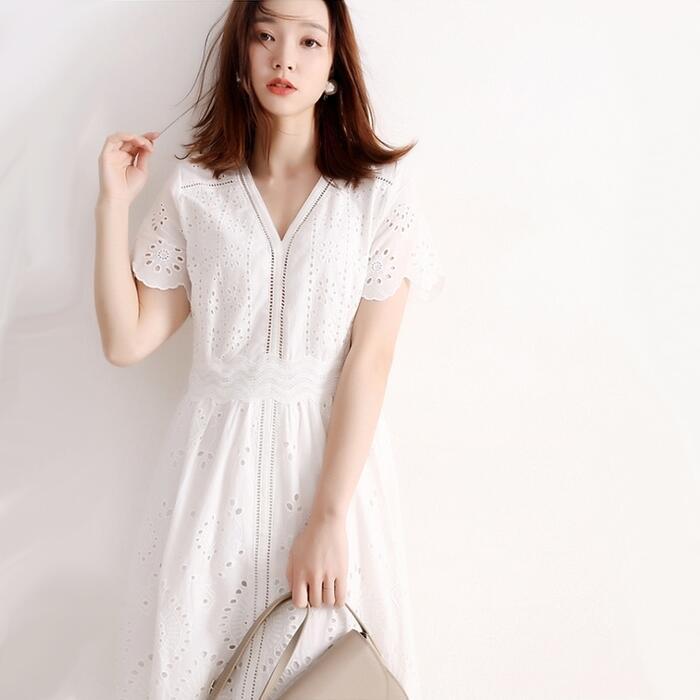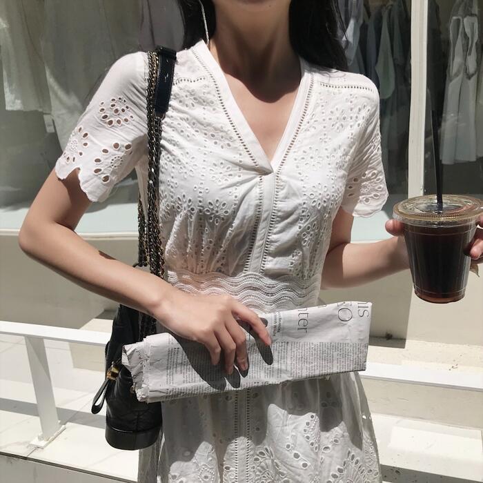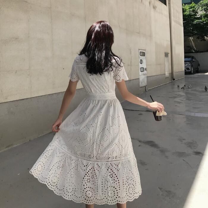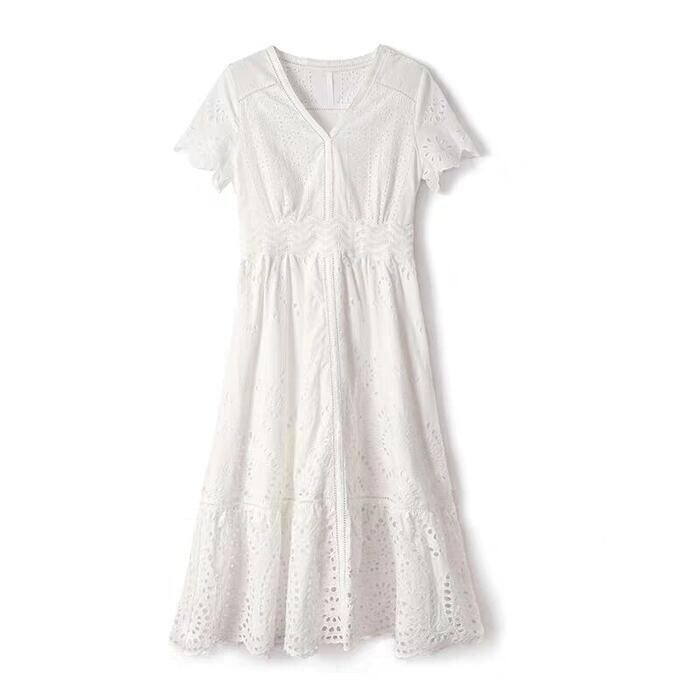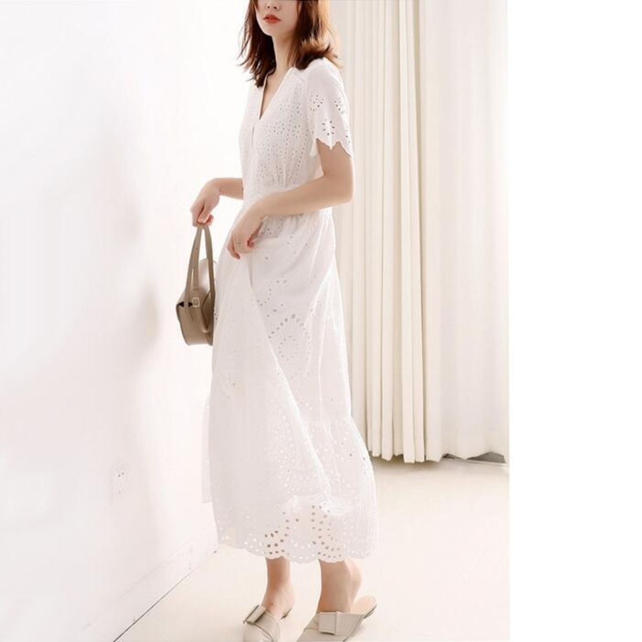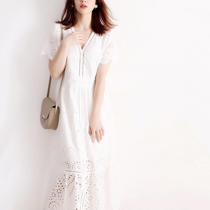 大きいサイズワンピース ロングワンピ 袖あり レース カットワーク レディース きれいめ カジュアル ミモレ丈 半袖 切り替え おしゃれ 大人 可愛い ワンピ ドレス フェミニン ゆったり 体型カバー ホワイト 白 春 秋 夏 20代 30代 40代 50代