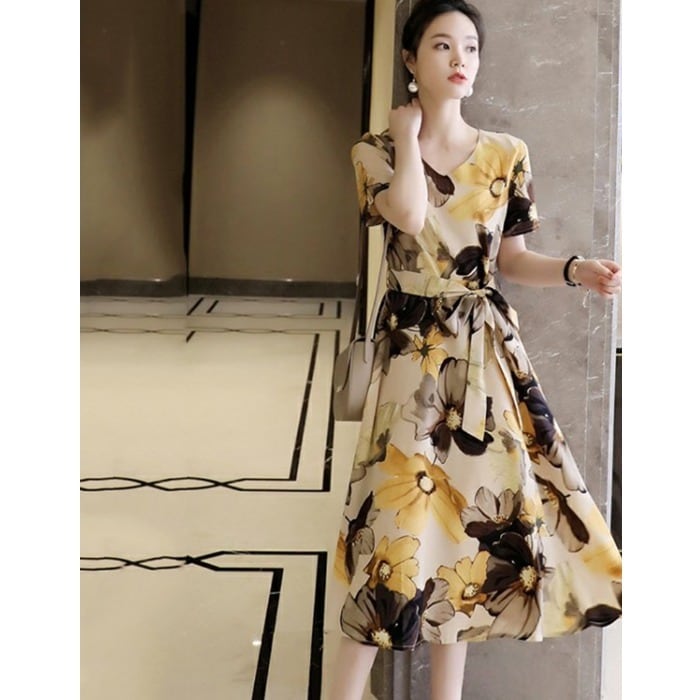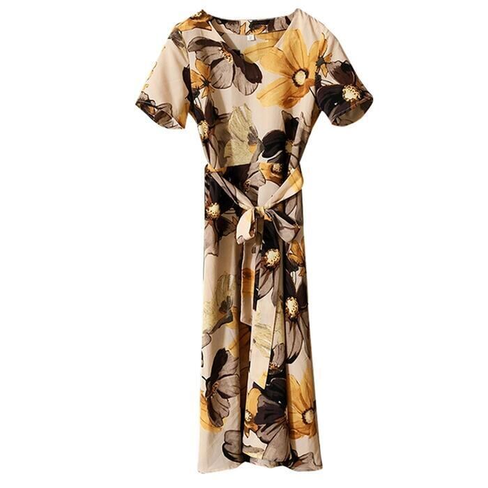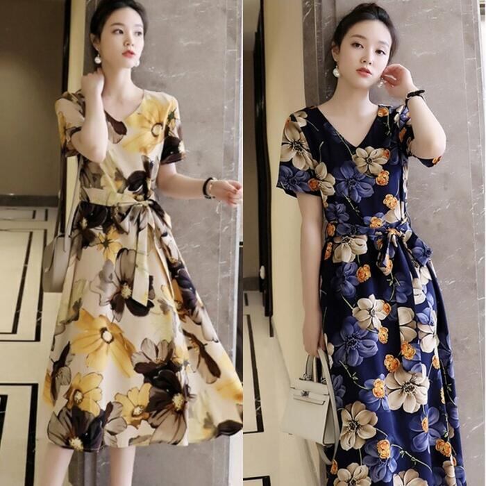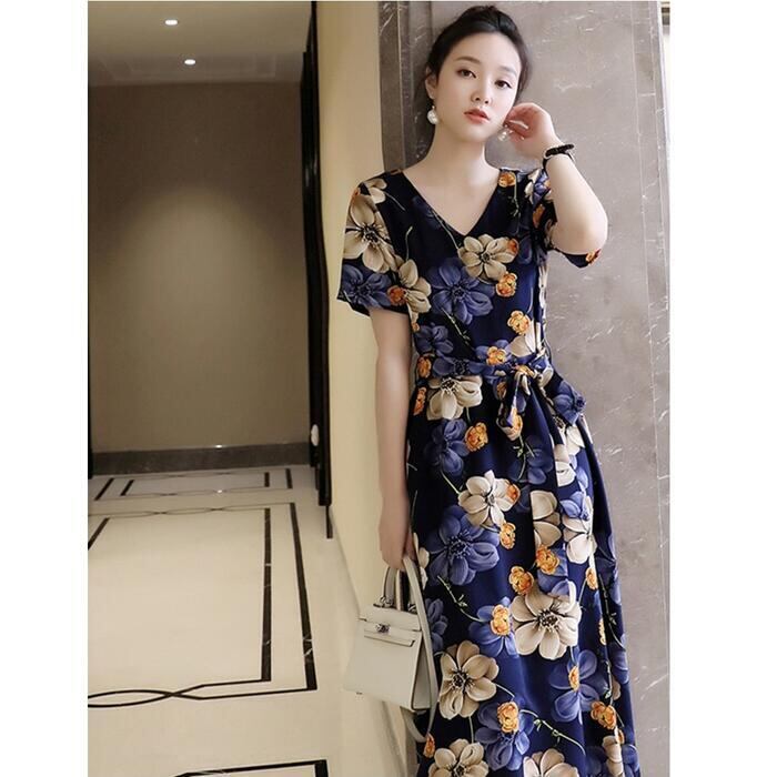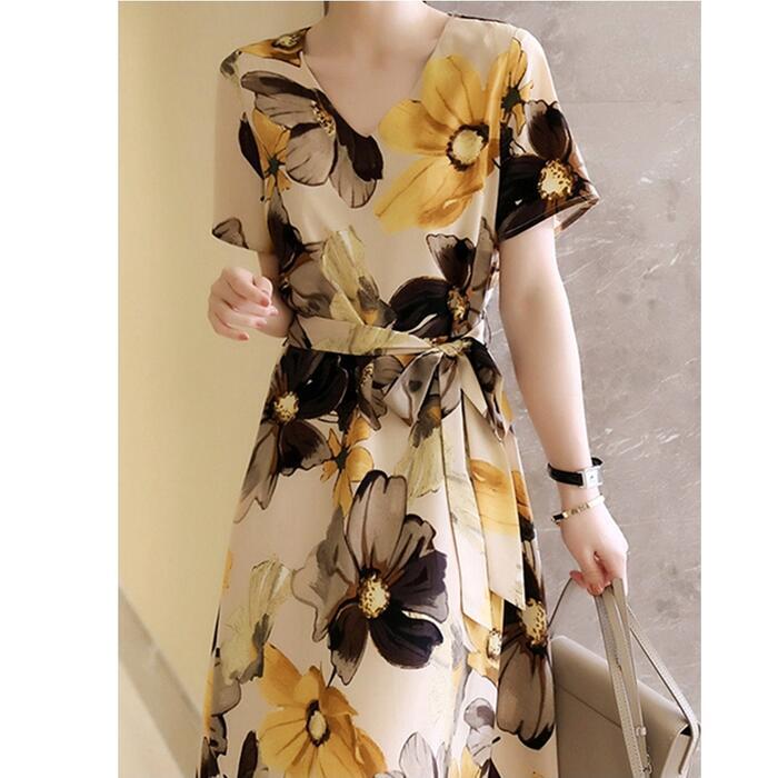 全2色 大きいサイズワンピース ロングワンピ 袖あり 花柄 レディース エレガント きれいめ カジュアル ミモレ丈 半袖 おしゃれ 大人 可愛い ワンピ ドレス フェミニン Vネック ウエストリボン ゆったり 体型カバー ブルー 青 ベージュ 春 秋 夏 20代 30代 40代 50代