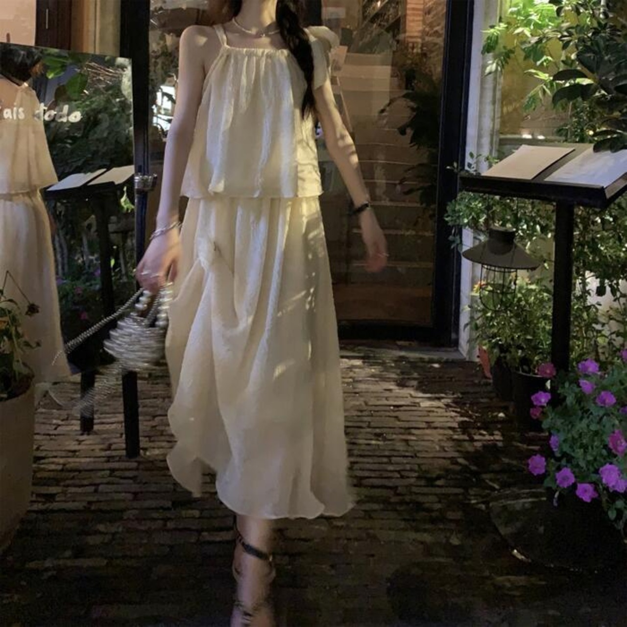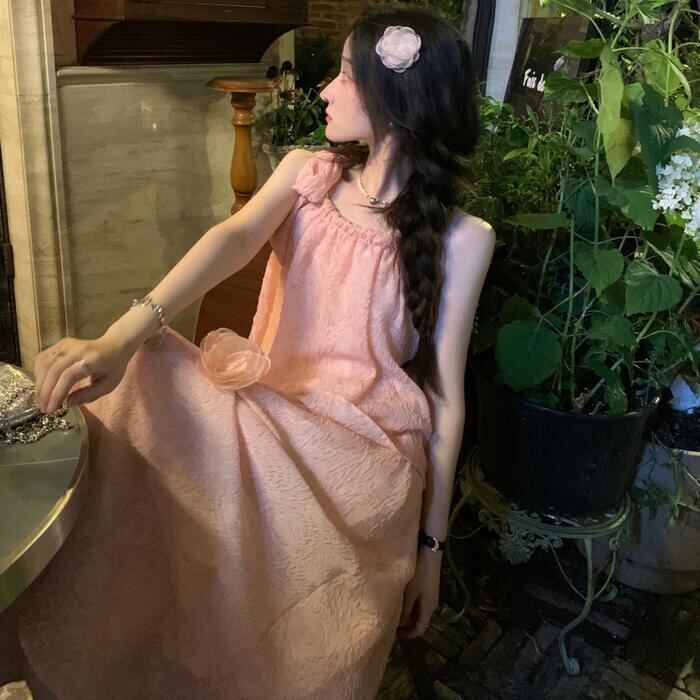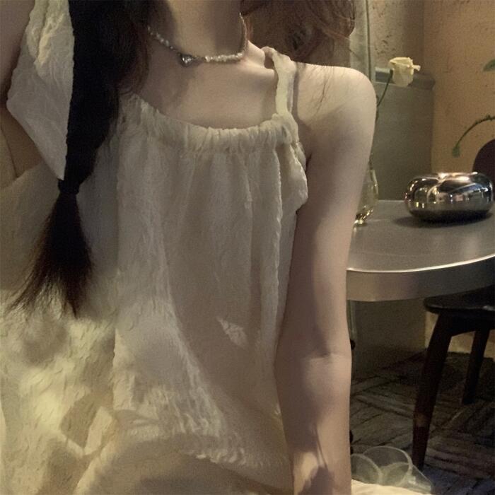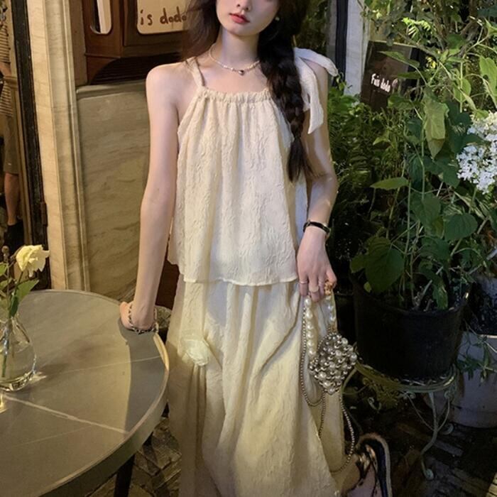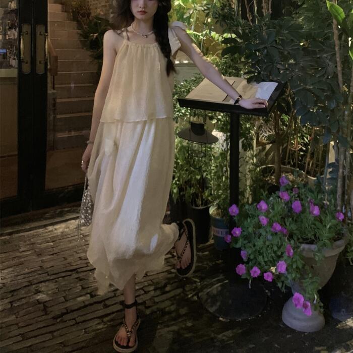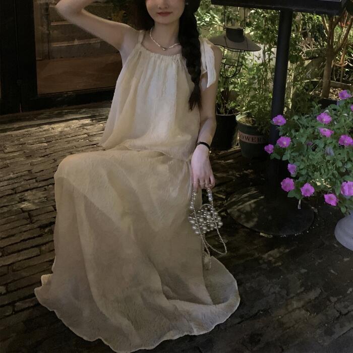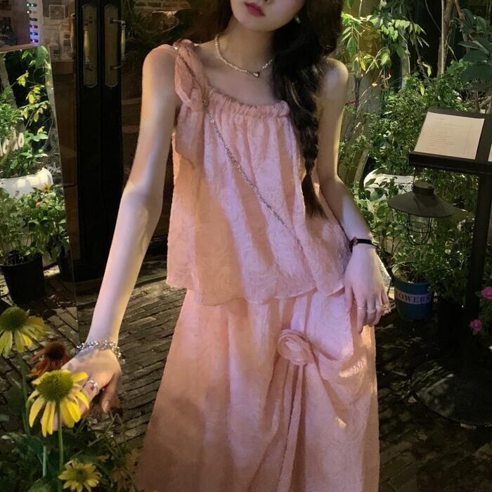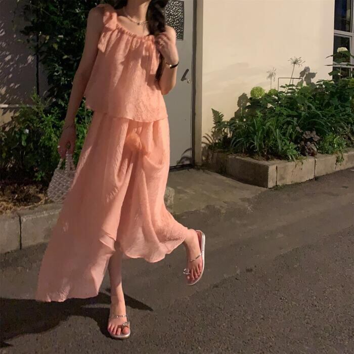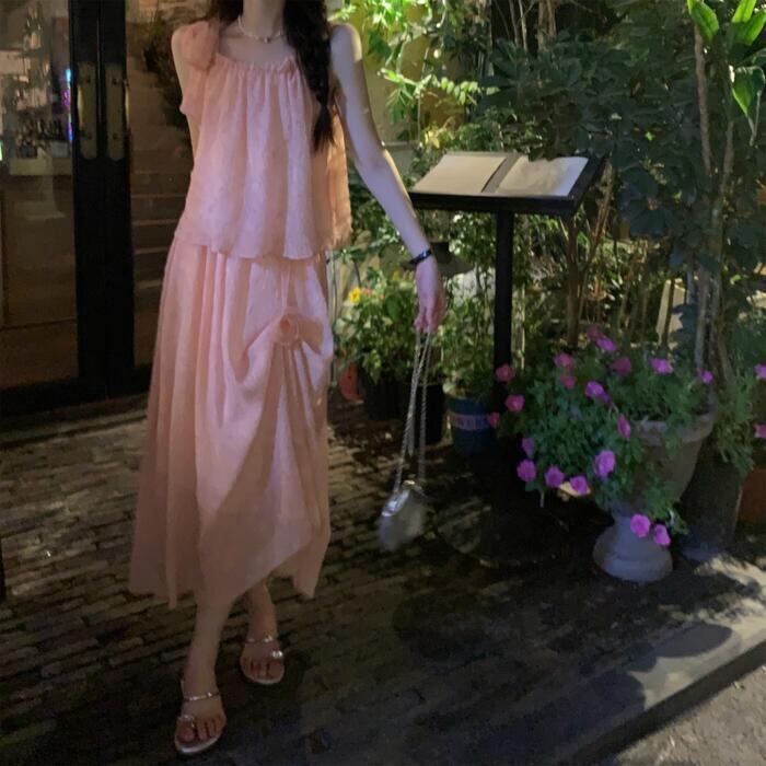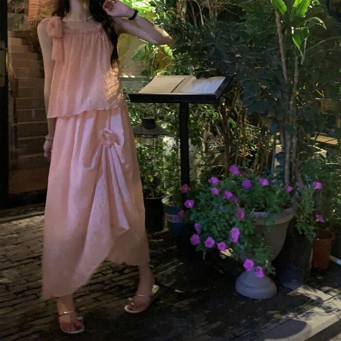 全2種2色 トップス キャミソール スカート リンクル セットアップ ミモレ丈 ノースリーブ おしゃれ 大人 可愛い きれいめ カジュアル リボン コサージュ 花 フェミニン リラックス 楽ちん ベージュ ピンク 春 夏 秋 20代 30代 40代 50代