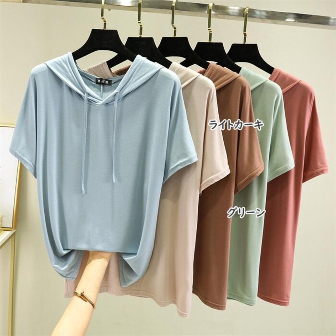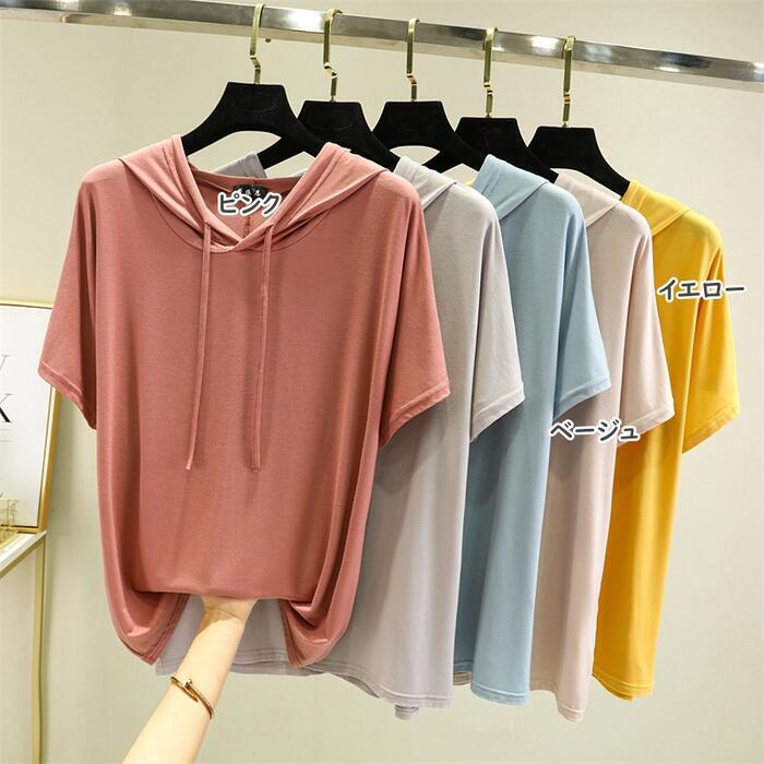 豊富なカラーバリエーションが魅力のフード付き半袖Tシャツ。