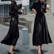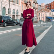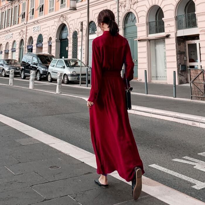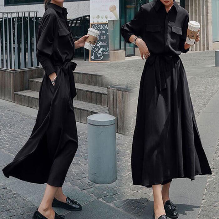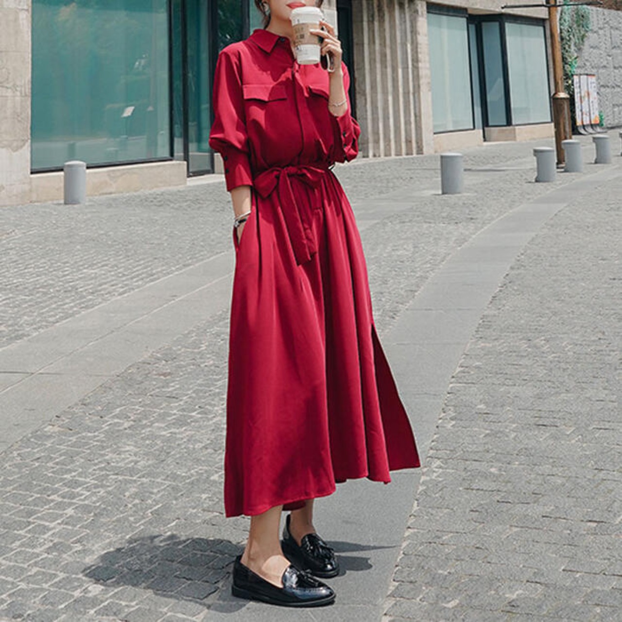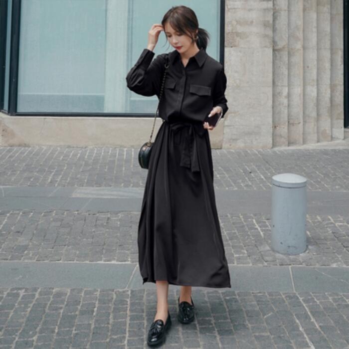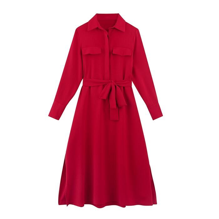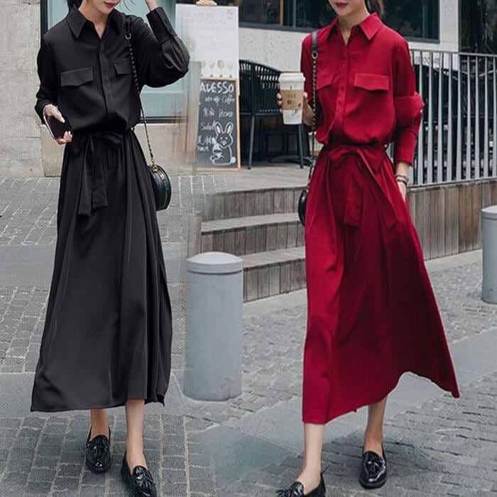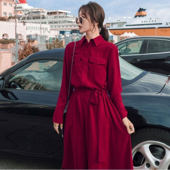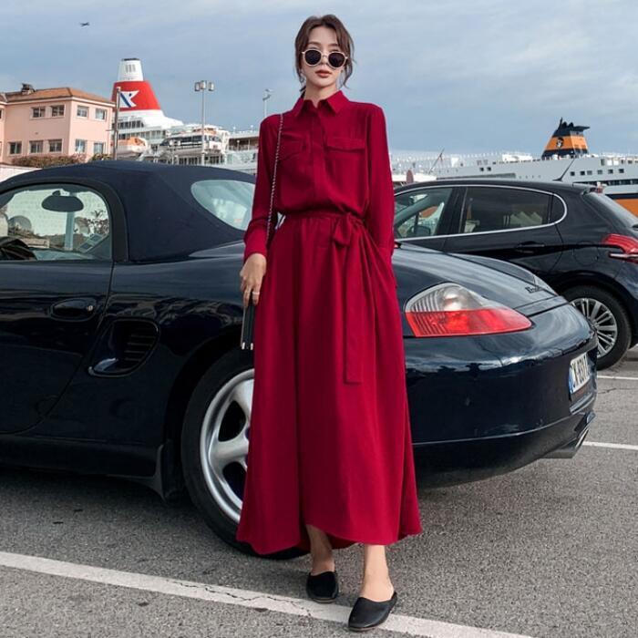 全2色 大きいサイズワンピース ロングワンピ 袖あり シャツワンピ レディース エレガント きれいめ カジュアル ロング丈 長袖 おしゃれ 大人 可愛い ワンピ ドレス フェミニン ウエストリボン シンプル レッド 赤 ブラック 黒 春 秋 冬 20代 30代 40代 50代