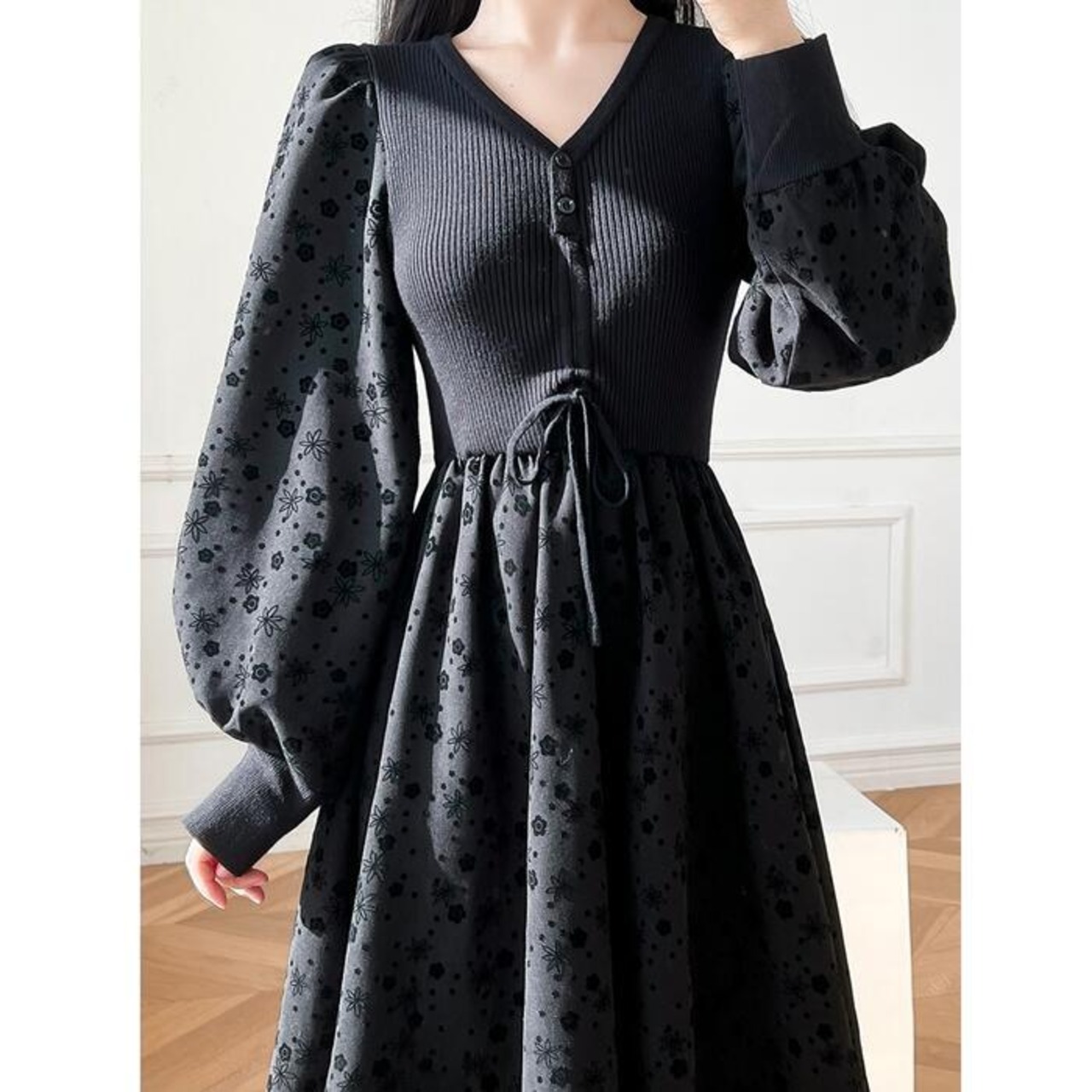 大きいサイズワンピース ロングワンピ 袖あり ボリュームスリーブ ニット 花柄 レディース エレガント きれいめ カジュアル ミモレ丈 長袖 おしゃれ 大人 可愛い ワンピ ドレス フェミニン ブラック 黒 春 秋 冬 20代 30代 40代 50代