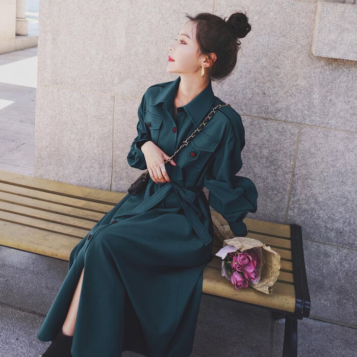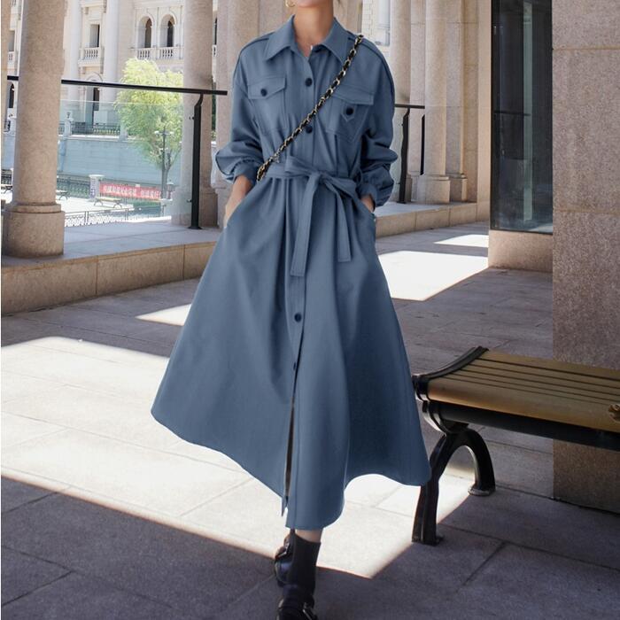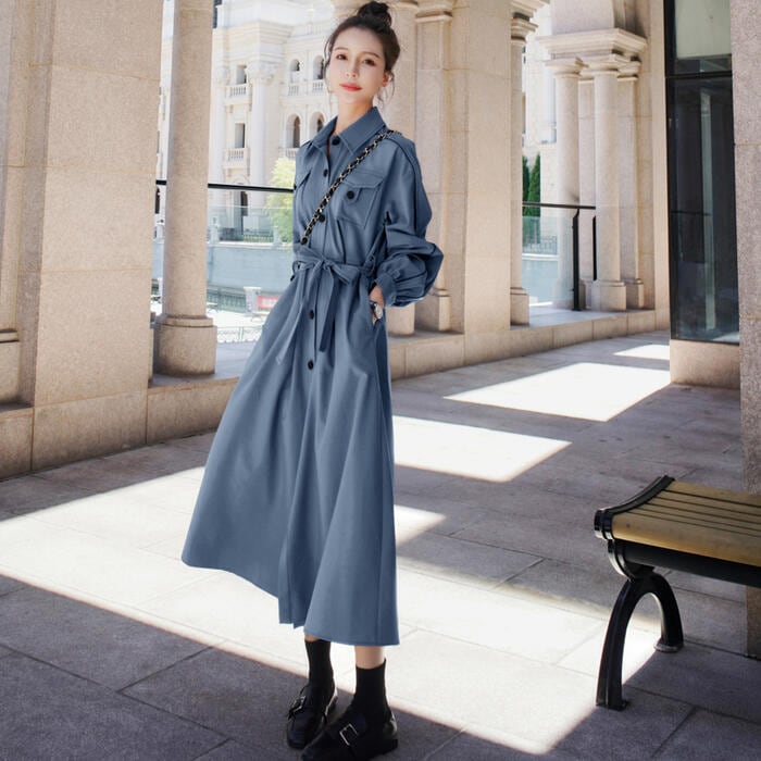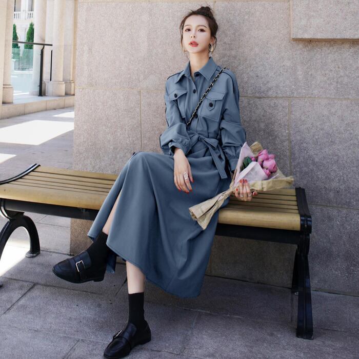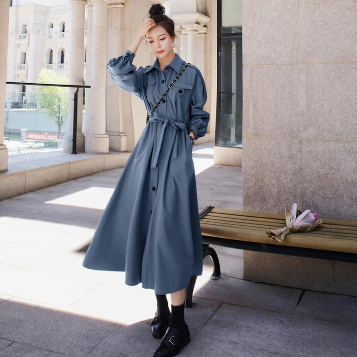 全2色 大きいサイズワンピース ロングワンピ 袖あり シャツワンピ レディース きれいめ カジュアル ロング丈 長袖 おしゃれ 大人 可愛い ワンピ ドレス 羽織り フェミニン ウエストリボン ブルー 青 グリーン 緑 春 秋 冬 20代 30代 40代 50代
