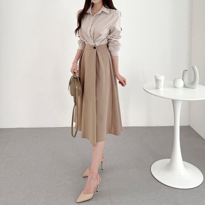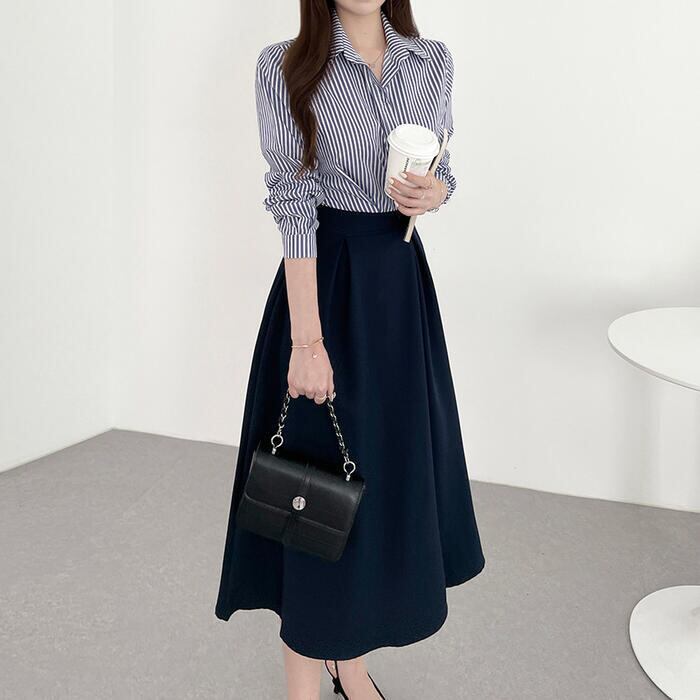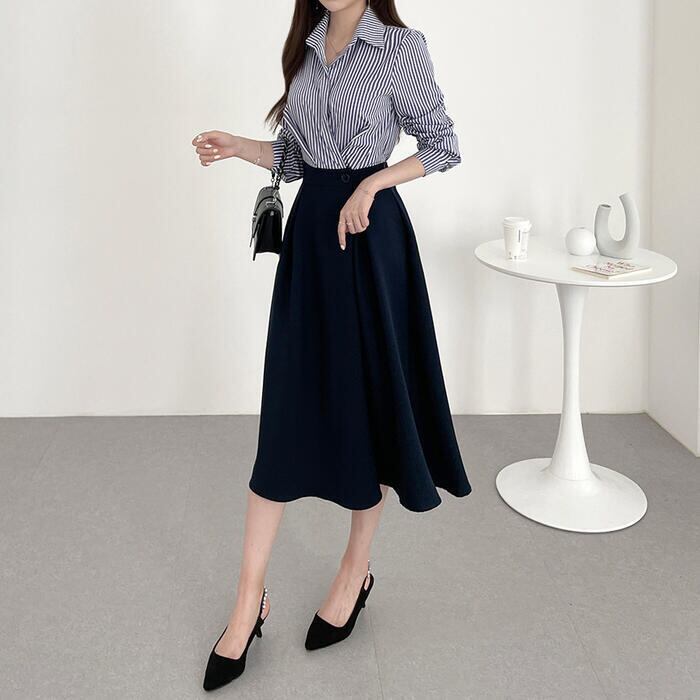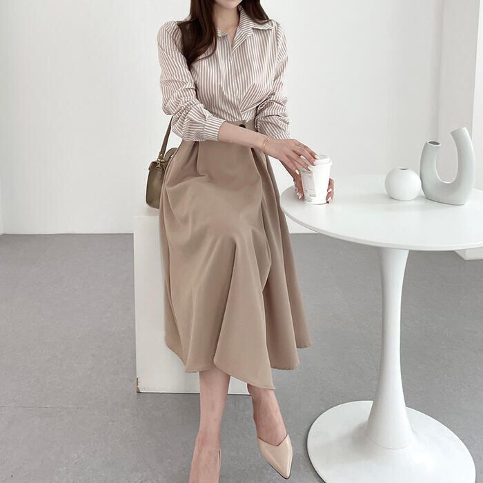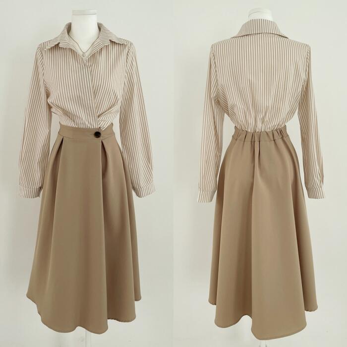 ストライプ柄シャツにスカートを合わせたようなセパレート風デザインのワンピース。