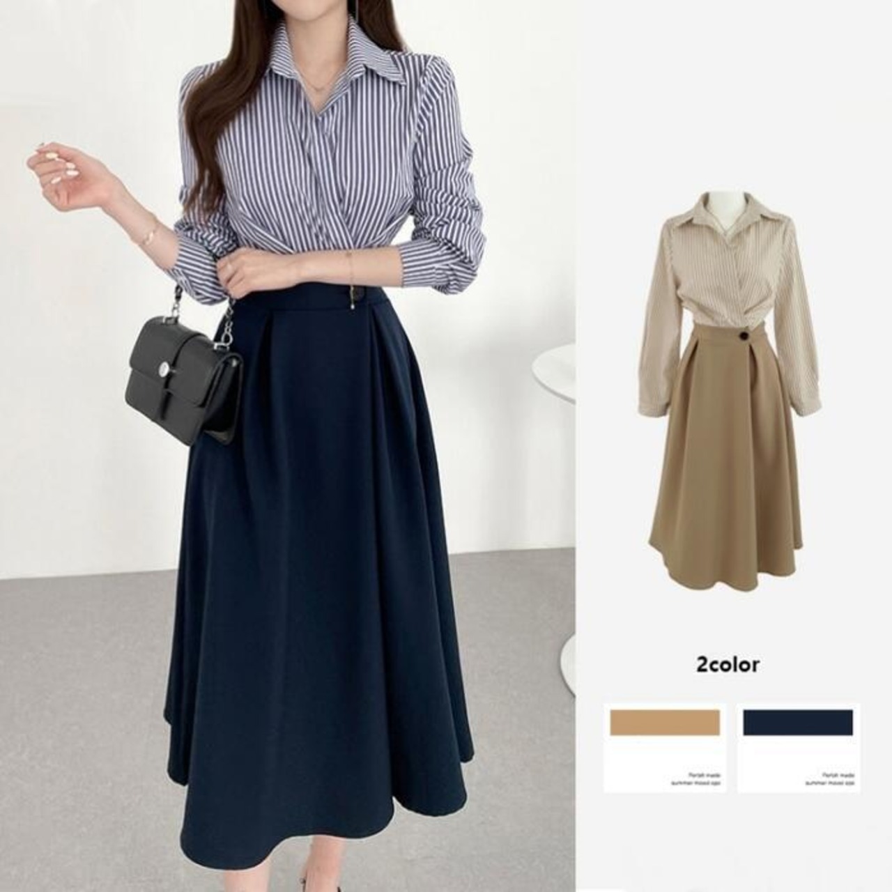 全2色 ワンピース ロングワンピ セパレート風 袖あり シャツワンピ ストライプ レディース きれいめ カジュアル ミモレ丈 長袖 おしゃれ 大人 可愛い ワンピ ドレス フェミニン Aライン 通勤 ブルー 青 ベージュ 春 秋 冬 20代 30代 40代 50代