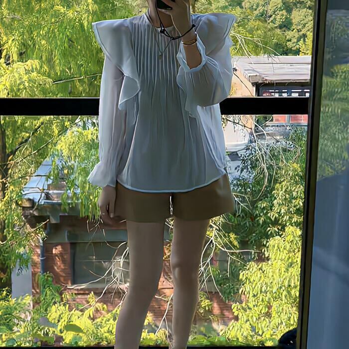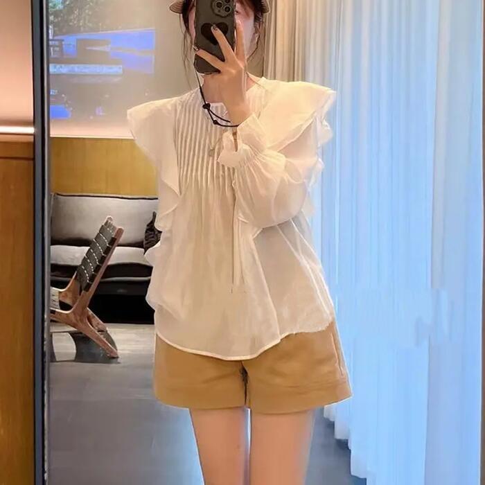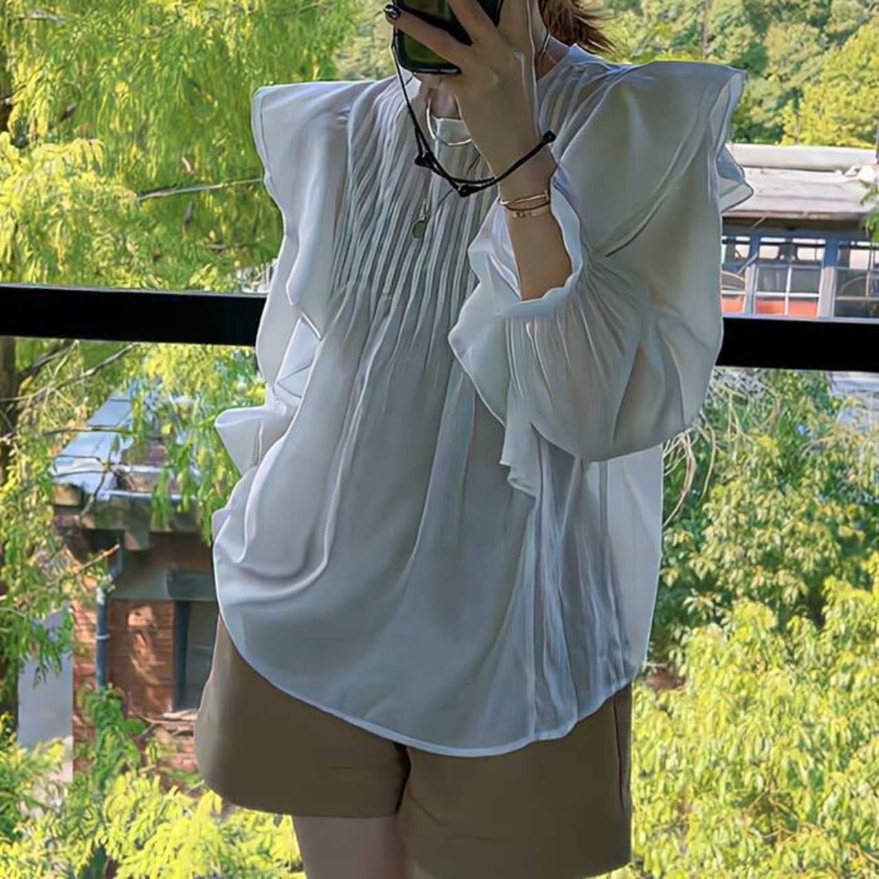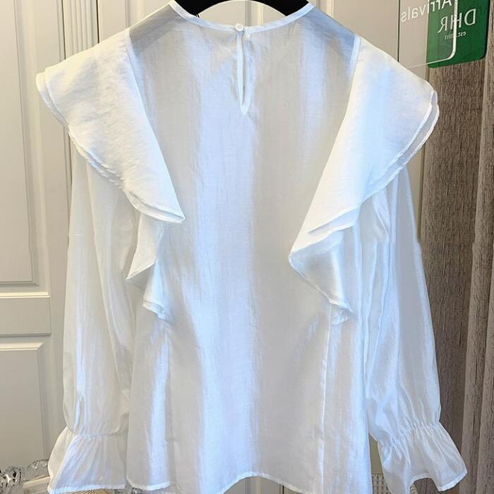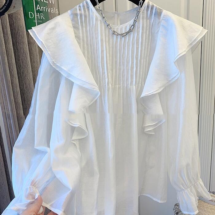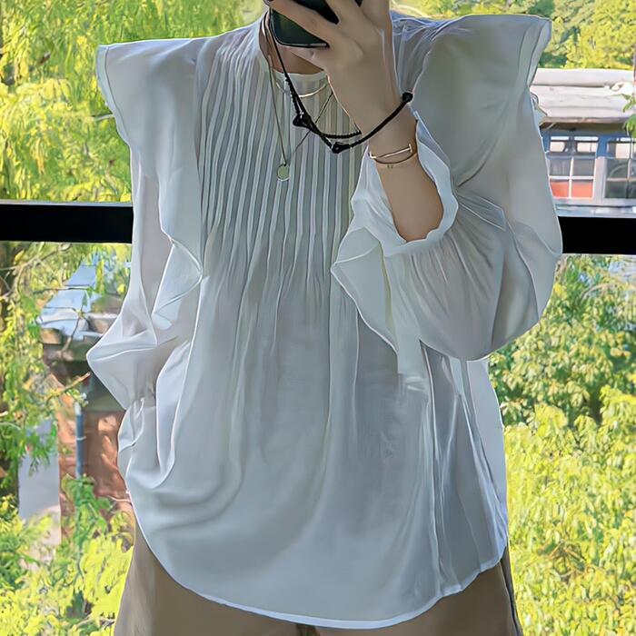 トップス ブラウス シャツ ラッフル フリル きれいめ カジュアル おしゃれ 可愛い フェミニン 長袖 ゆったり プルオーバー 薄手 シンプル 大きいサイズ ナチュラル ホワイト 白 春 夏 秋 20代 30代 40代 50代