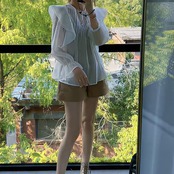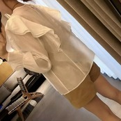 ラッフルデザインが顔まわりを華やかに、肩を華奢に見せてくれます。