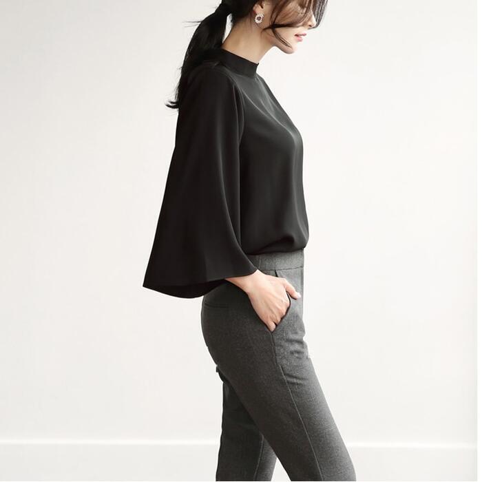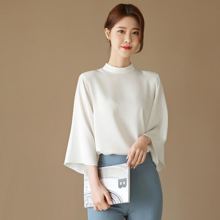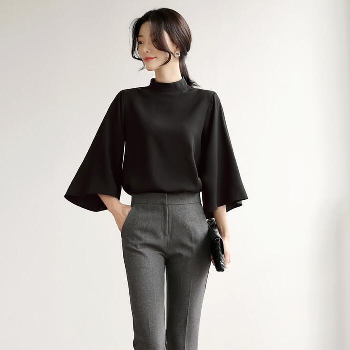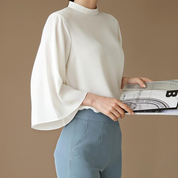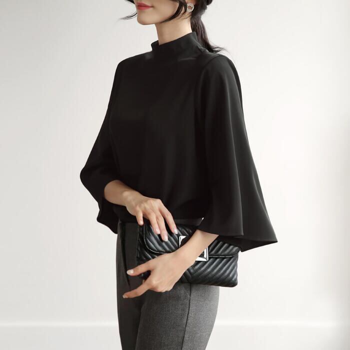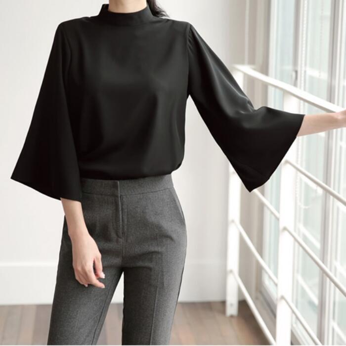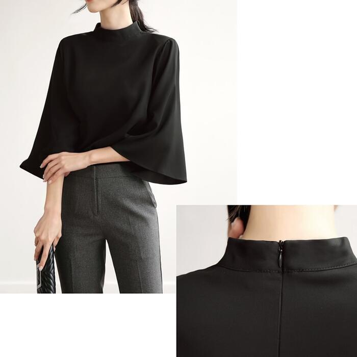 全2色 トップス ブラウス シャツ フレアスリーブ ハイネック エレガント きれいめ カジュアル おしゃれ 可愛い フェミニン 七分袖 ゆったり プルオーバー シンプル ナチュラル ブラック 黒 ホワイト 白 春 冬 秋 20代 30代 40代 50代