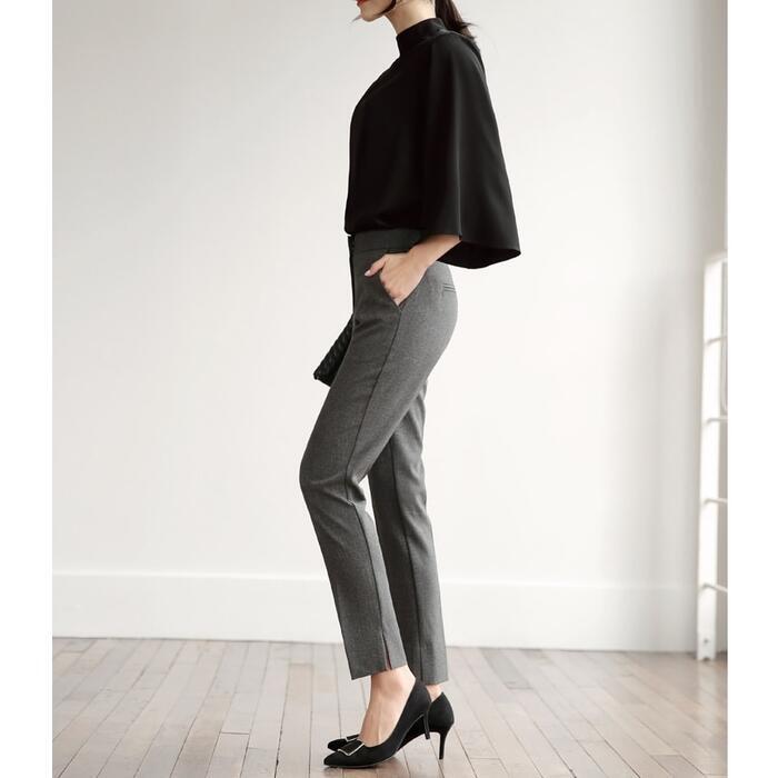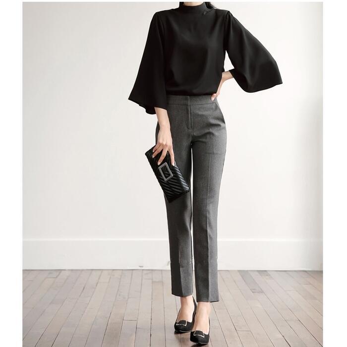 ひらひらと軽やかな袖とハイネックデザインで、華やかさのある仕上がりに。