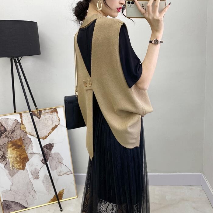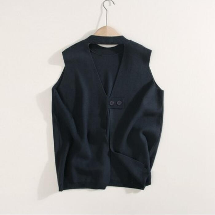 オープンになったバックスタイルが抜け感を演出するニットベスト。