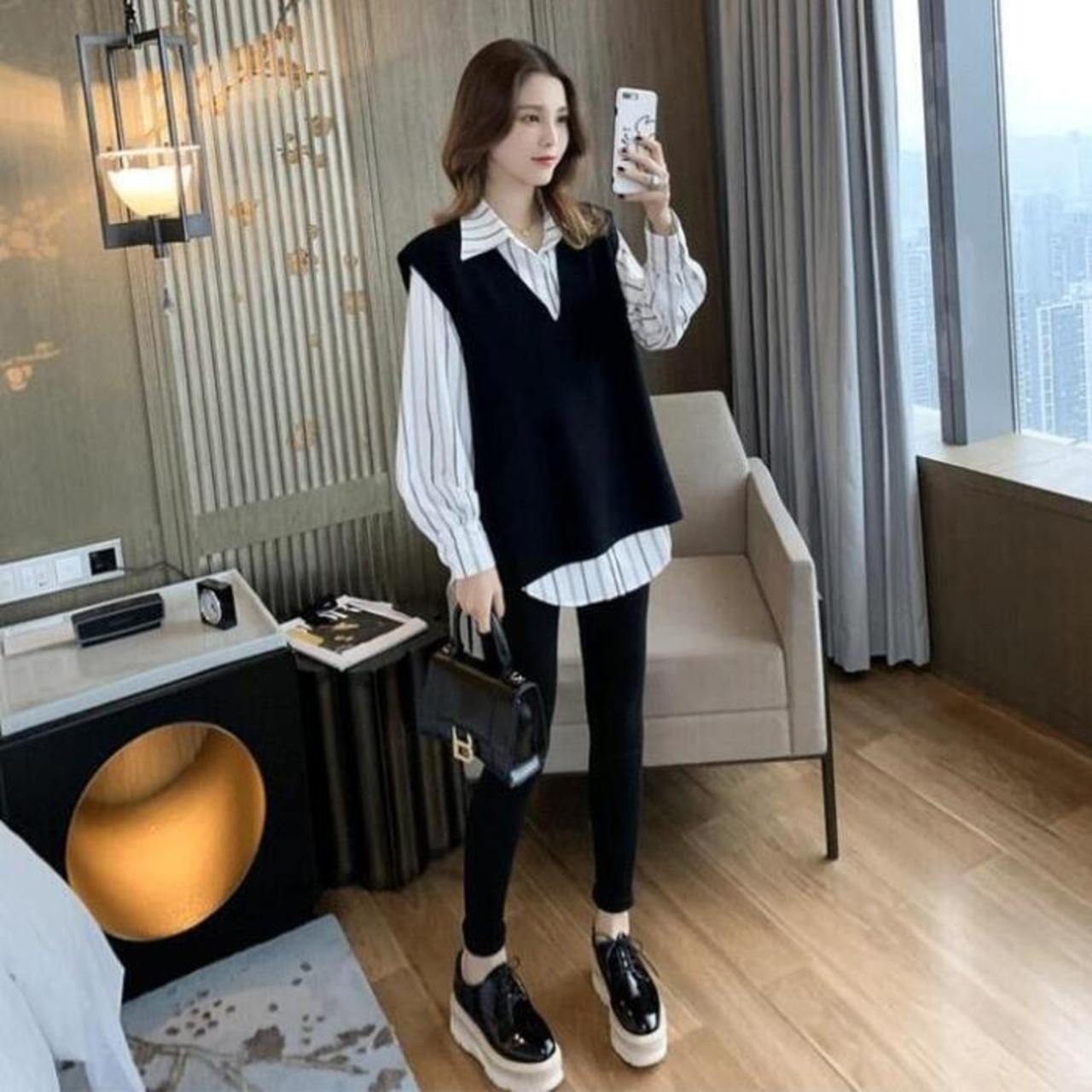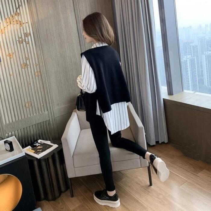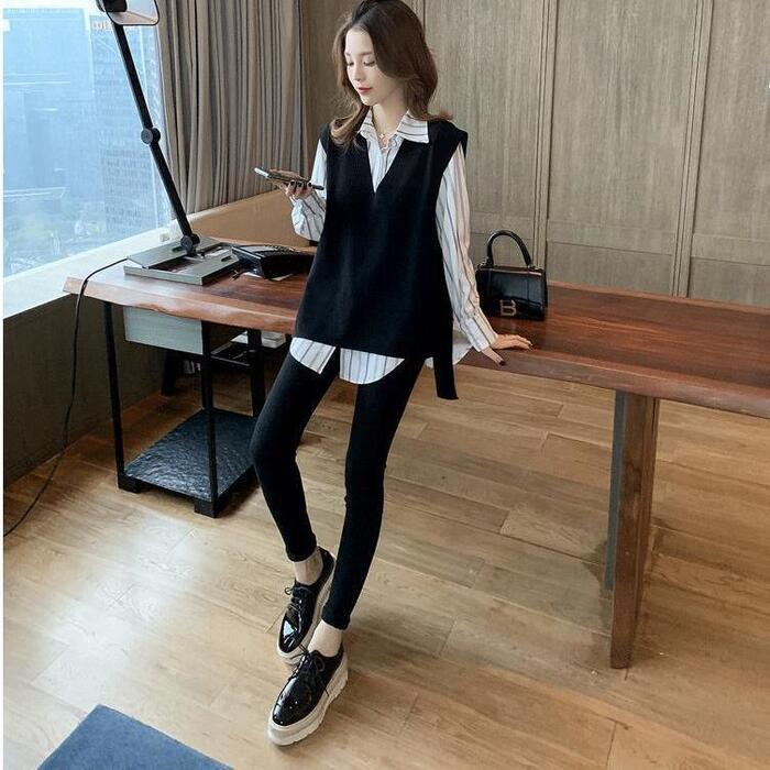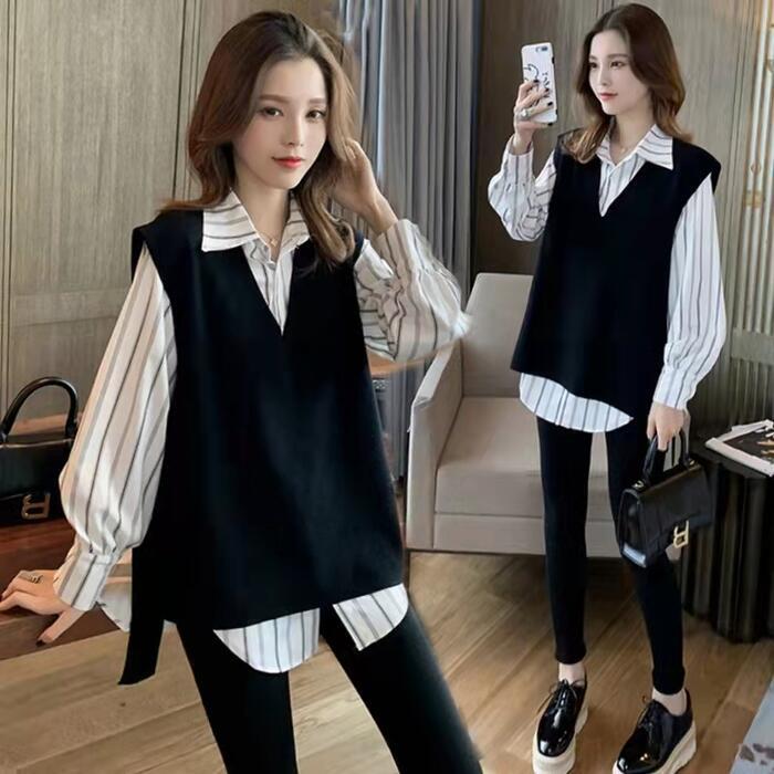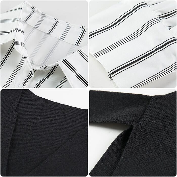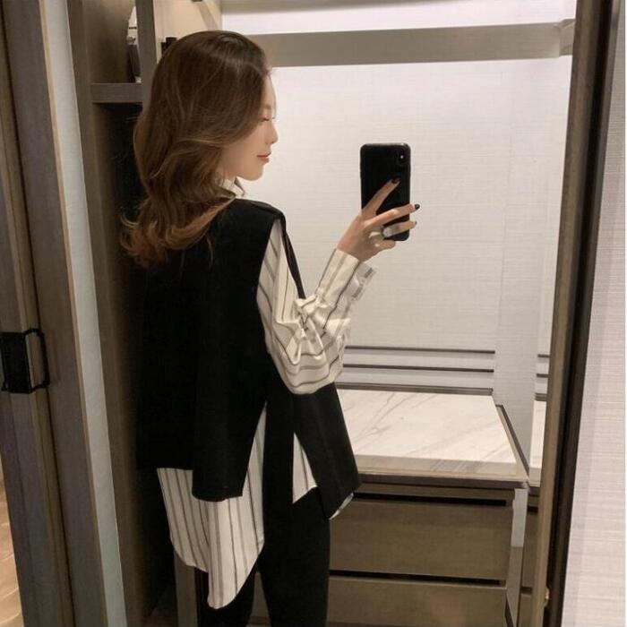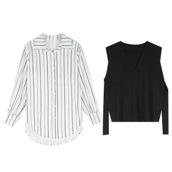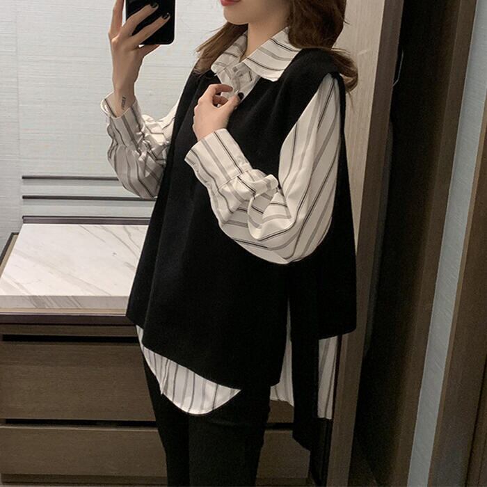 大きいサイズレイヤード セットアップ 2点セット アンサンブル シャツ ベスト ストライプ レディース カジュアル きれいめ 長袖 おしゃれ ブラウス ニット フェミニン 重ね着 体型カバー ホワイト 白 ブラック 黒 春 秋 冬 20代 30代 40代 50代