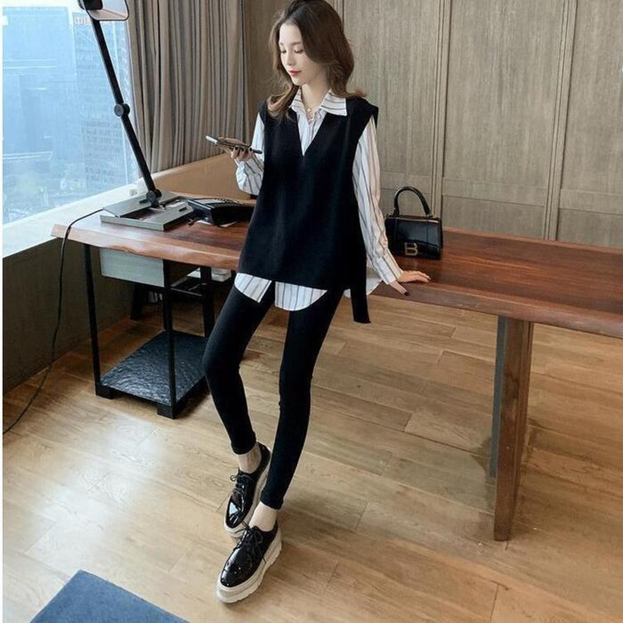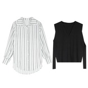 ストライプ柄シャツ&ベストのアンサンブル。