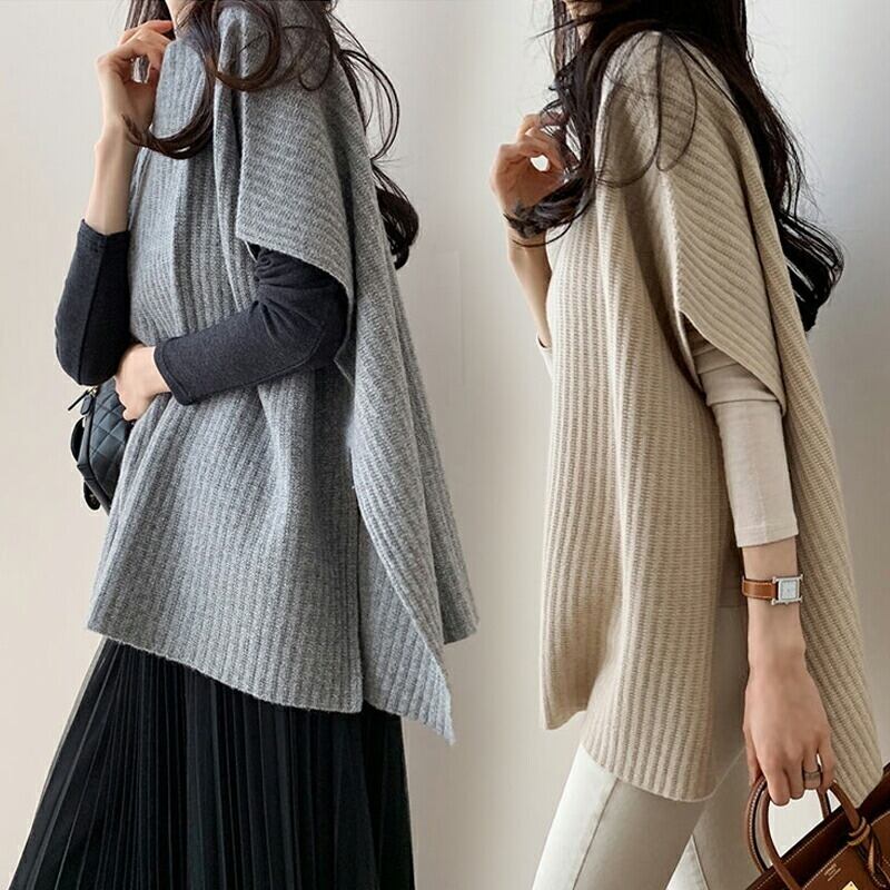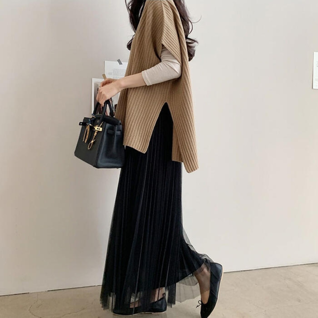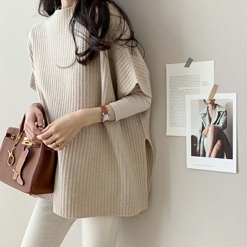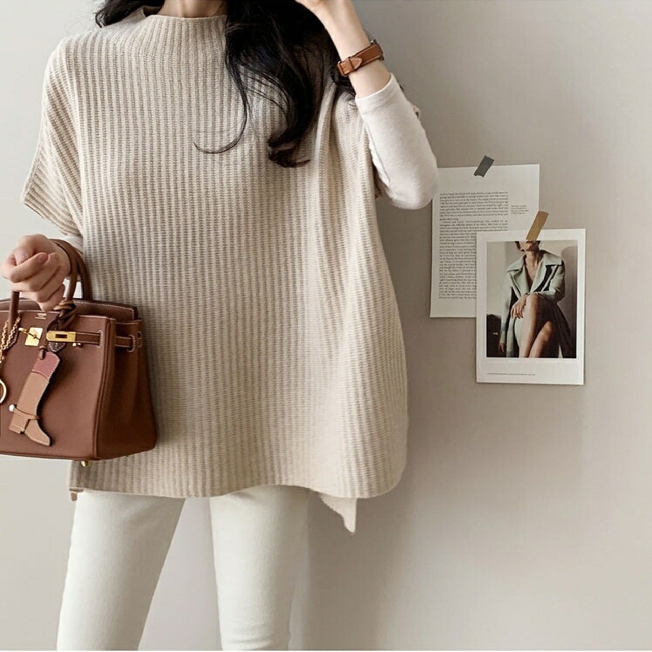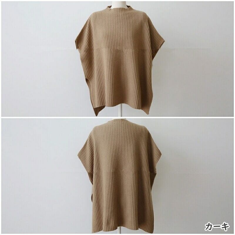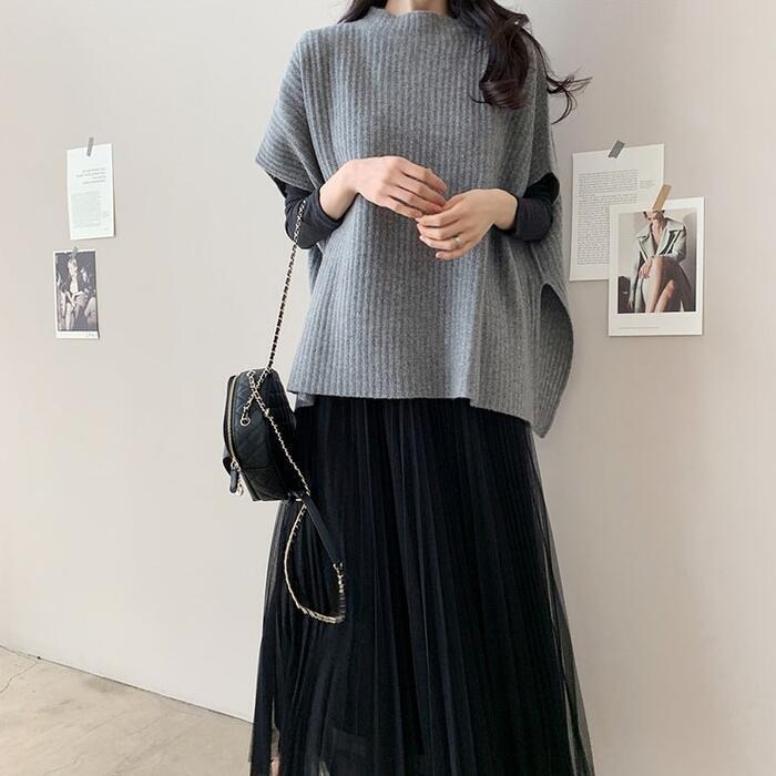 全3色 トップス レディース ニット ベスト レイヤード カットソー 半袖 きれいめ カジュアル おしゃれ ゆったり 体型カバー モックネック こなれ感 シンプル リラックス ナチュラル ベージュ グレー 秋 春 冬 20代 30代 40代 50代